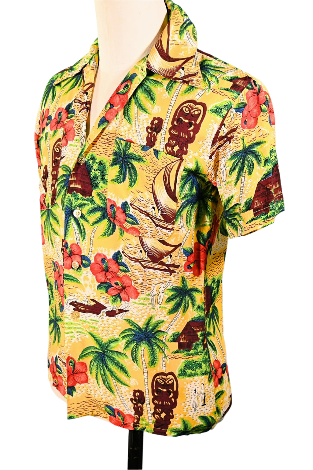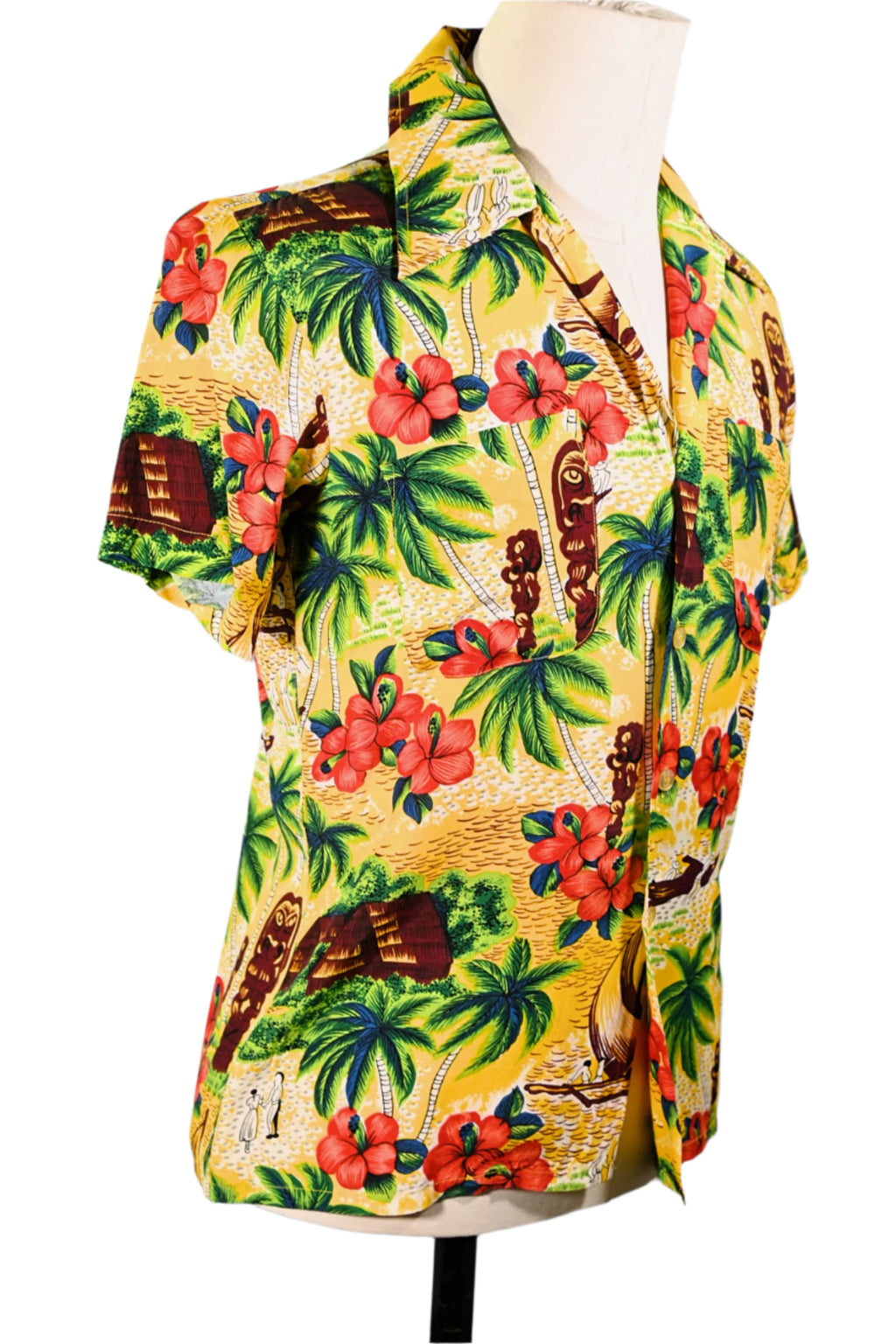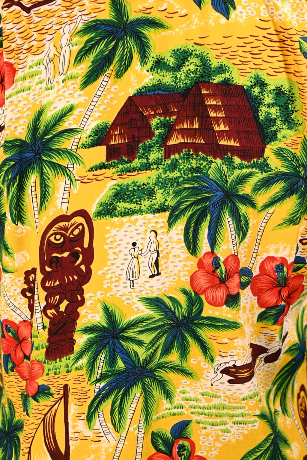 Printed with Tikis and Polynesian style patterns, flowers and people.