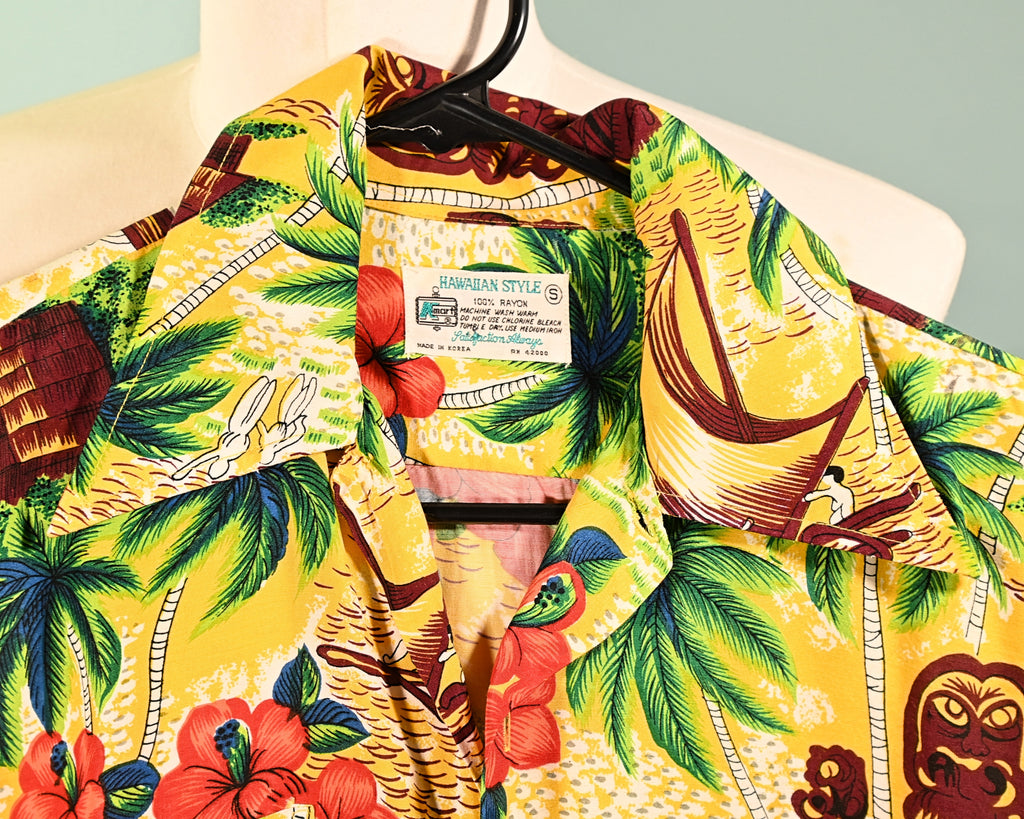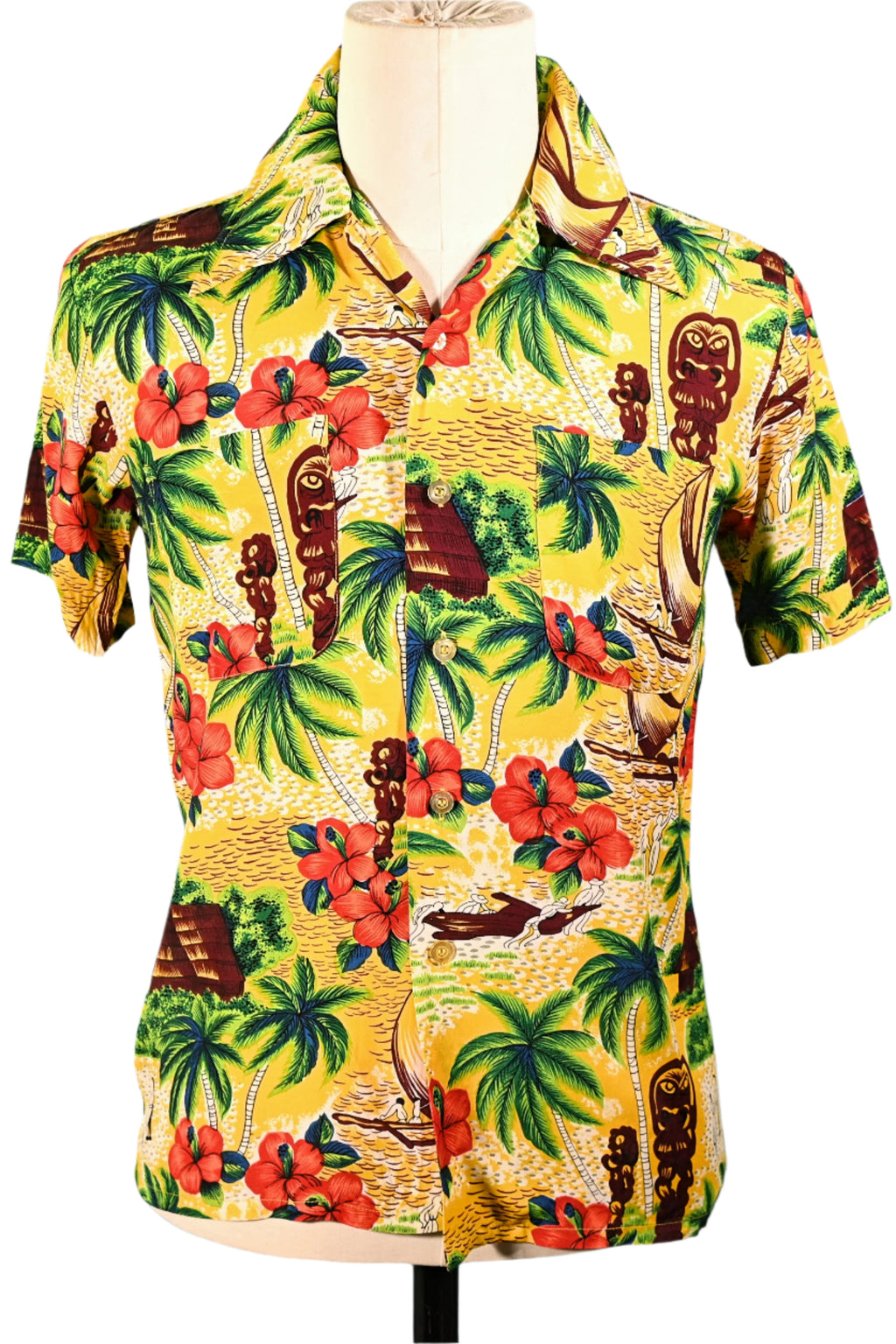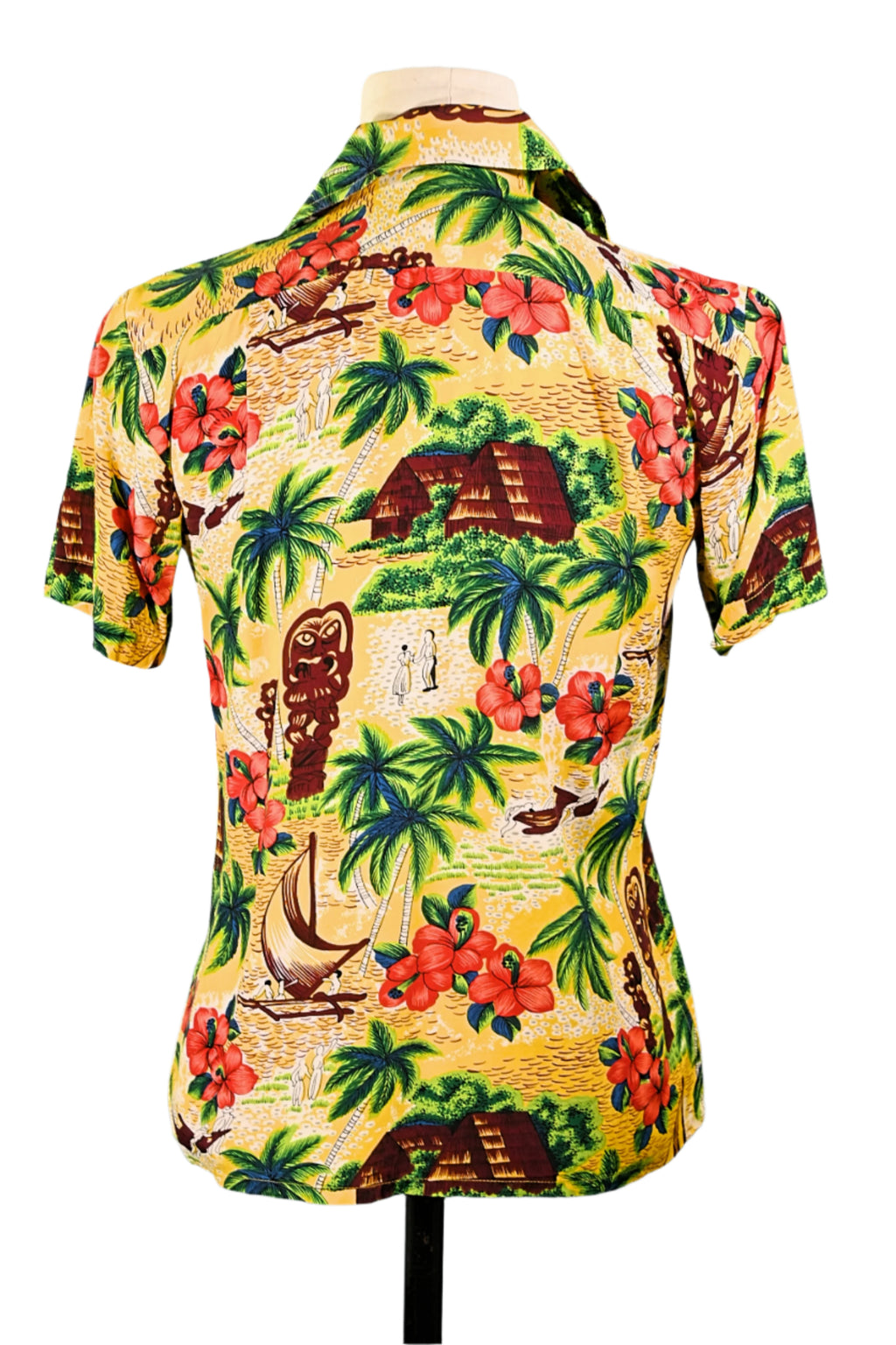 Printed with Tikis and Polynesian style patterns, flowers and people.