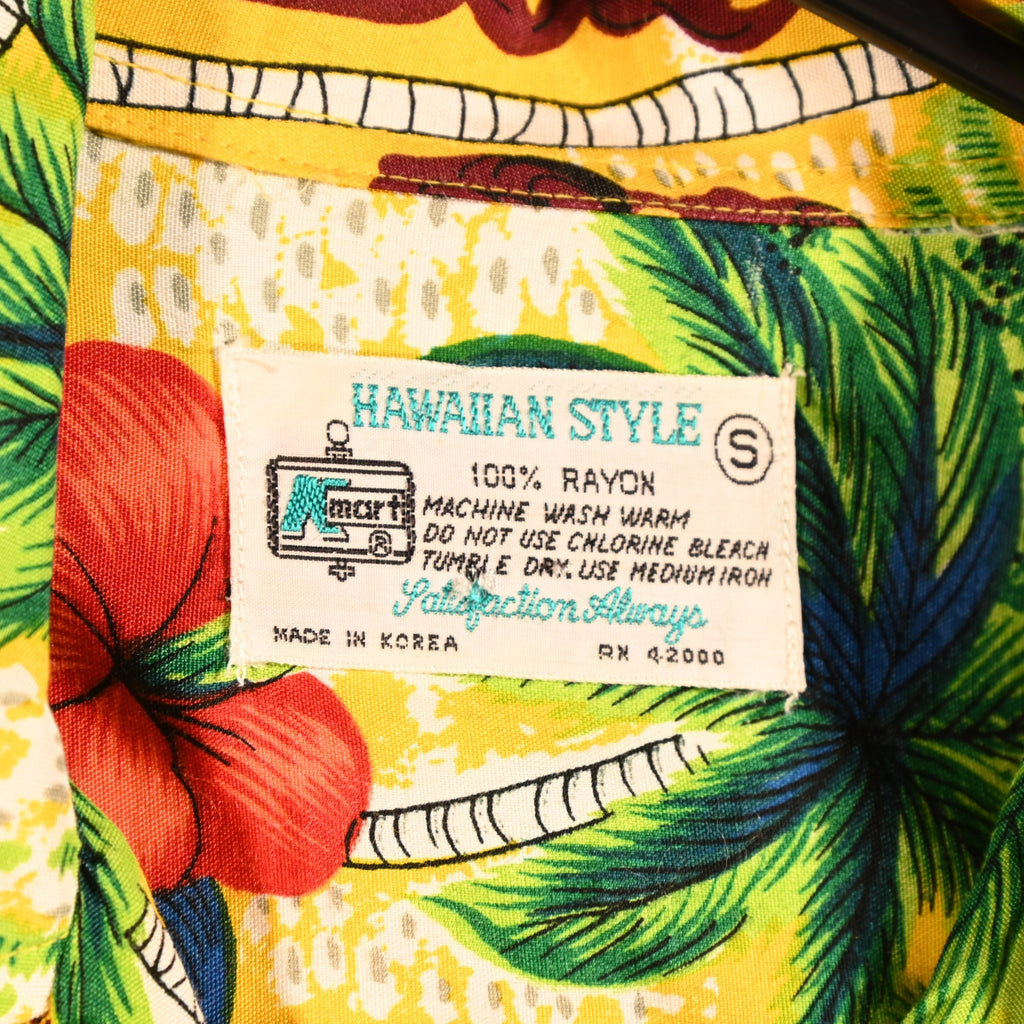 Bright and colorful, yellow, brown, green, red + more. Pointed collar, patch pocket.