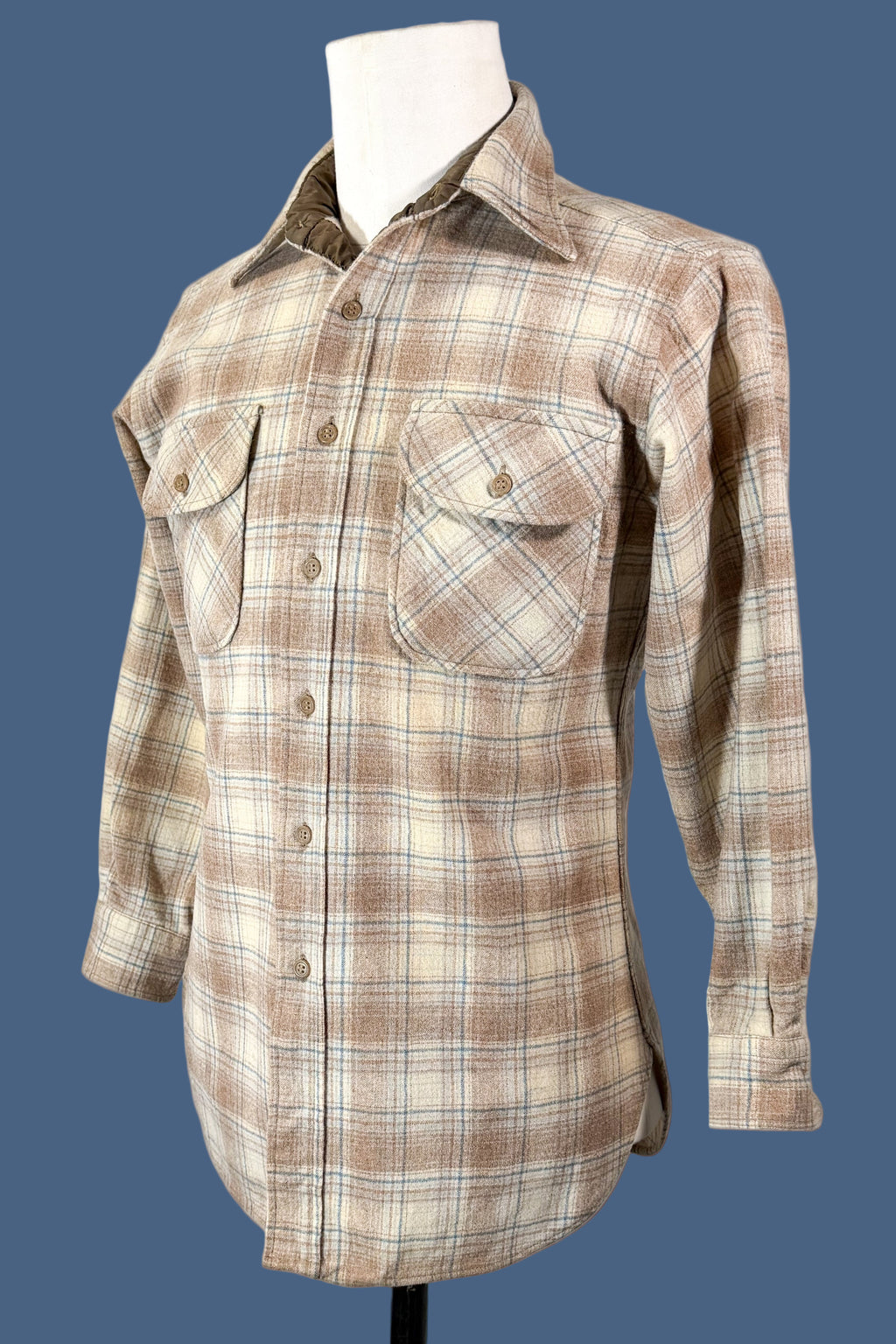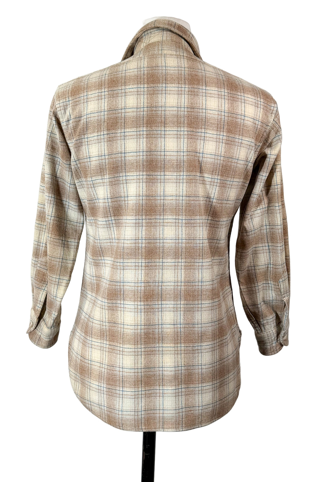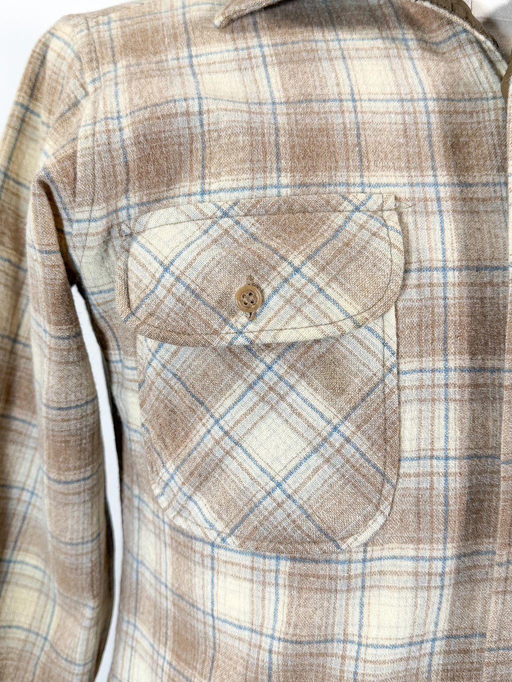Light tan Pendleton wool plaid shirt with button patch pockets.