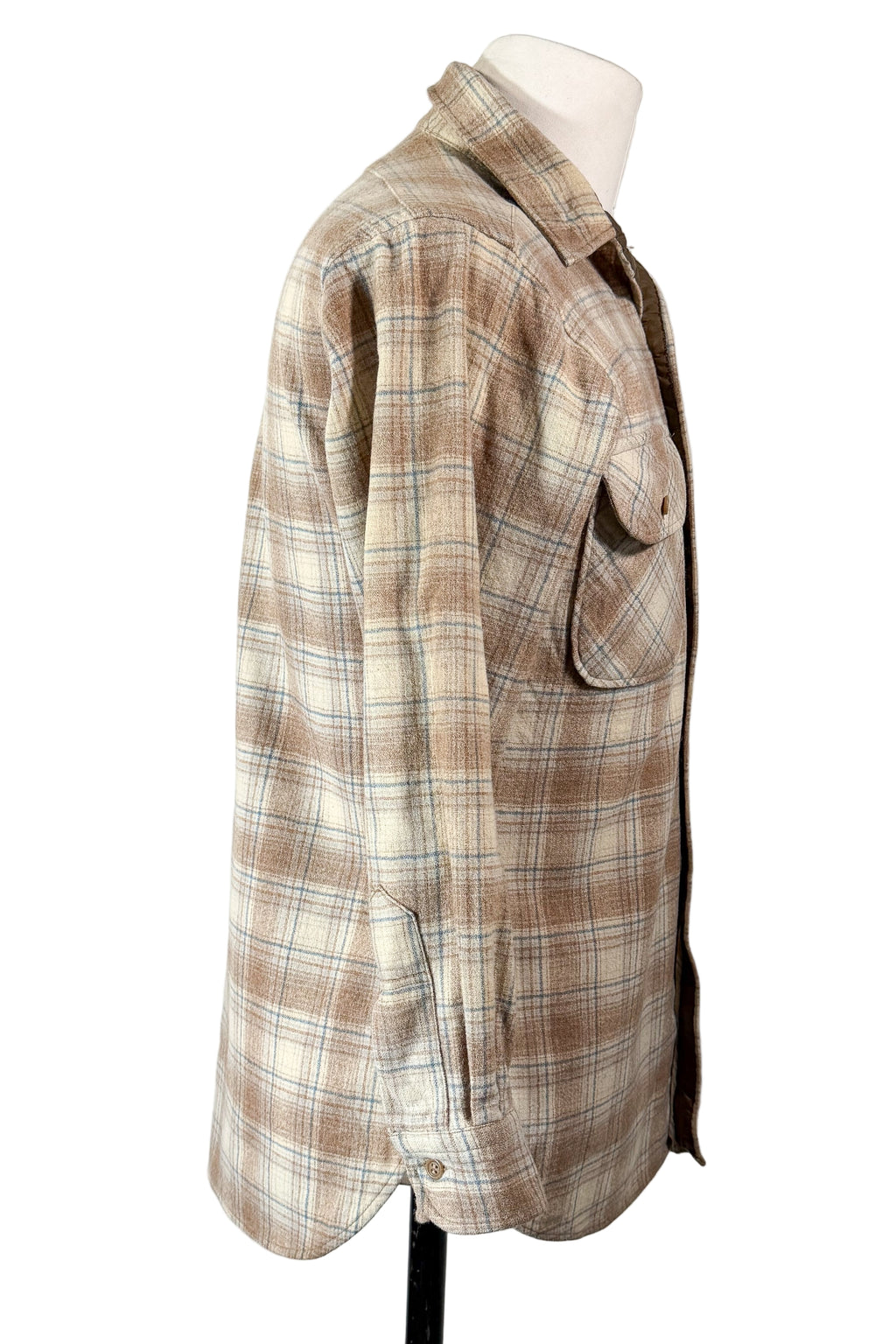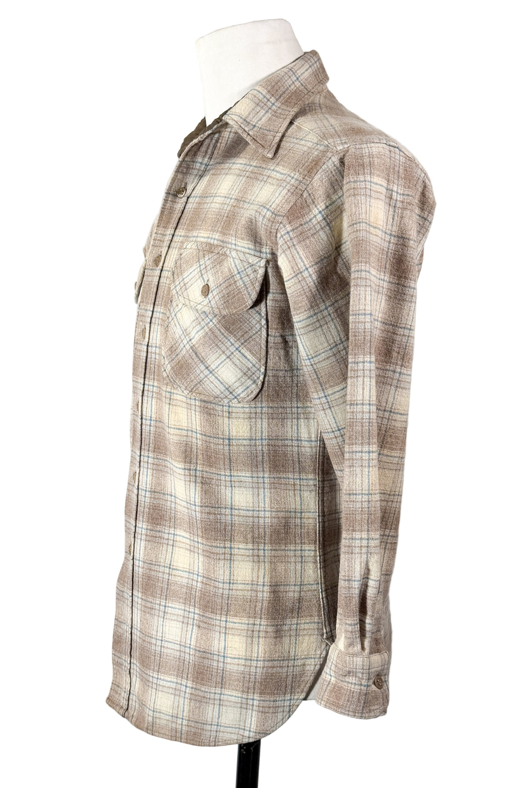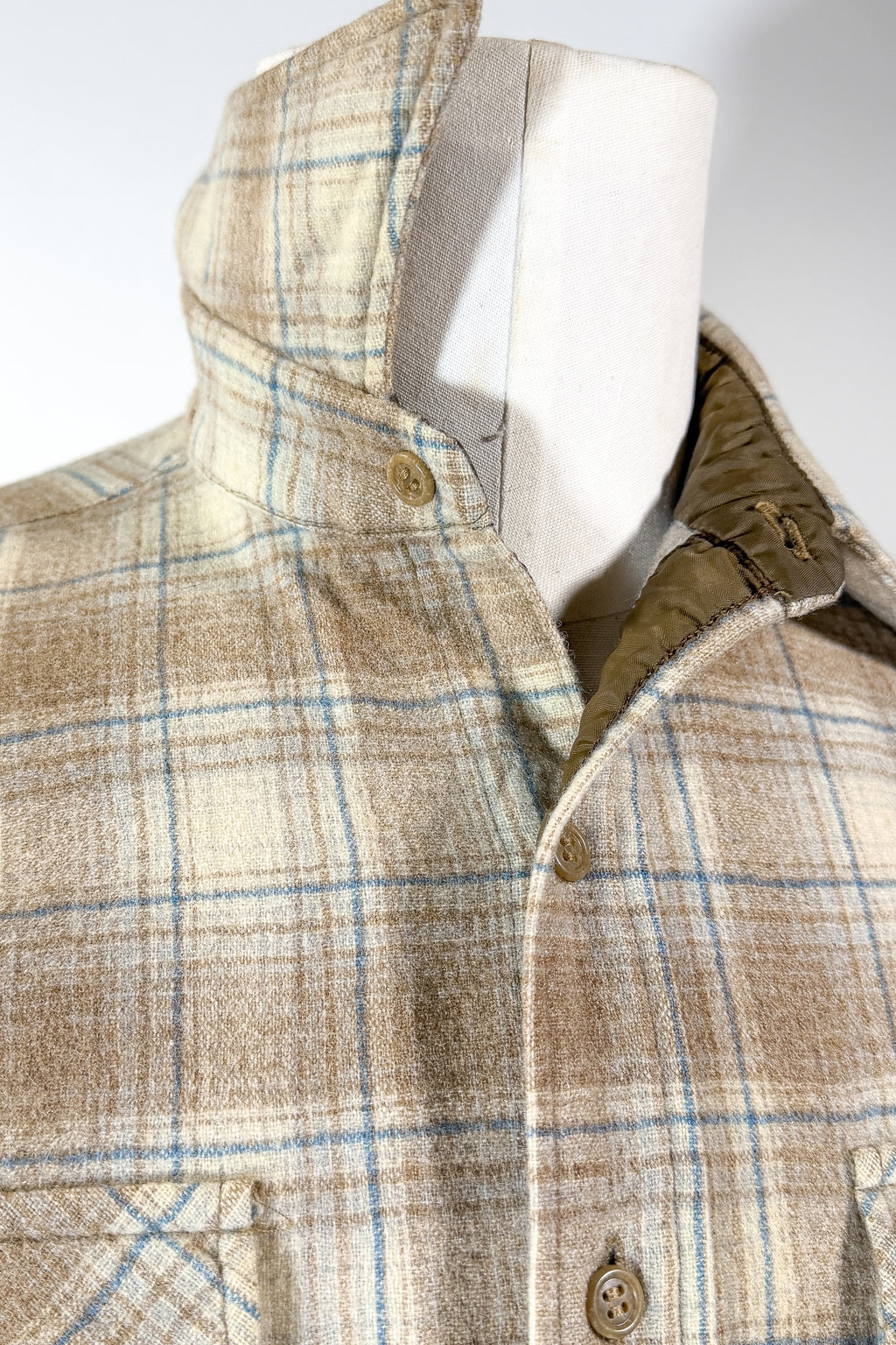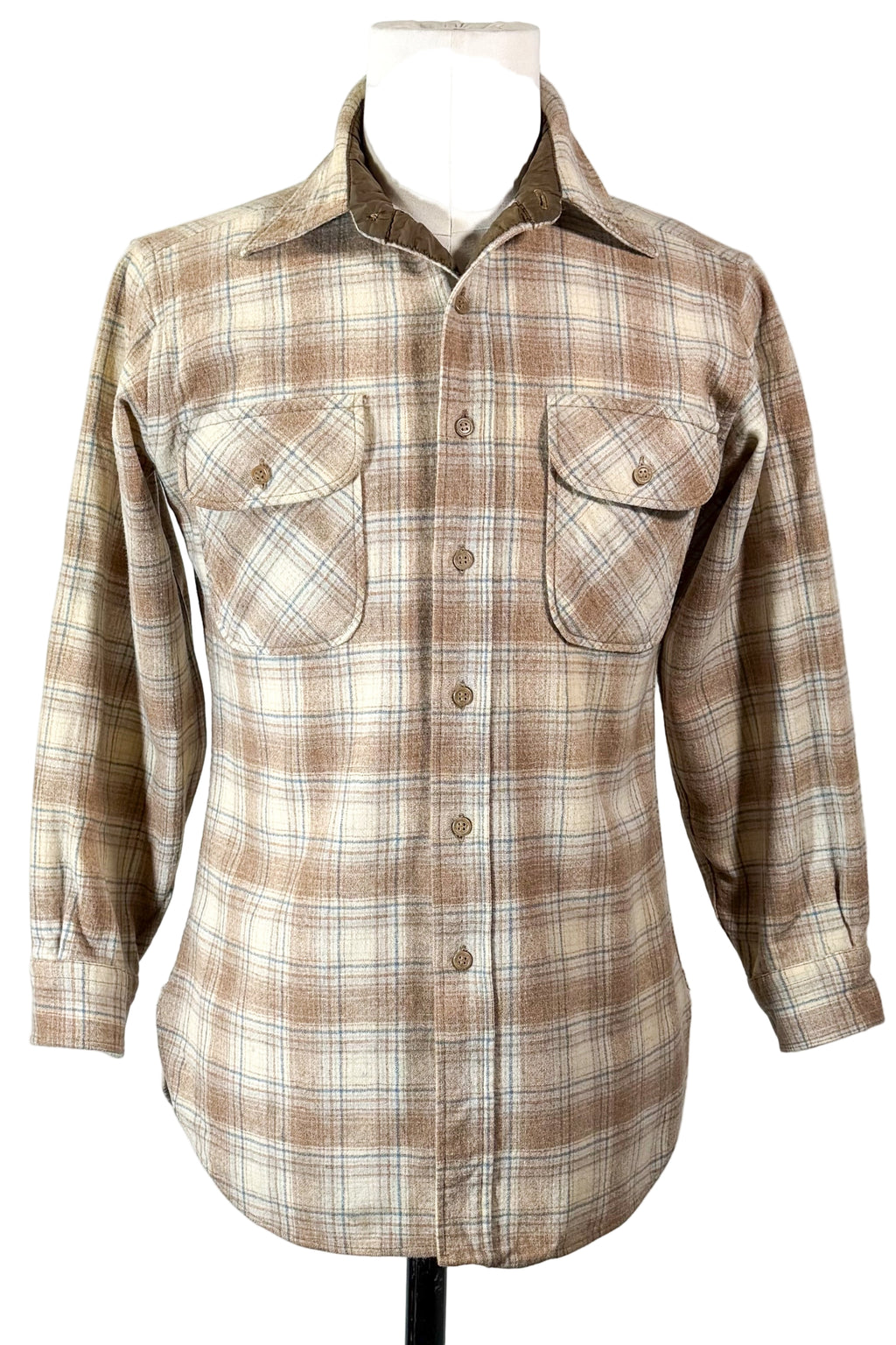 Light tan Pendleton wool plaid shirt with button patch pockets.
