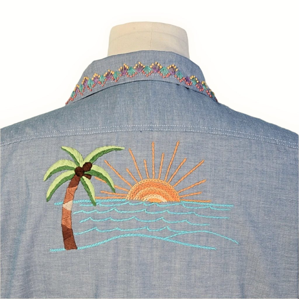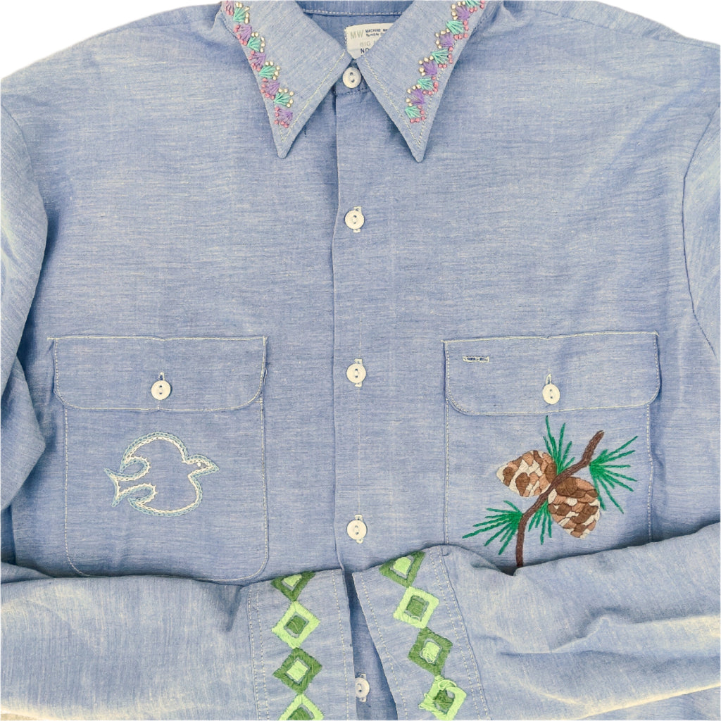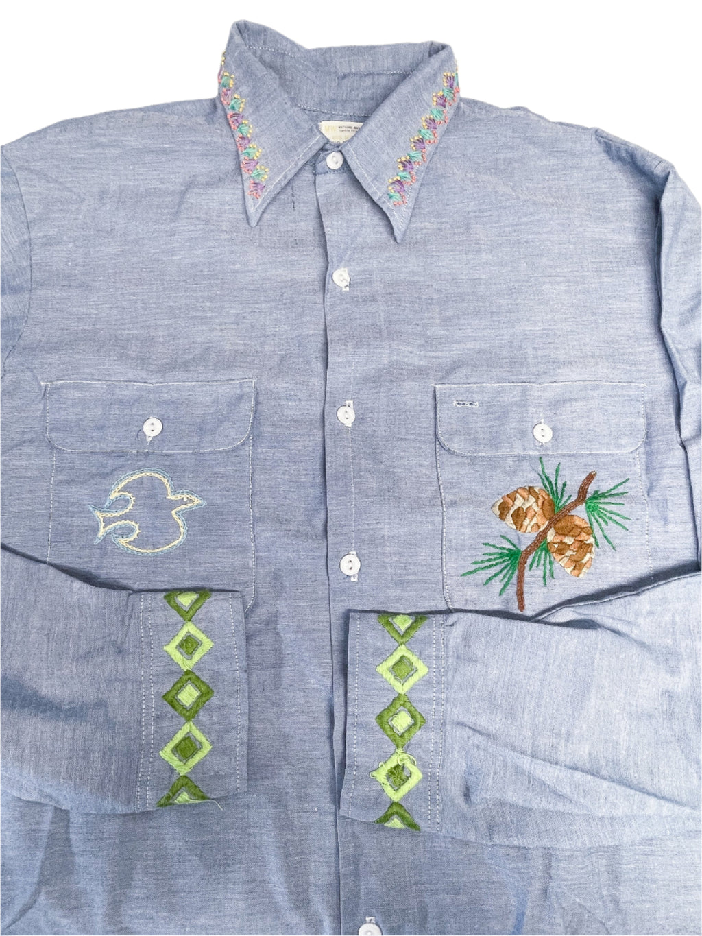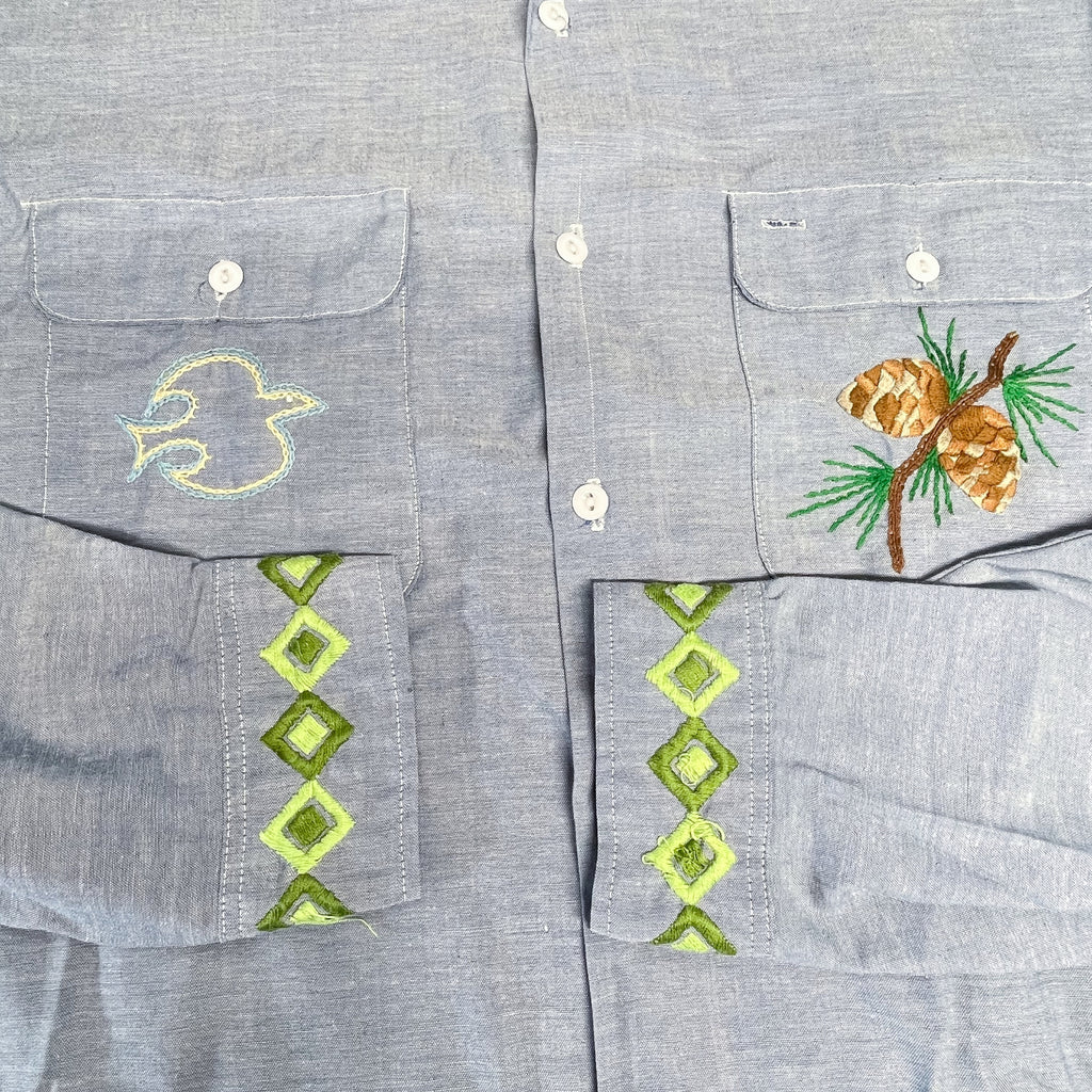 Vintage JC Penny chambray shirt with hand embroidered pinecones, sunrise, palm tree, geometric designs.