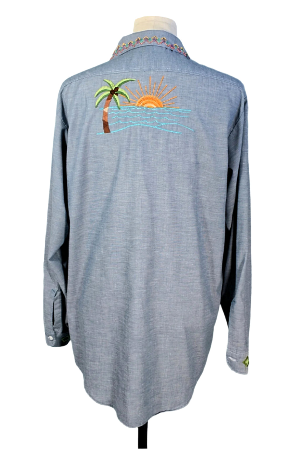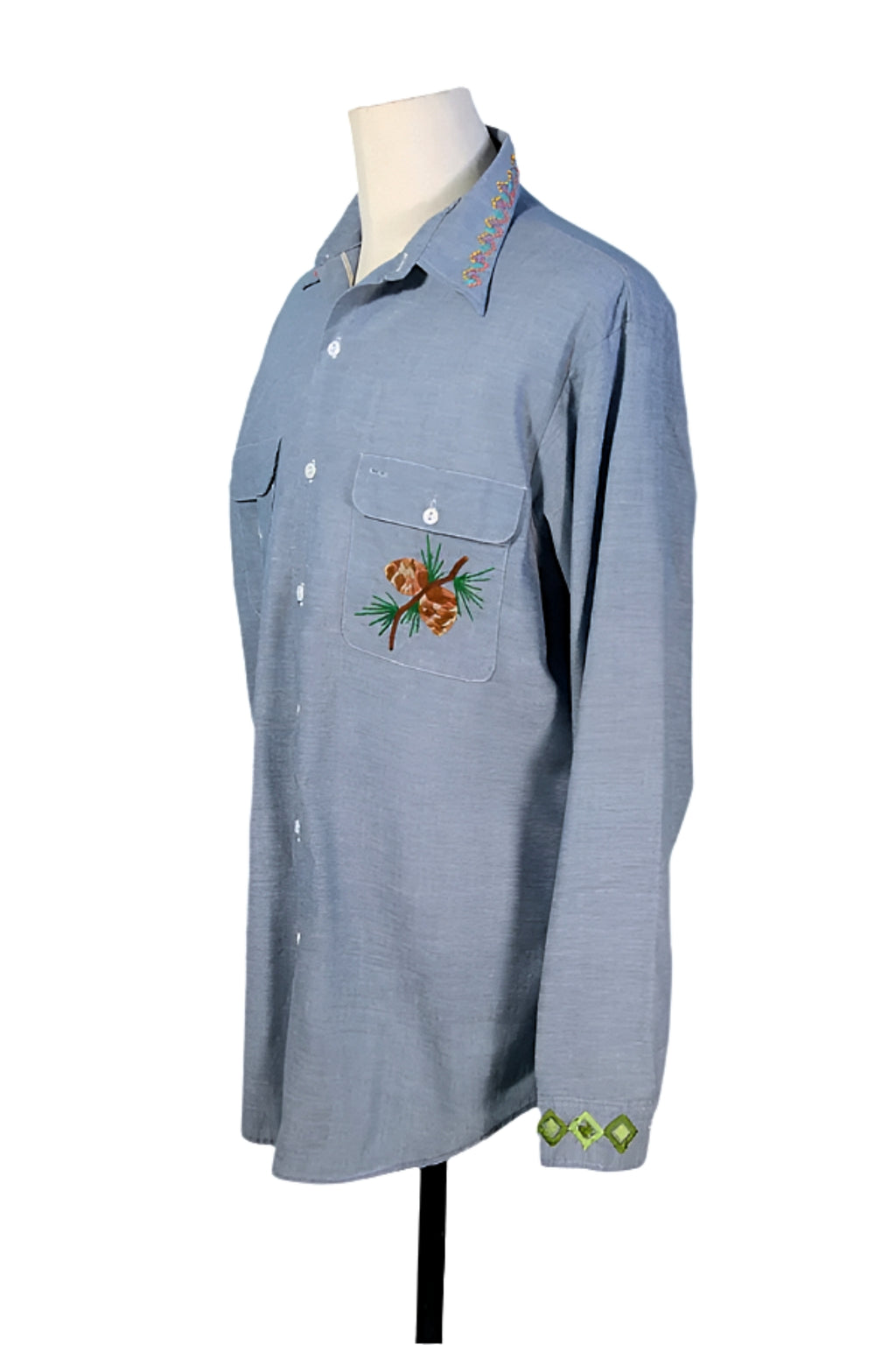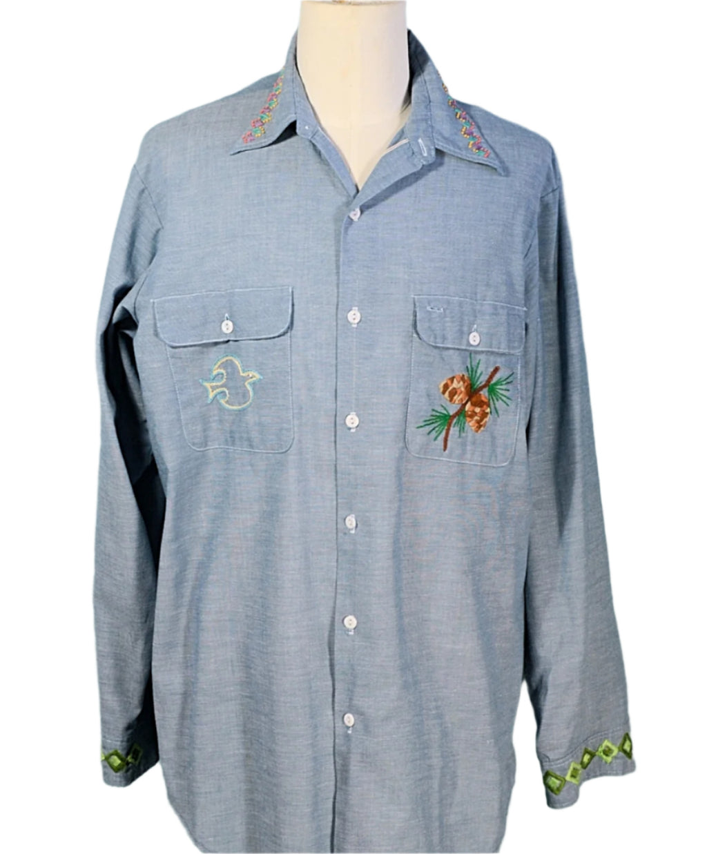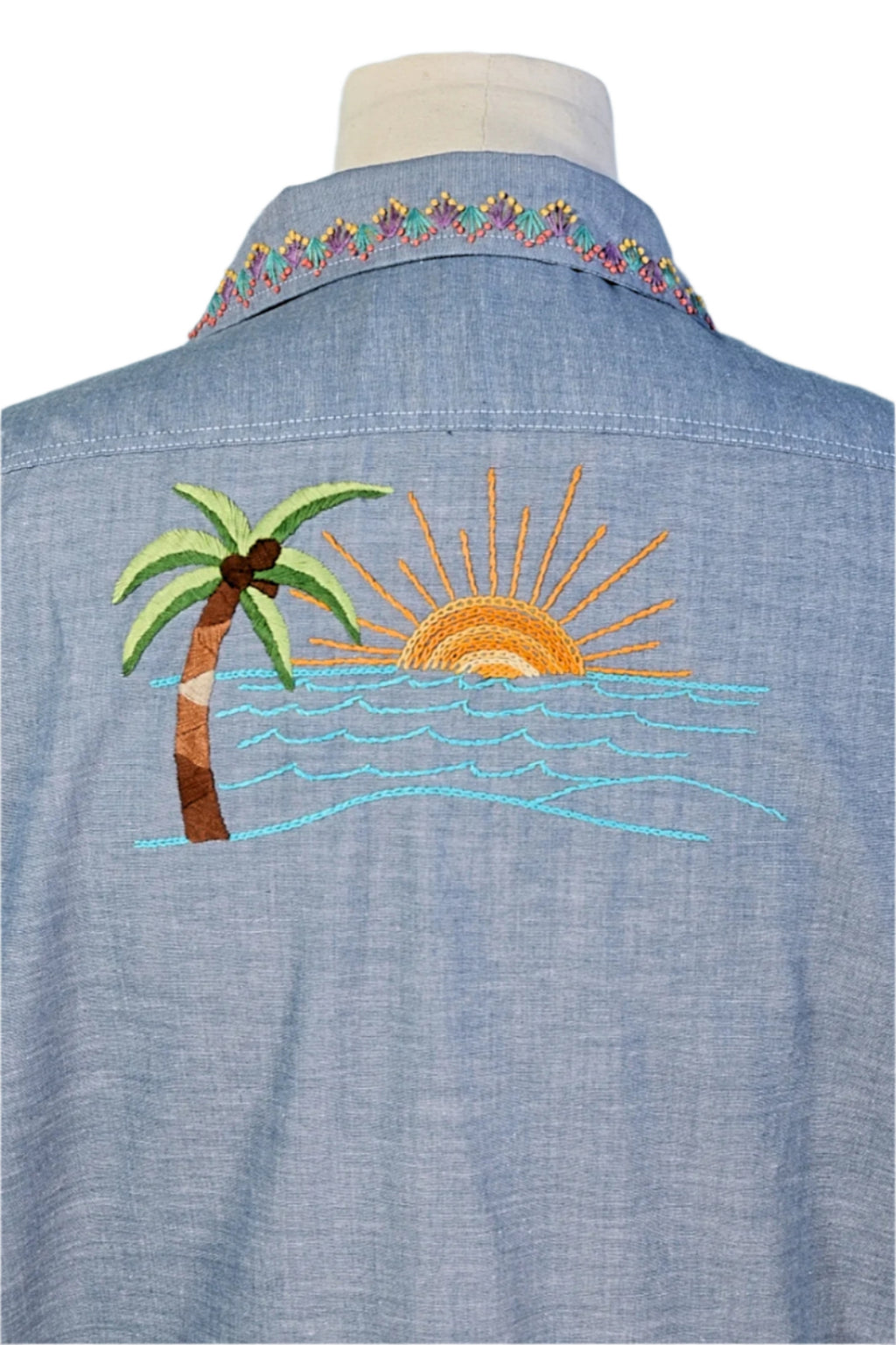Vintage JC Penny chambray shirt with hand embroidered pinecones, sunrise, palm tree, geometric designs.