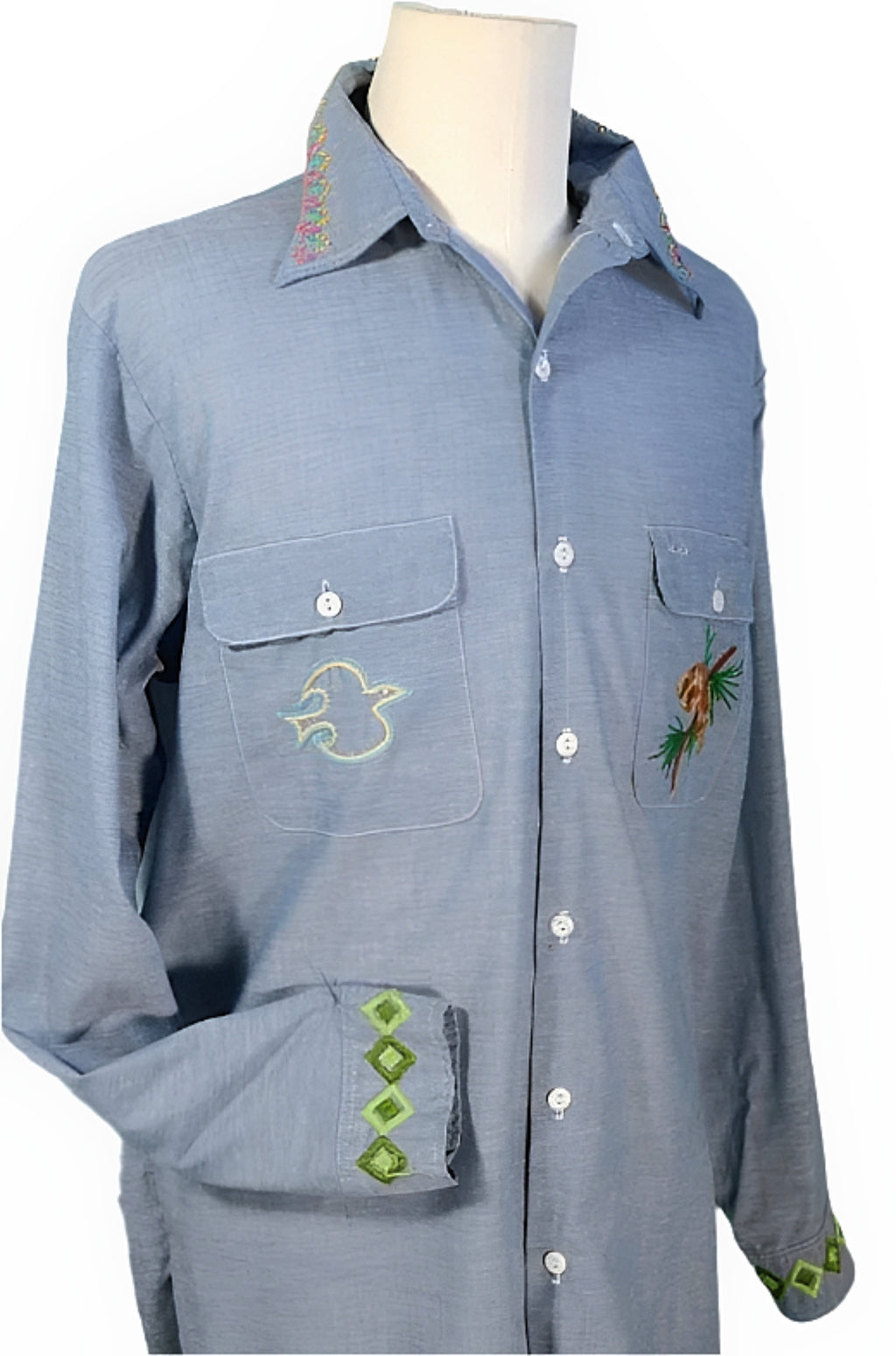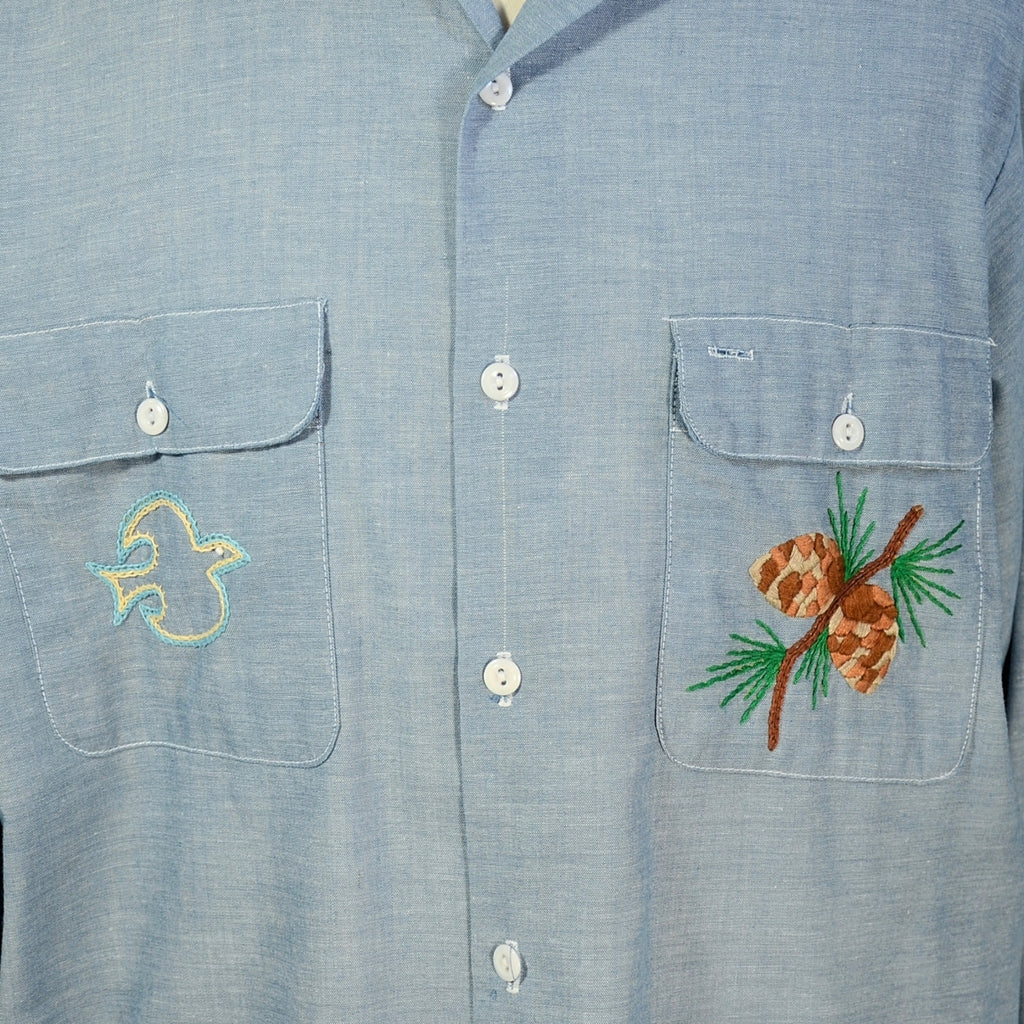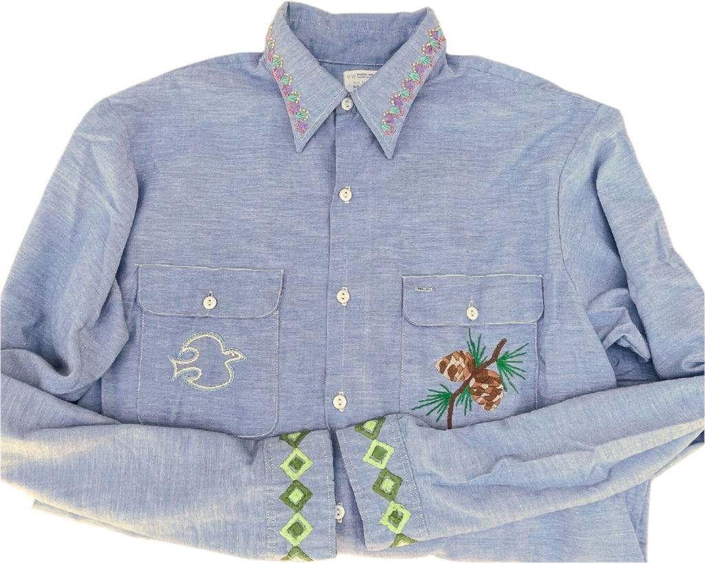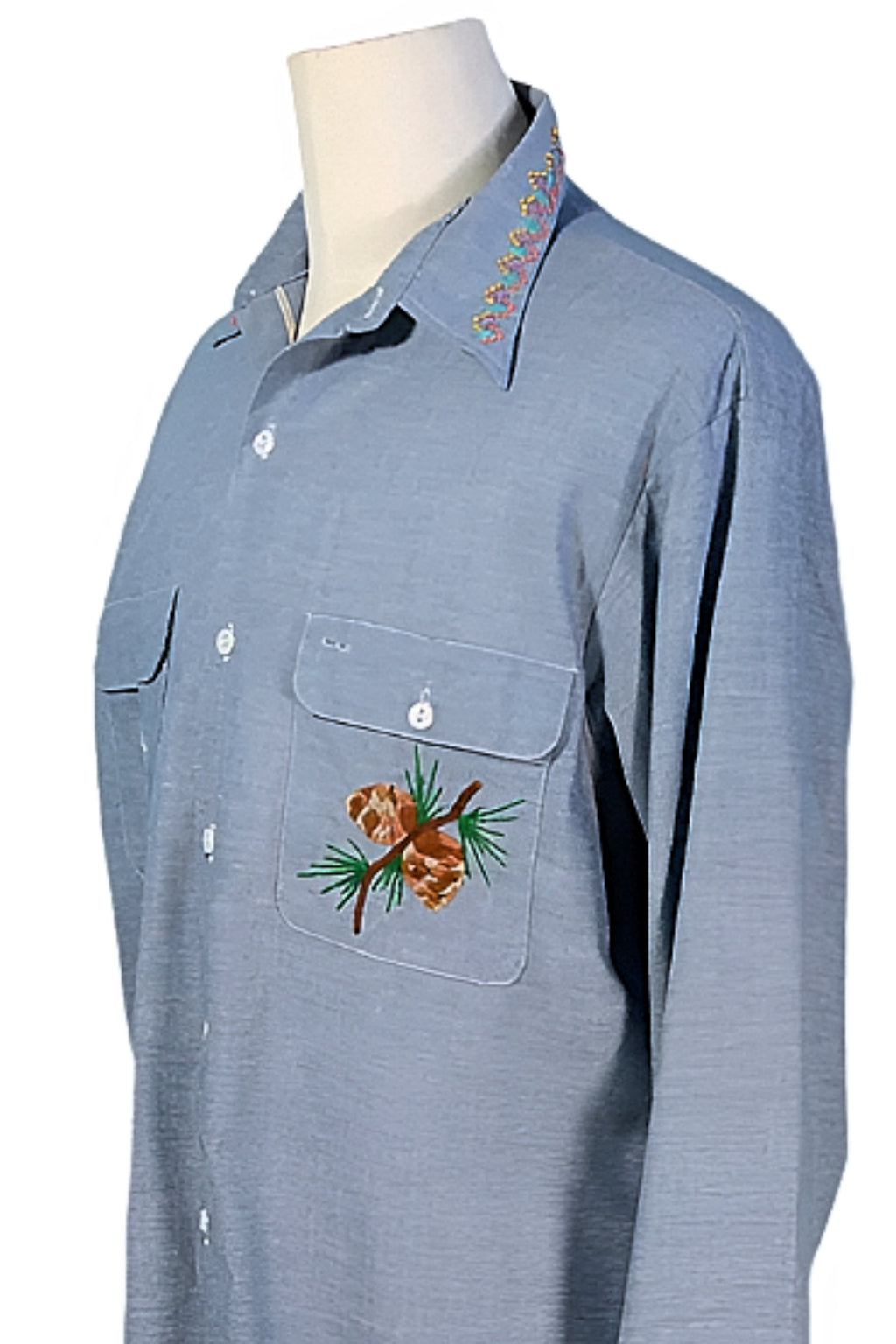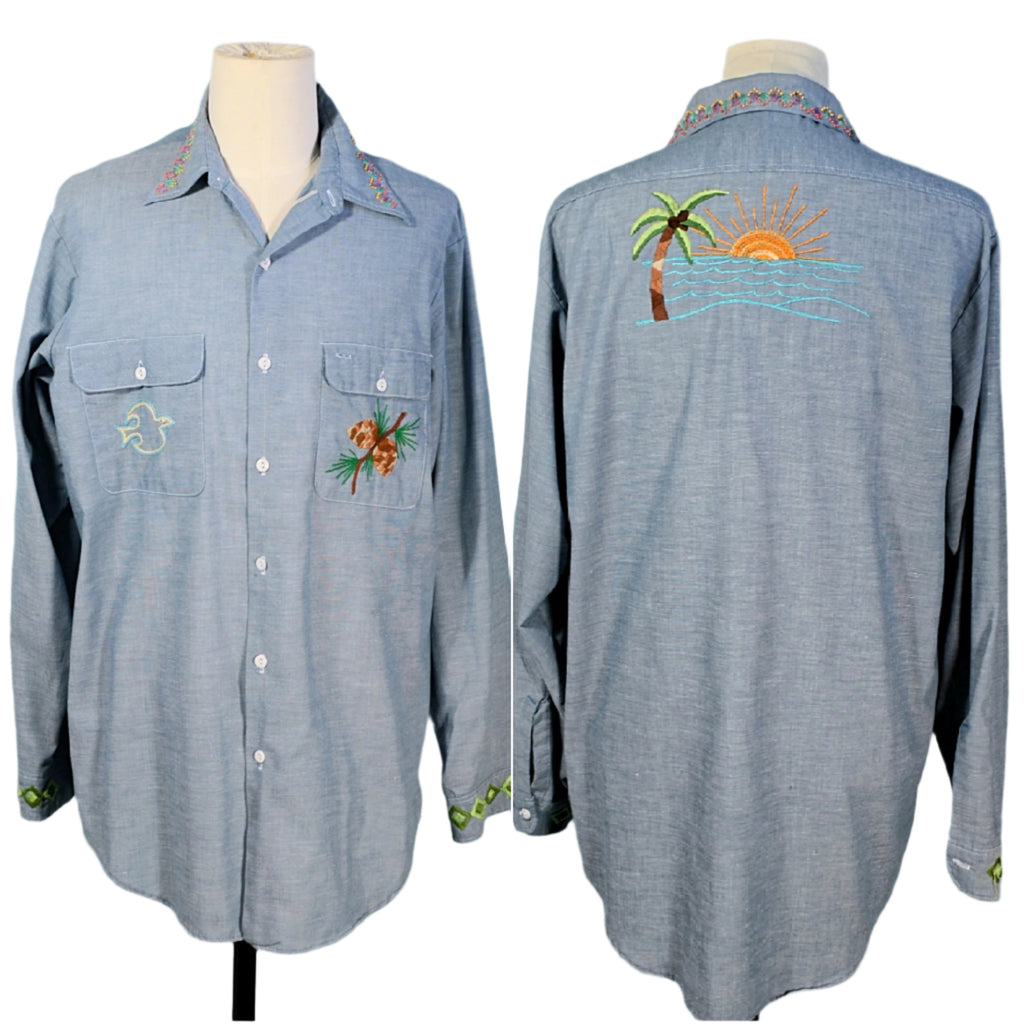 Vintage JC Penny chambray shirt with hand embroidered pinecones, sunrise, palm tree, geometric designs.