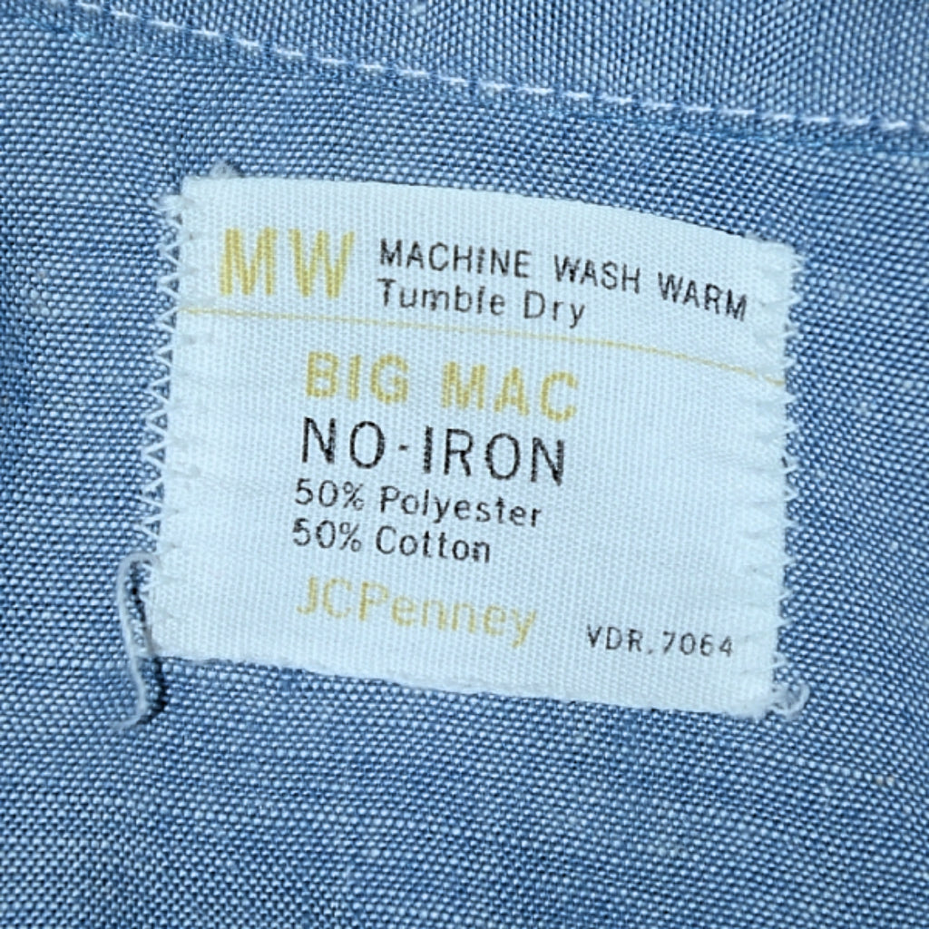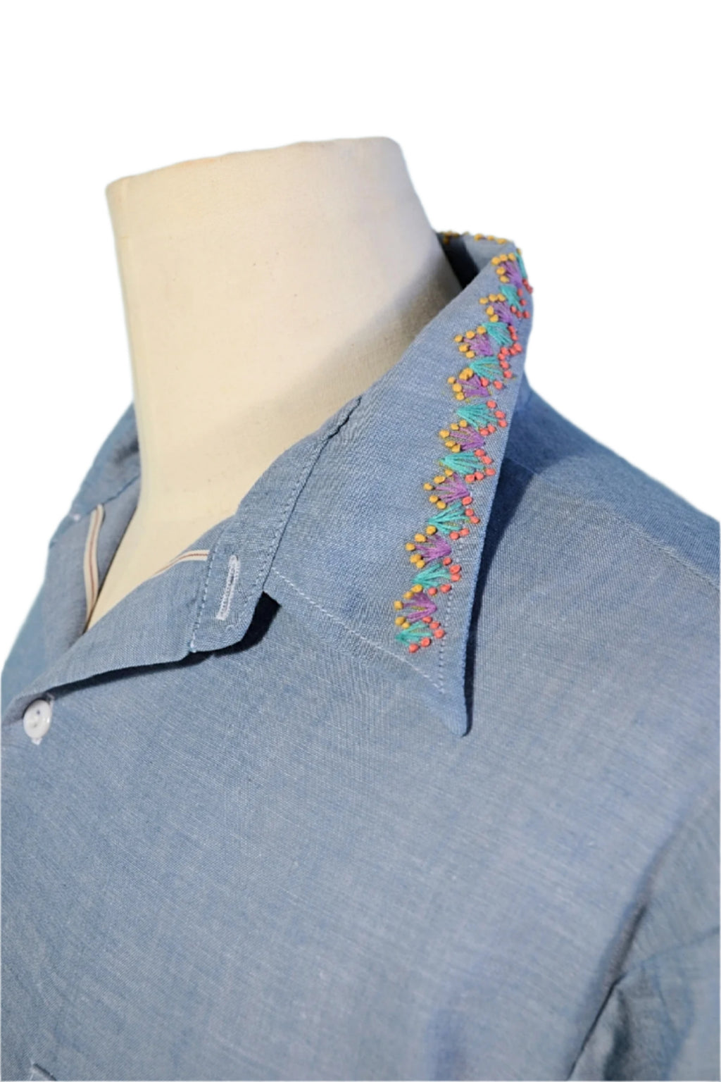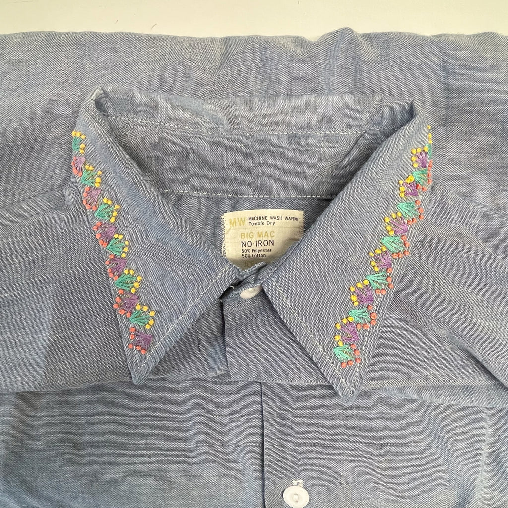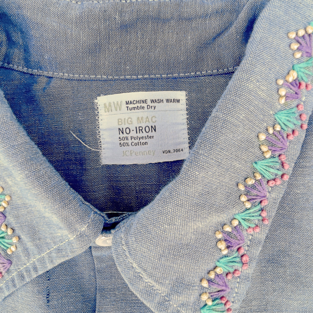 Vintage JC Penny chambray shirt with hand embroidered pinecones, sunrise, palm tree, geometric designs.