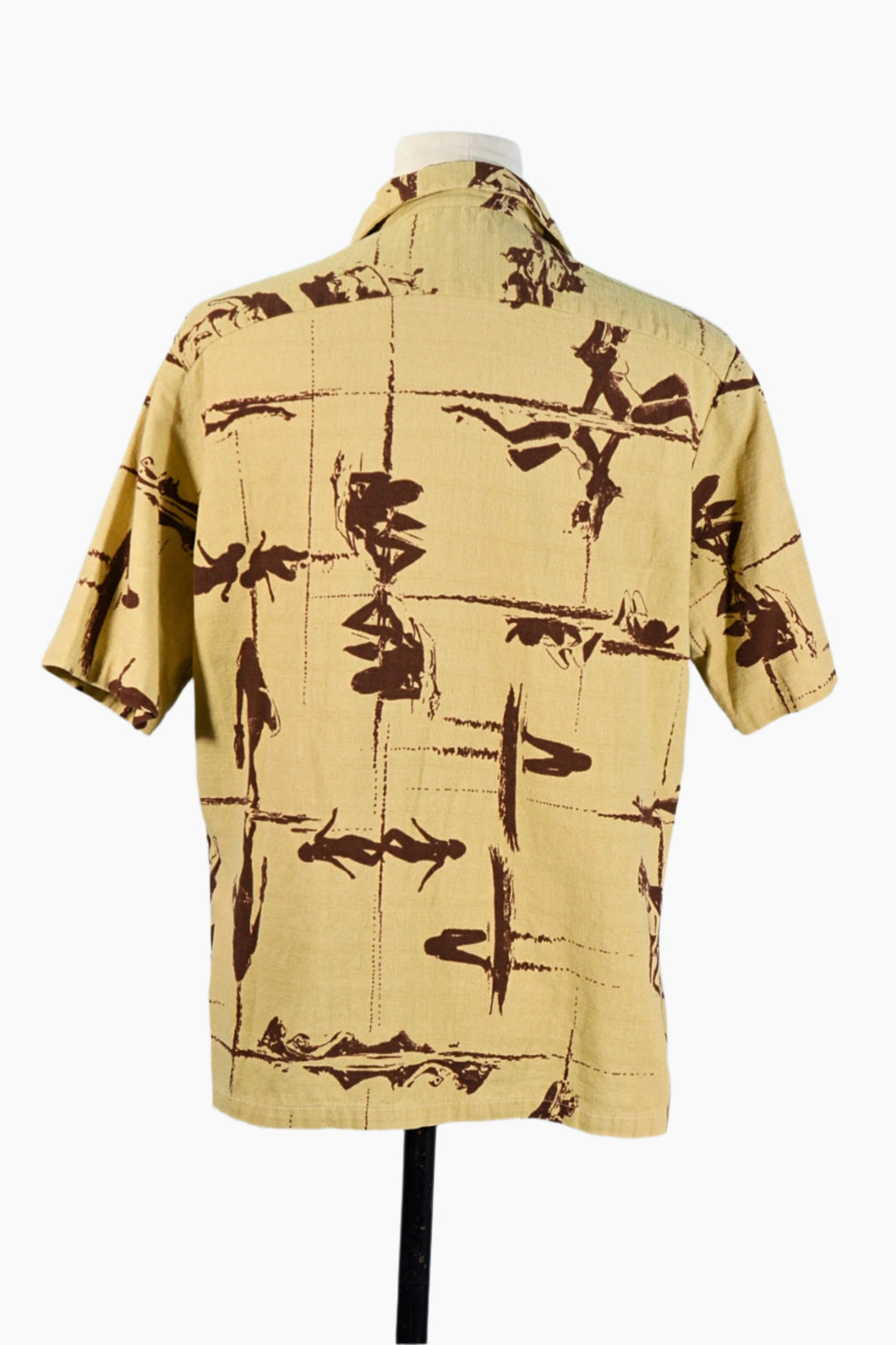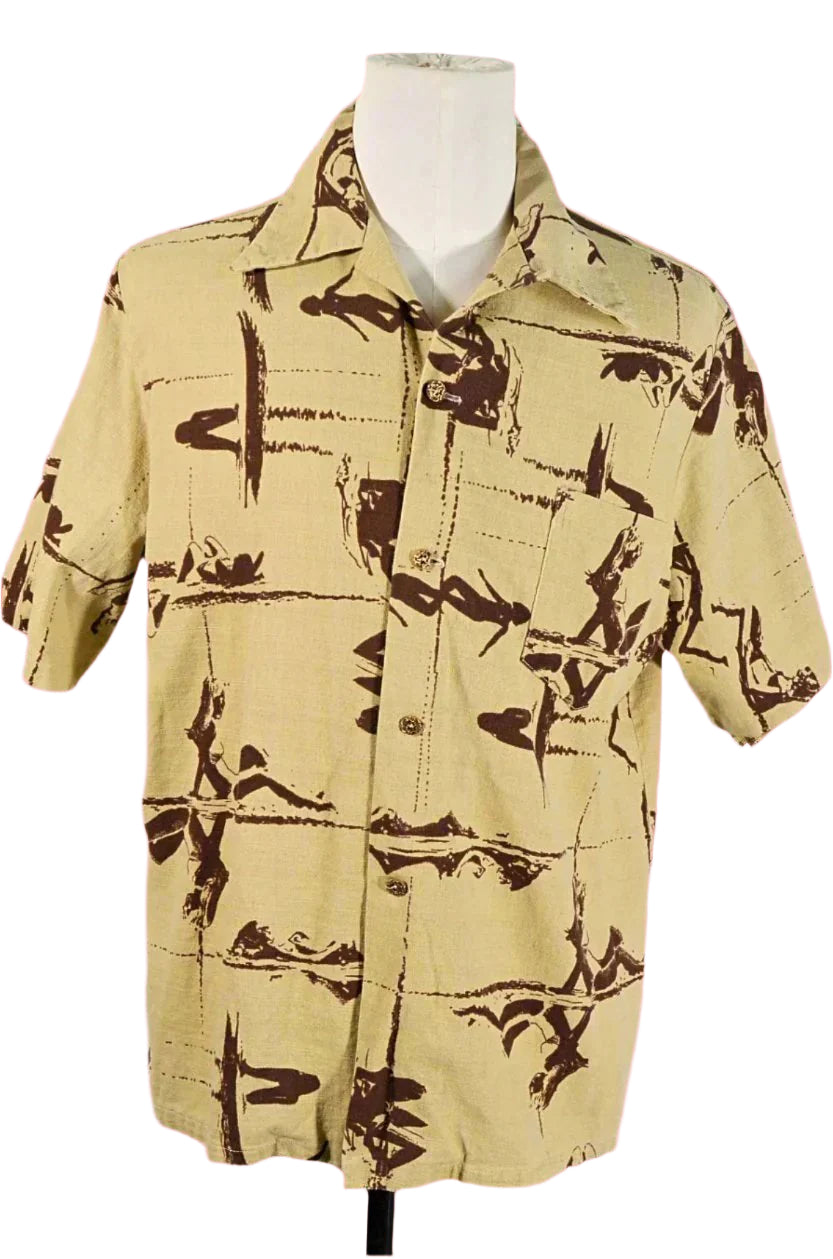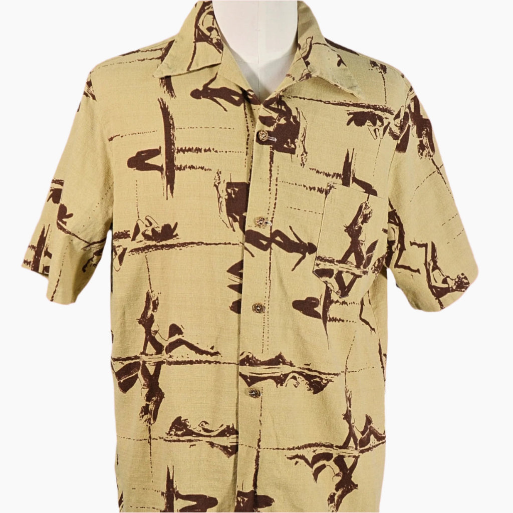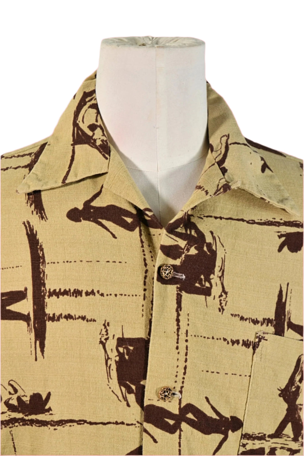 WOW! 60s novelty print Hawaiian shirt with surfer girls on the beach. An epic shirt with a great print.