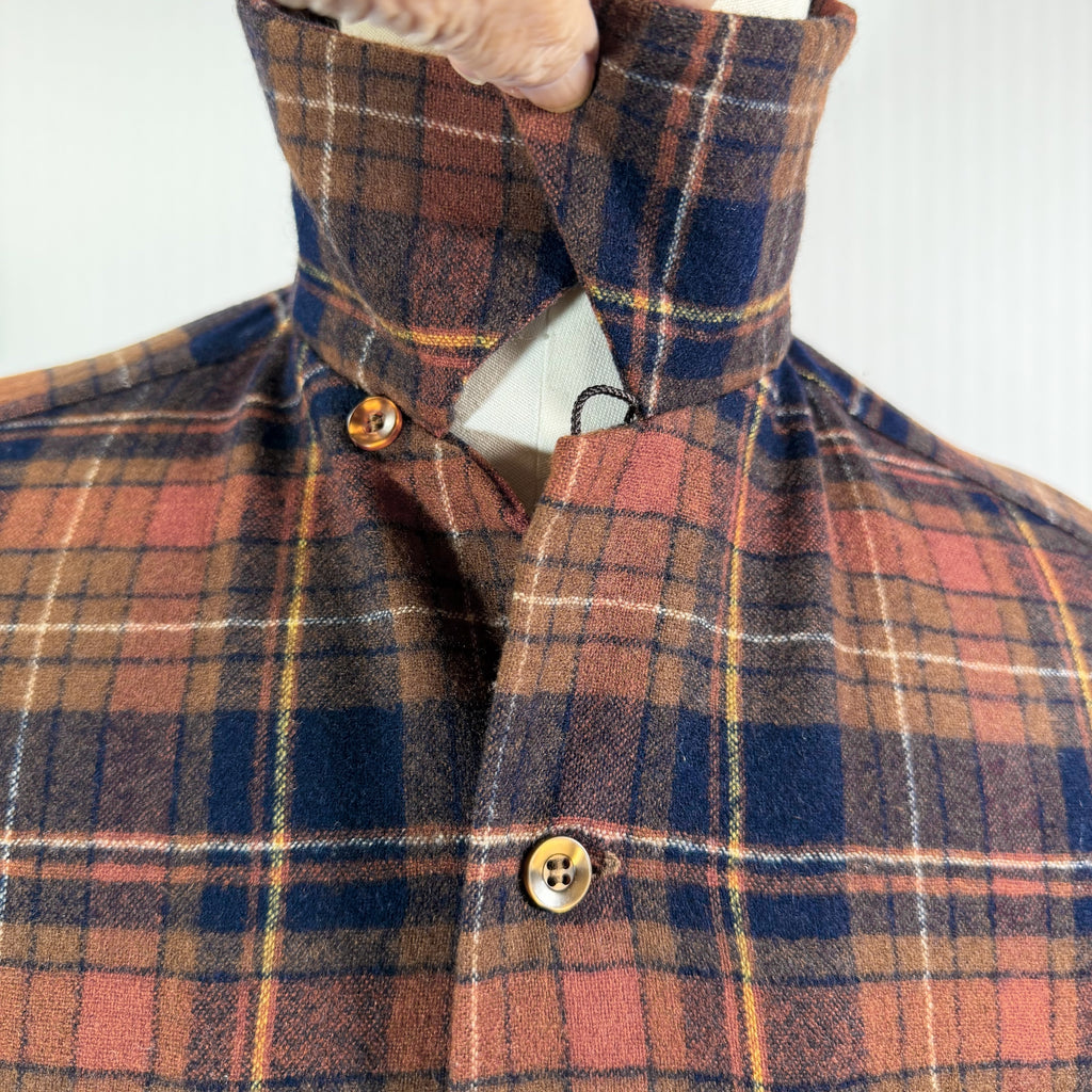 Bias plaid pockets, pointed collar, tab button neck closure.