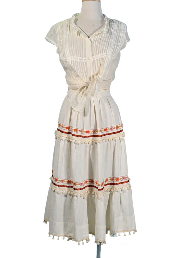 Vintage Festival Skirt, Ribbon + Pom Pom Trim, Boho Hippie Gypsy Skirt