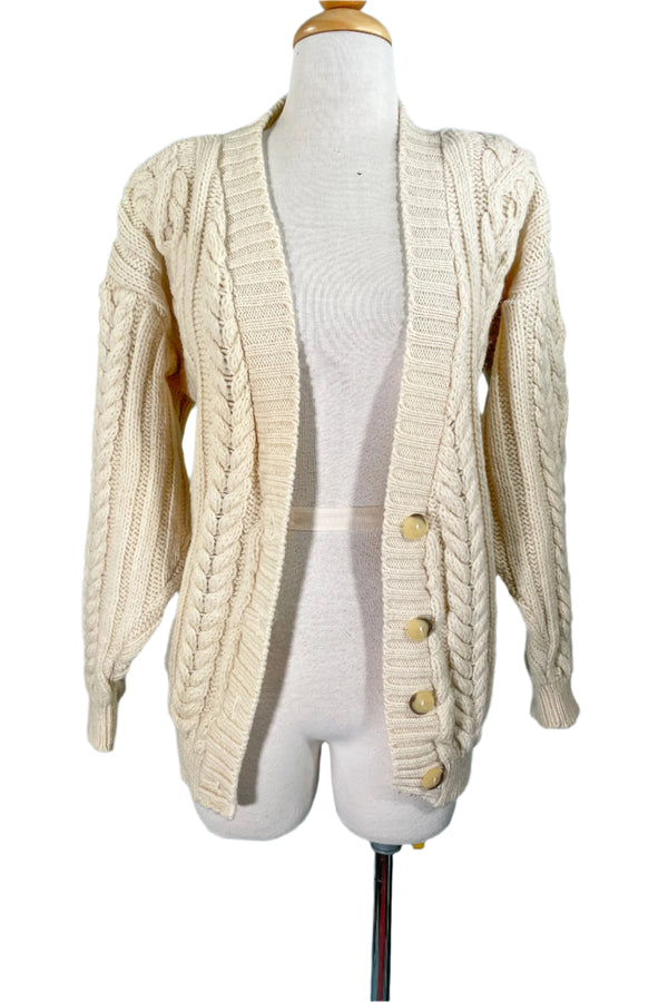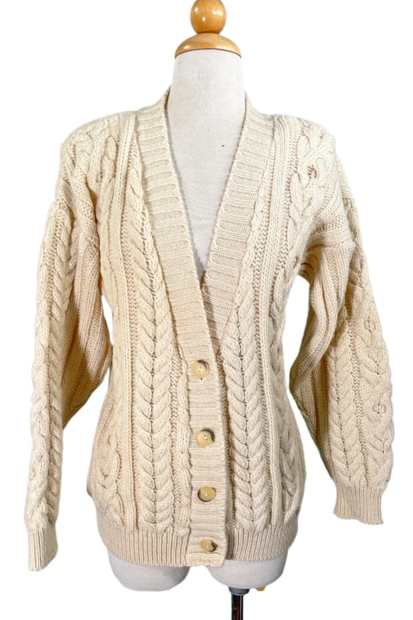 Carducci Cream Wool Cardigan Sweater, Cable Knit Fisherman Sweater M