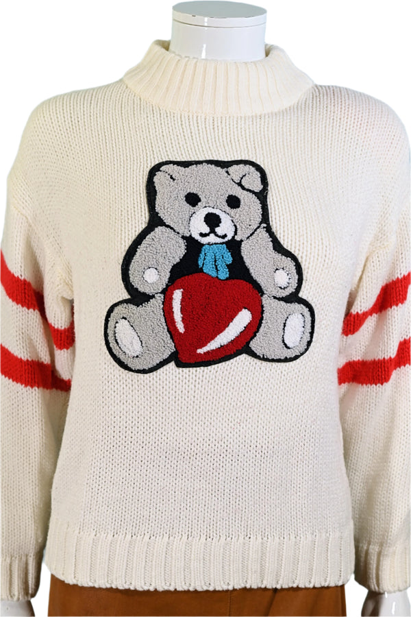 Vintage White Sweater Bear/Heart Patch, Acrylic Novelty Pullover Sweater