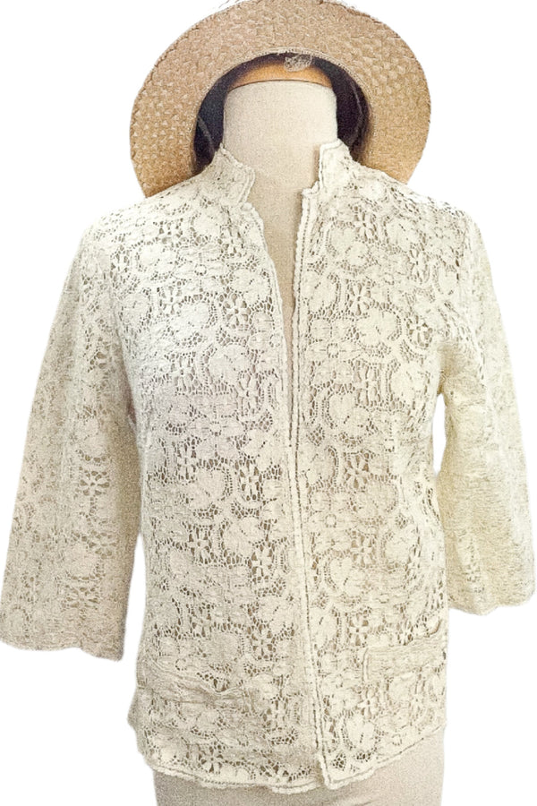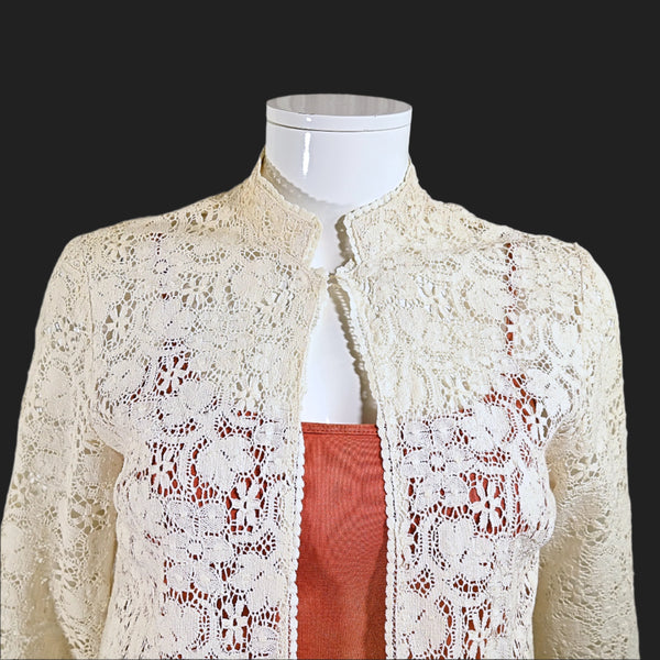 Vintage Hand Crochet Cardigan w/Belt, Cream Crochet Top S