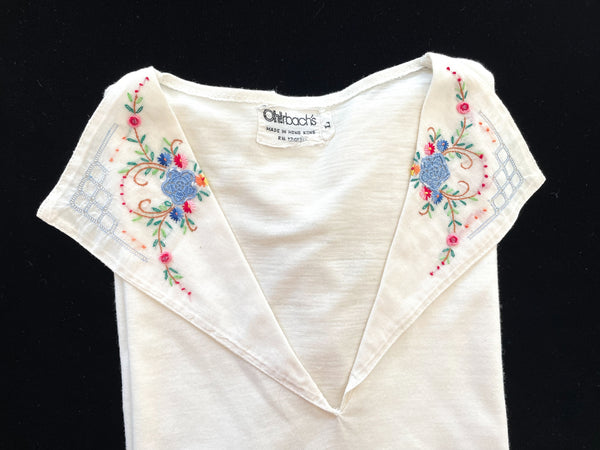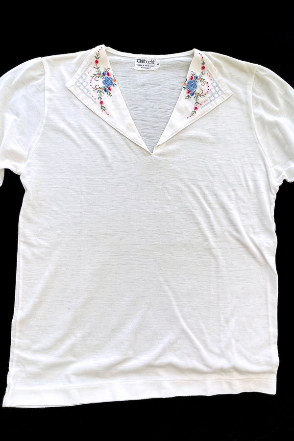 SOLD Vintage 70s White T-Shirt Embroidered Collar, Deadstock Unworn L