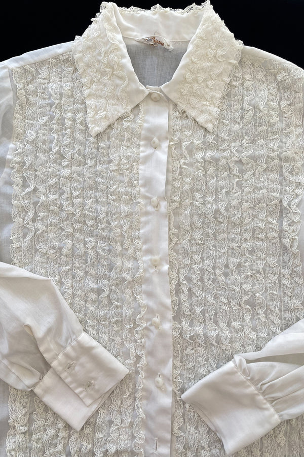 Vintage 60s White Lace Blouse Tunic, Tuxedo Style Ruffle Blouse Lady Arrow