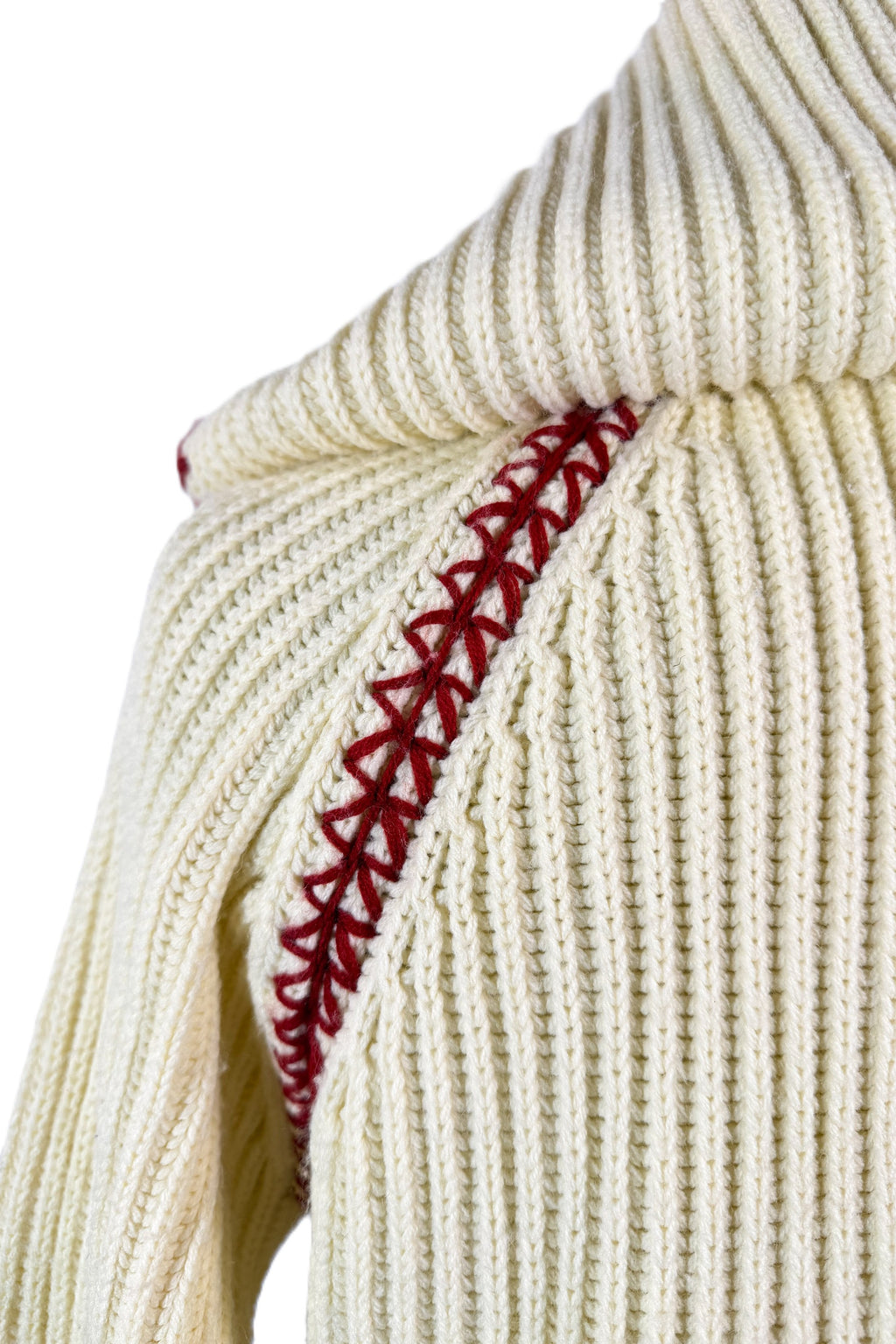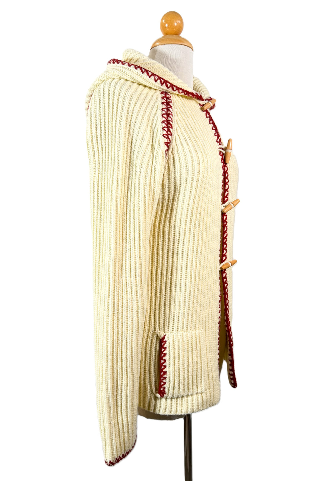 70s off white/cream ribbed cardigan sweater with a hood and wood toggle buttons.