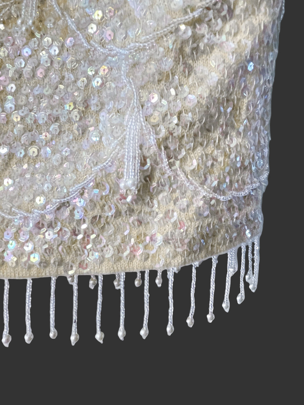 Off white/cream color wool sweater ground, clear iridescent sequins, glass beads & faux pearls.