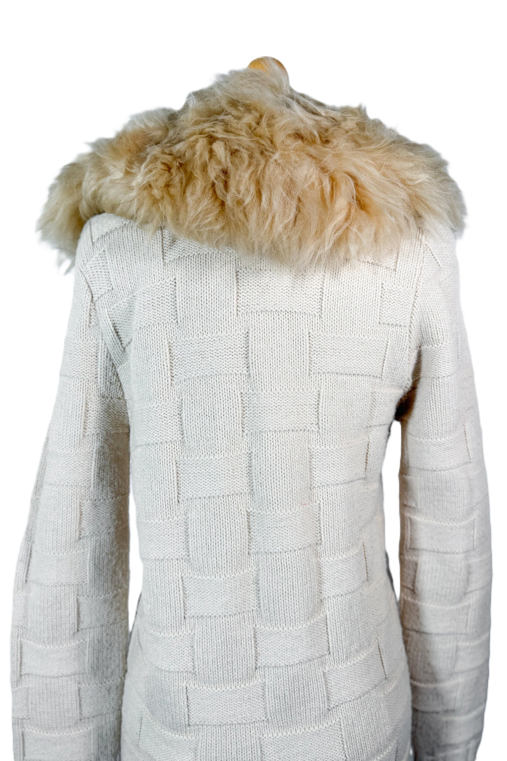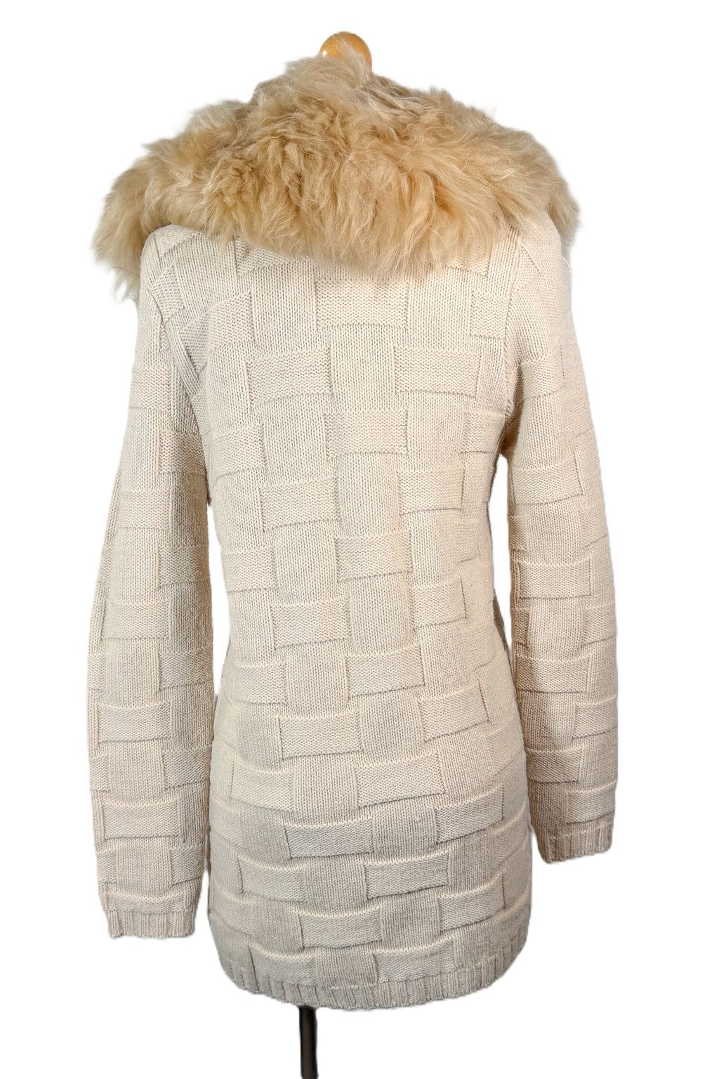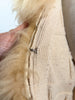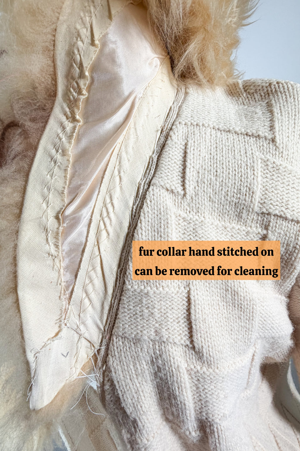 Removable genuine fur collar. Hand stitched onto the sweater. Remove to clean or wash.