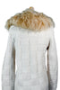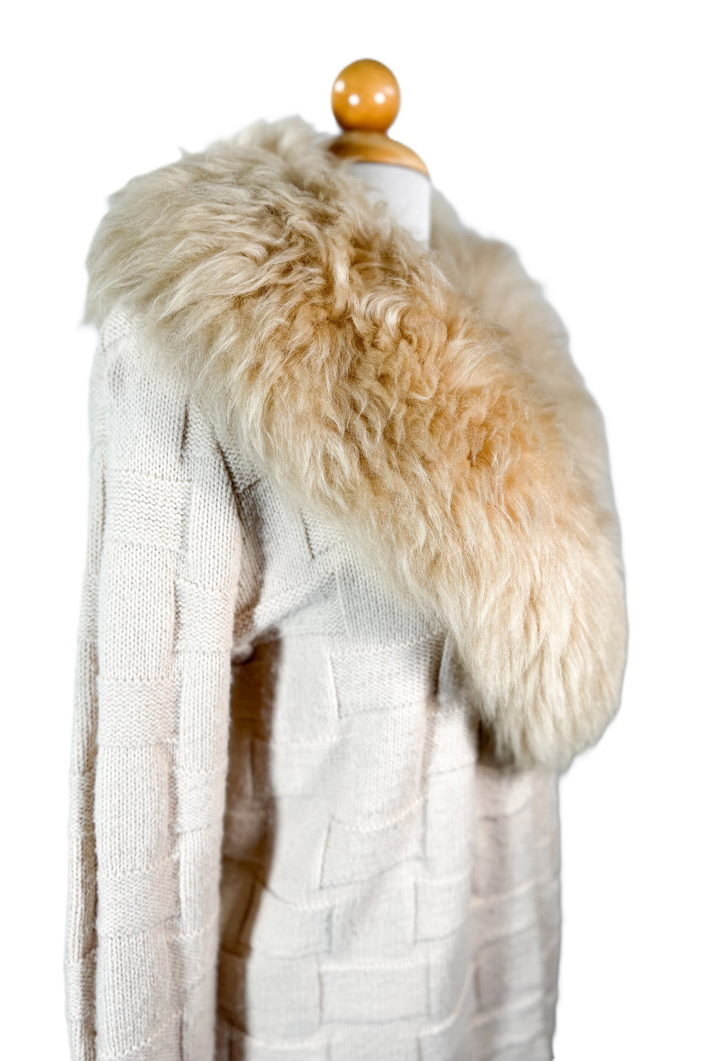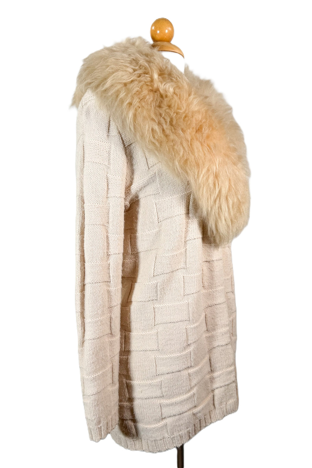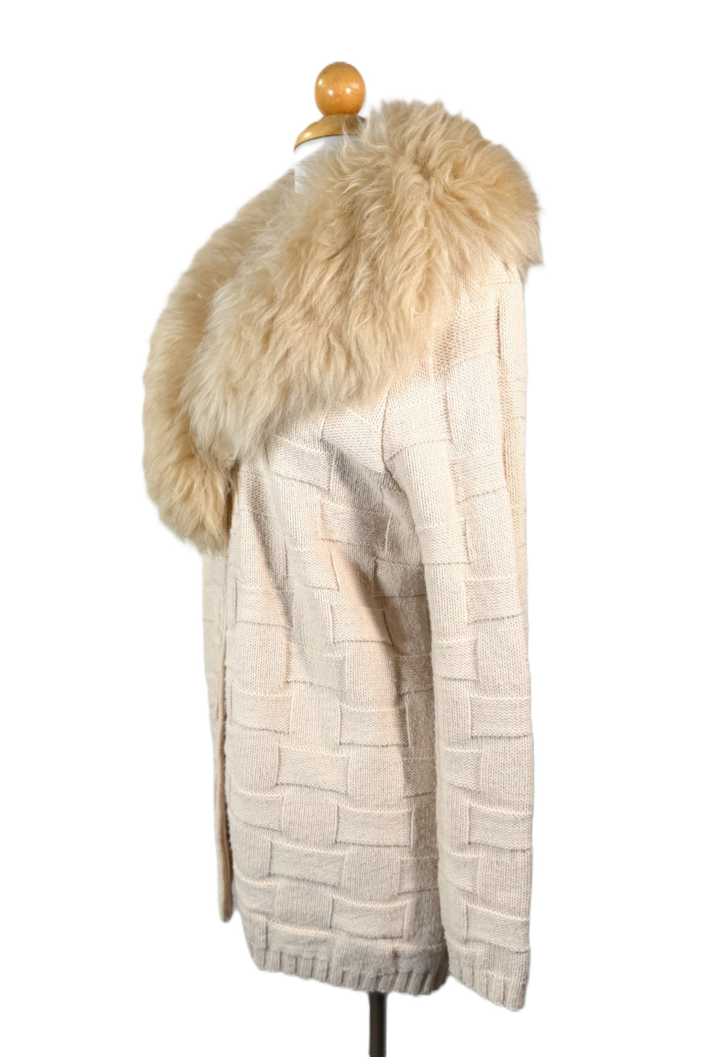 Removable genuine fur collar. Hand stitched onto the sweater. Remove to clean or wash.