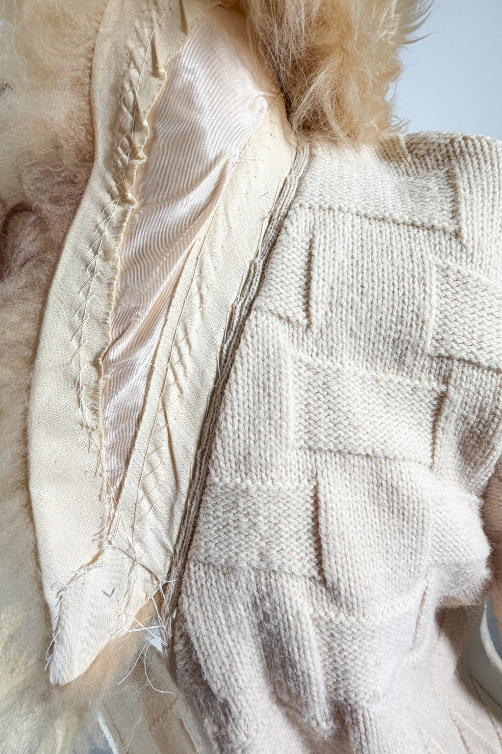 Material: Orlon (acrylic) knit, genuine shearling sheepskin collar.