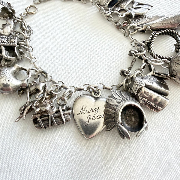 Vintage MCM Sterling Bracelet, 24 Silver Charms, Southwestern & Other, 7" L + 50 Grams