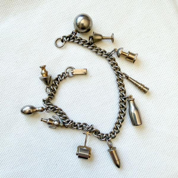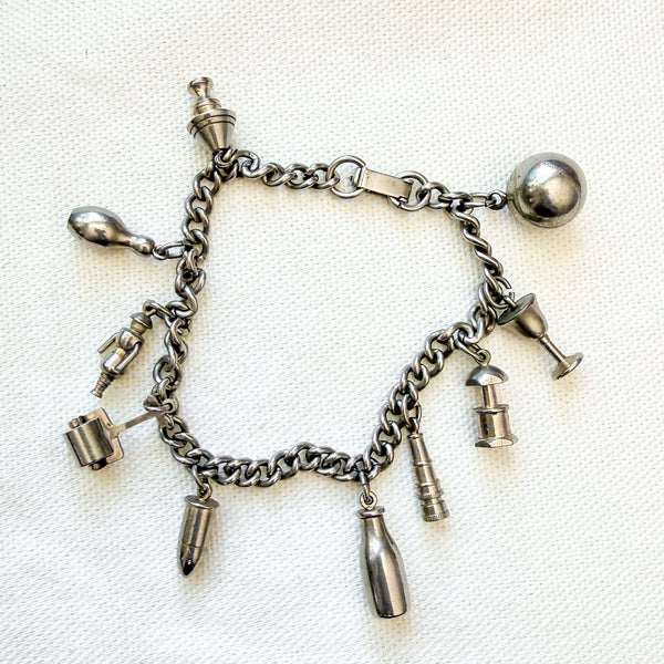 Vintage Silver Tone Charm Bracelet, MCM Costume Jewelry 10 Charms