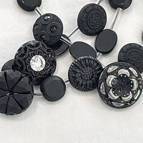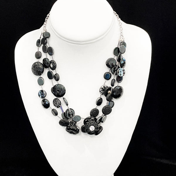 Vintage Black Buttons & Glass Beaded Necklace, 3 Strands OOAK