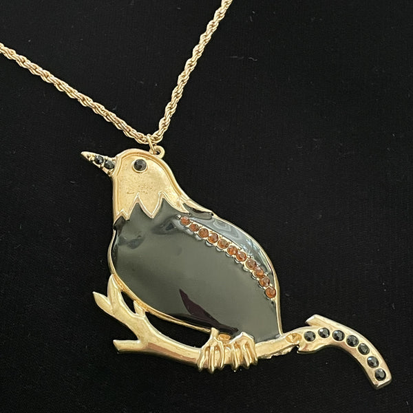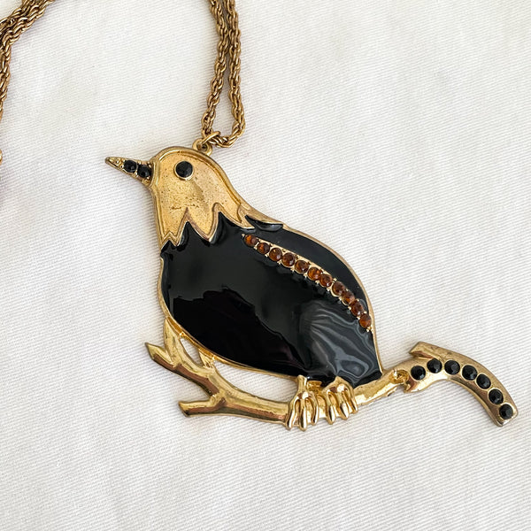 Vintage 70s Bird Pendant Necklace, Enamel Crystals Gold Tone, Nature Necklace 30" L