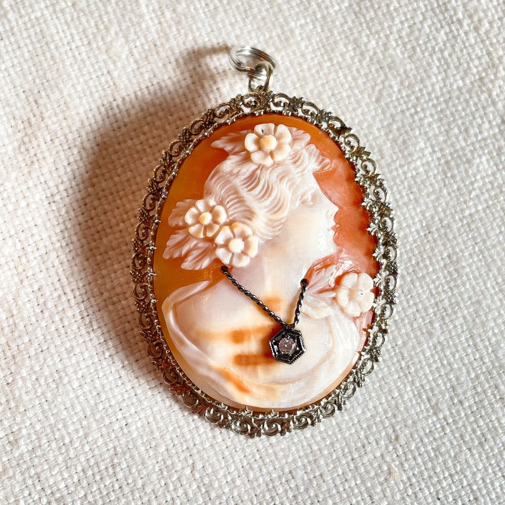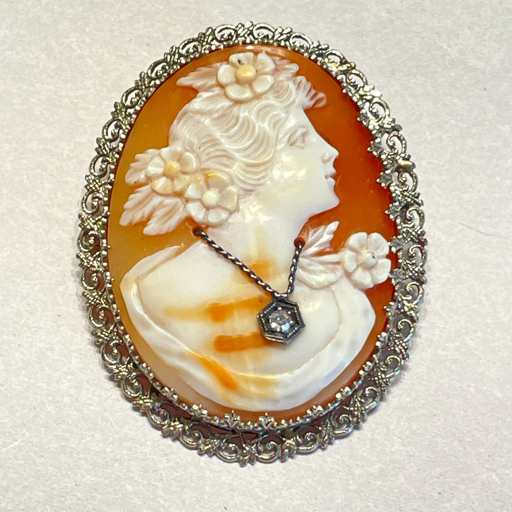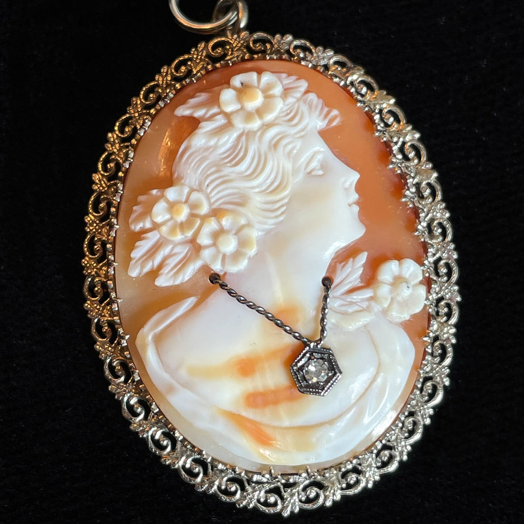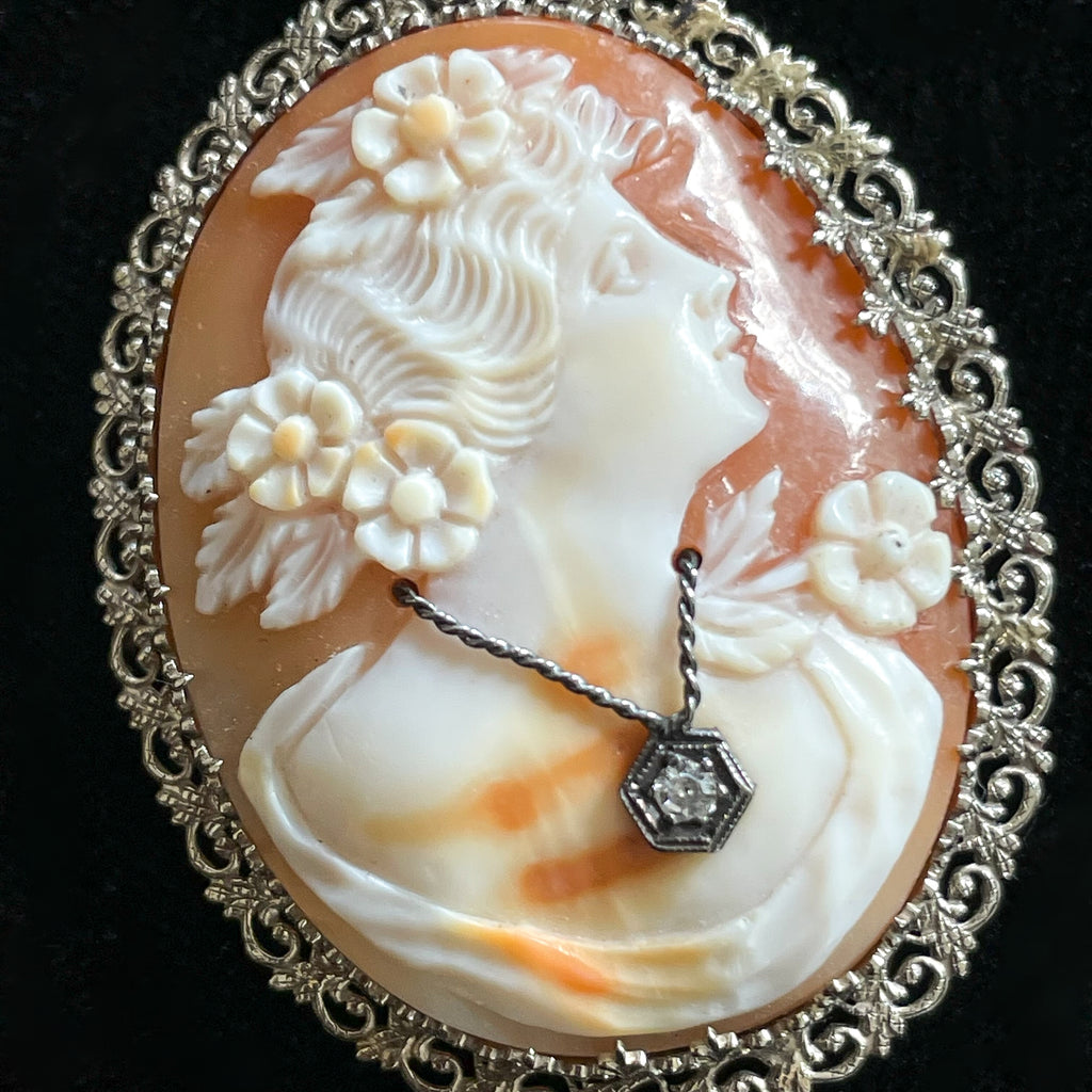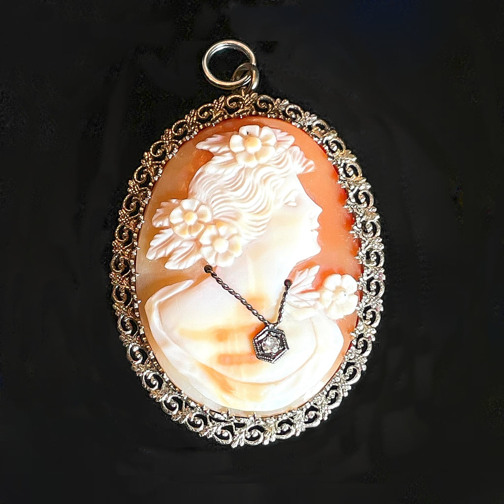 A beautiful cameo featuring a lady with carved flowers and a necklace with diamond inset.