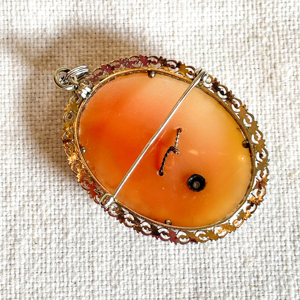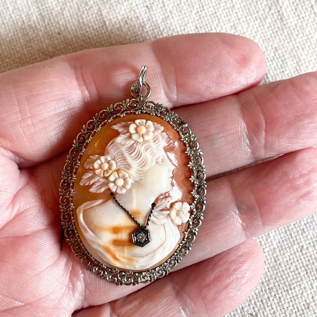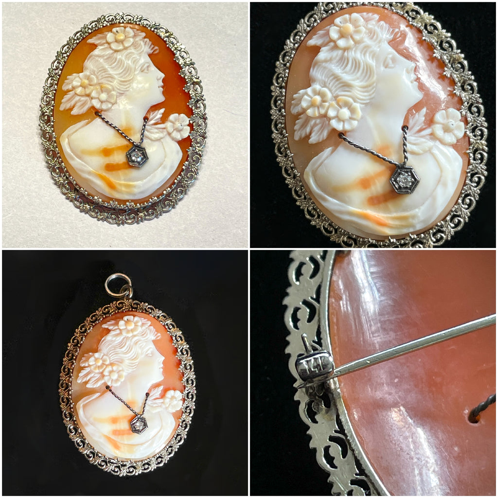 Antique carved Habille cameo brooch/pendant with 14K white gold filigree setting.