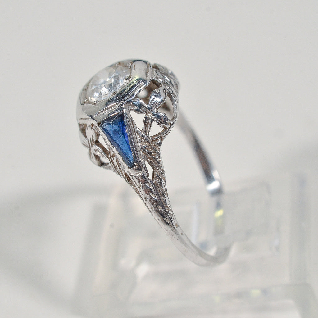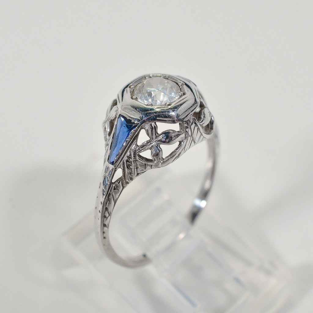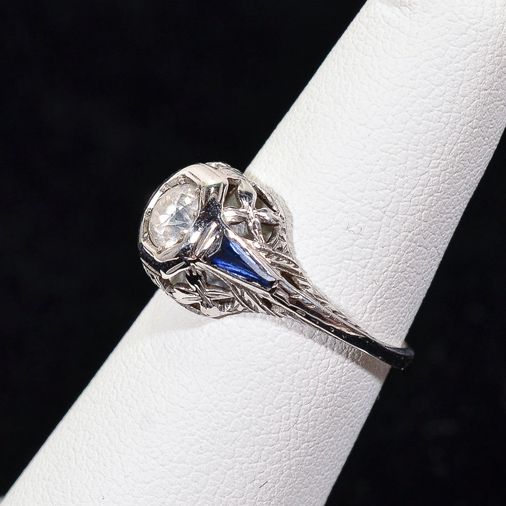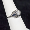 COLOR: White gold, clear diamond, synthetic blue sapphire.