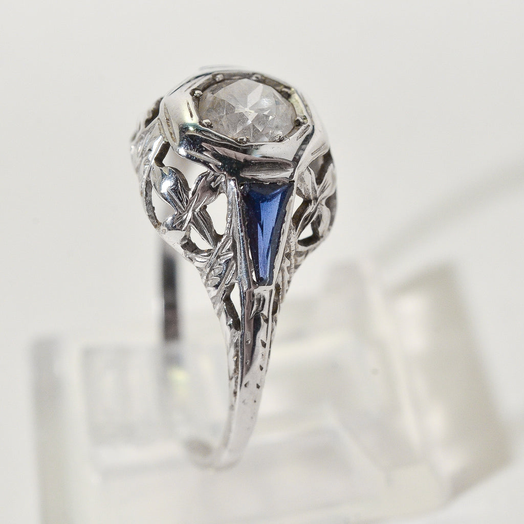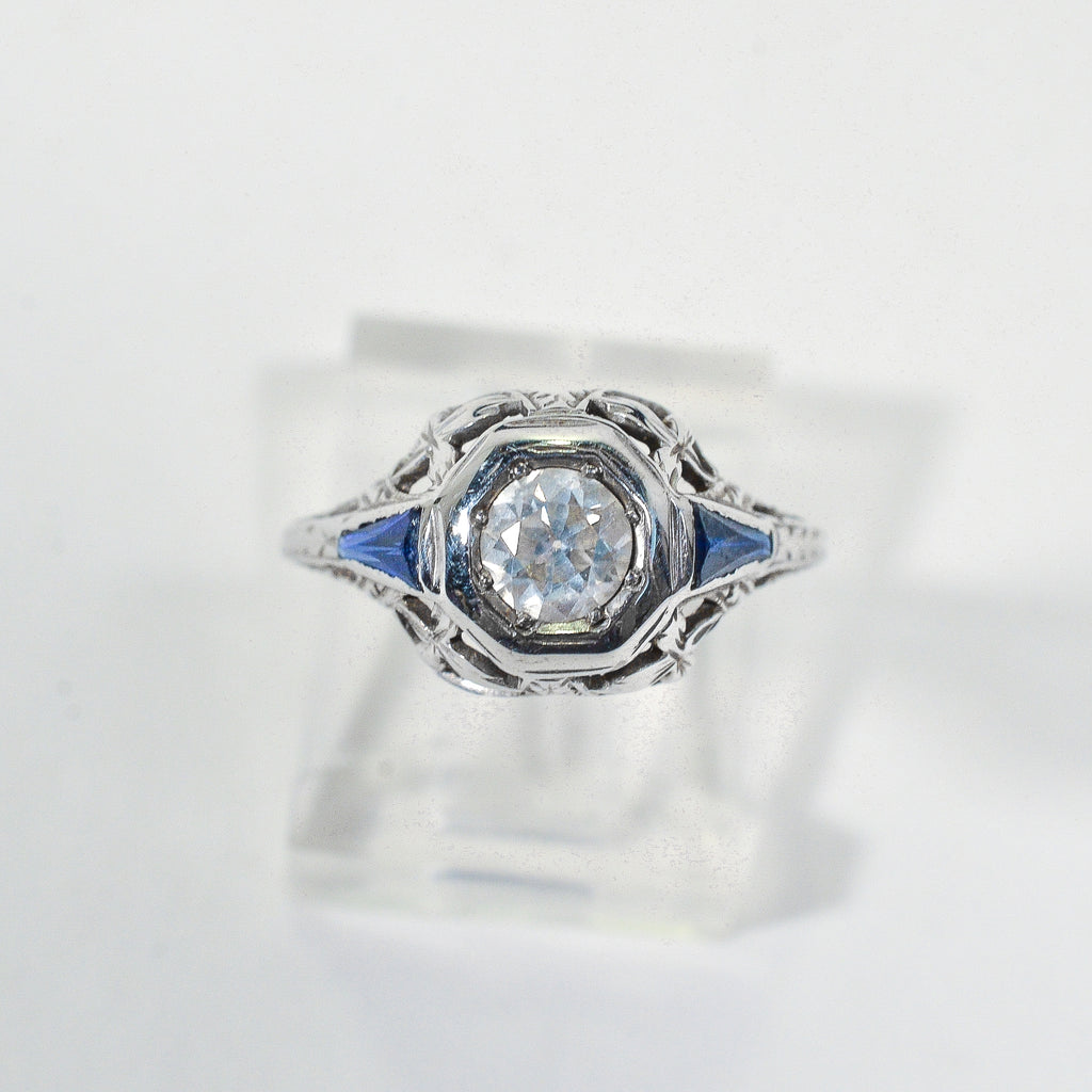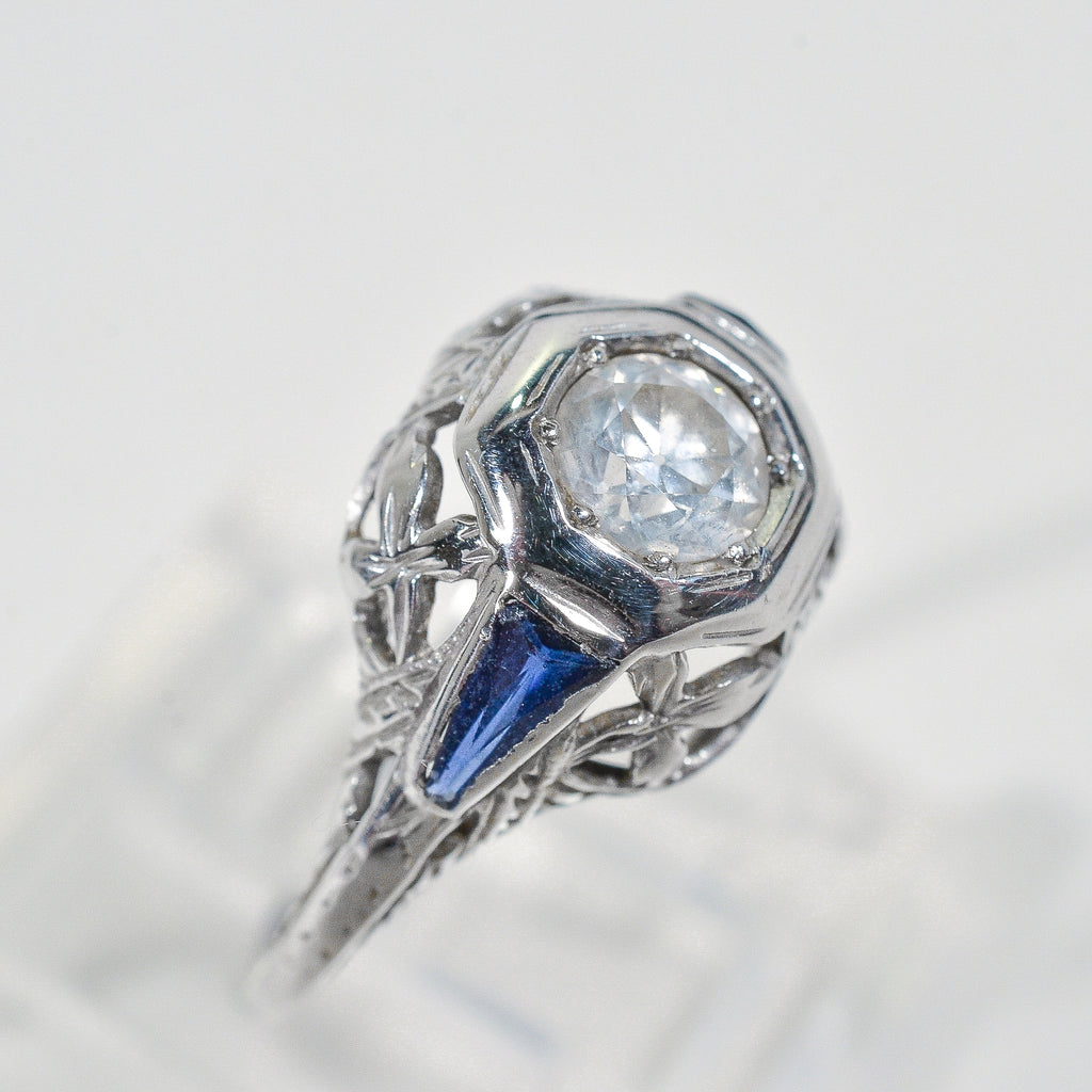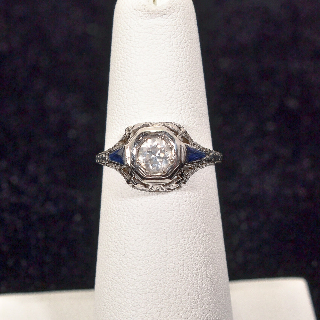 COLOR: White gold, clear diamond, synthetic blue sapphire.