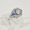The center is flanked by 1 tapered synthetic blue sapphire baguette.