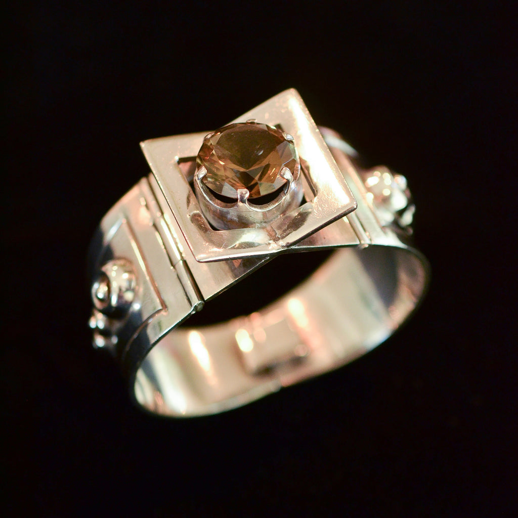 Raised panel with a large, faceted prong set smoky topaz, raised circles on the side panels.