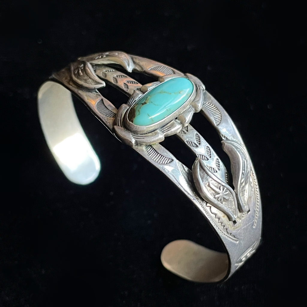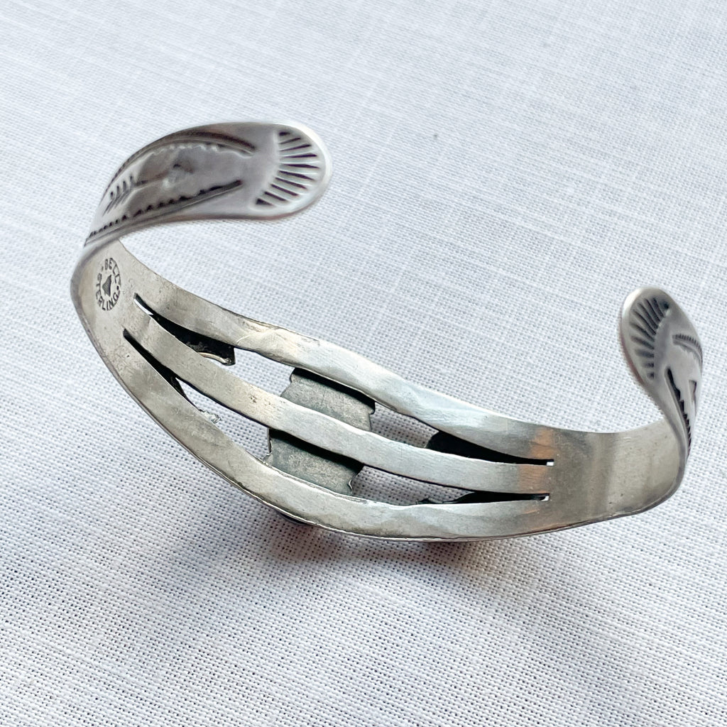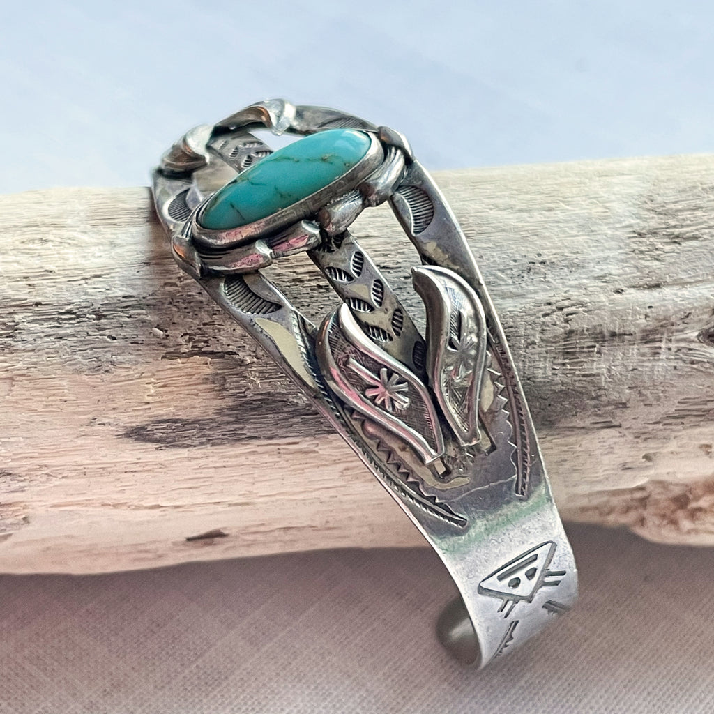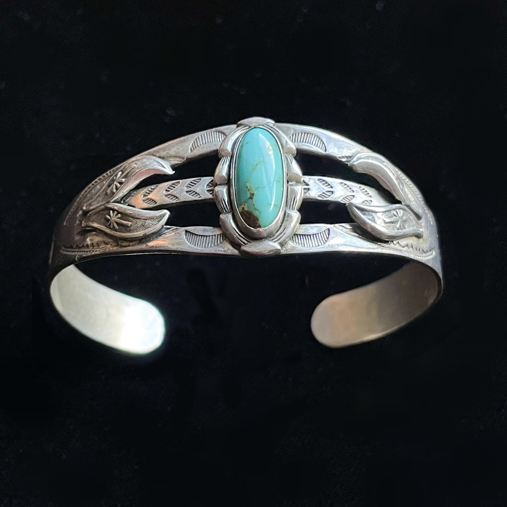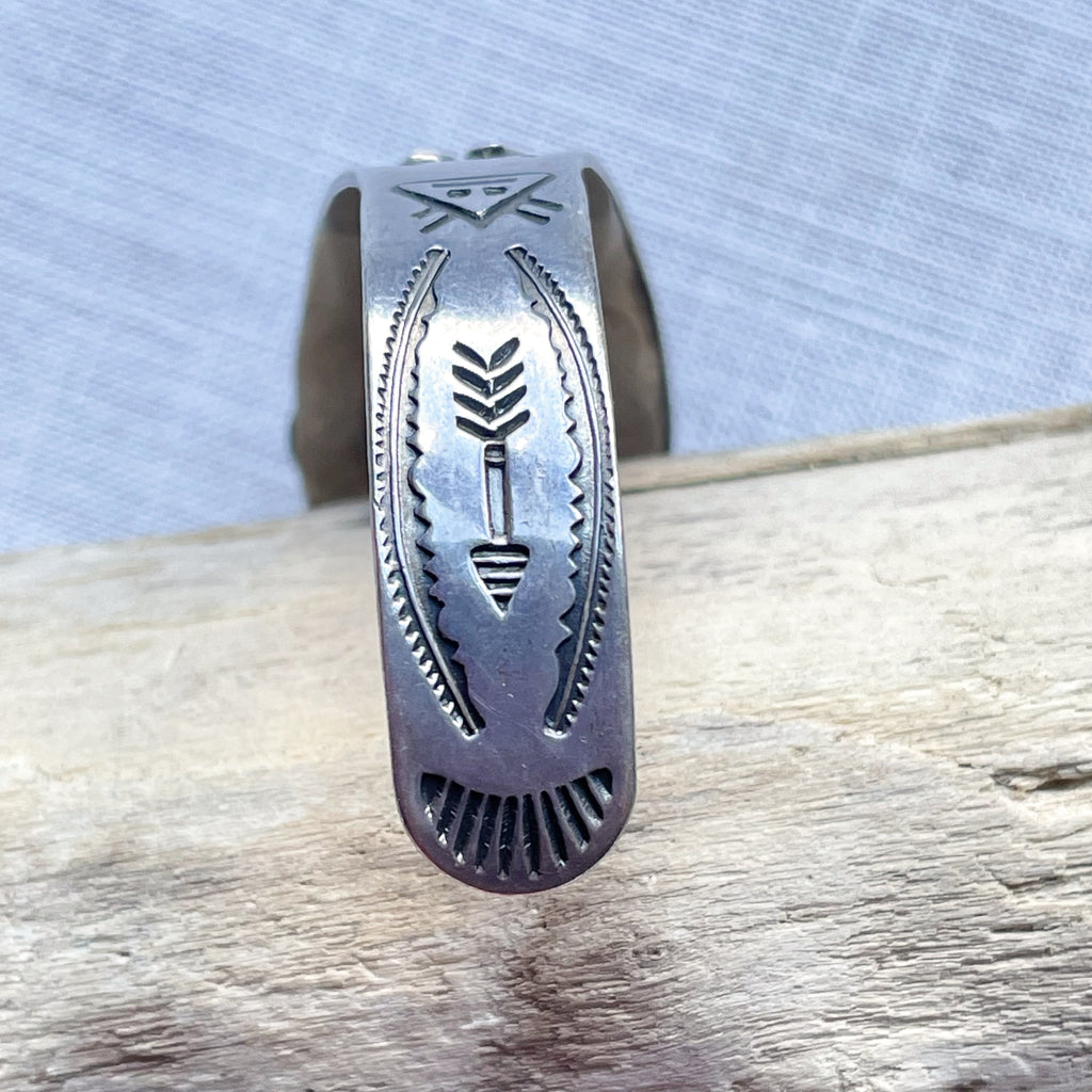 Sterling Silver, turquoise stone in the center. raised details and stamping on the sides: arrows, morning star, sun rays & more.