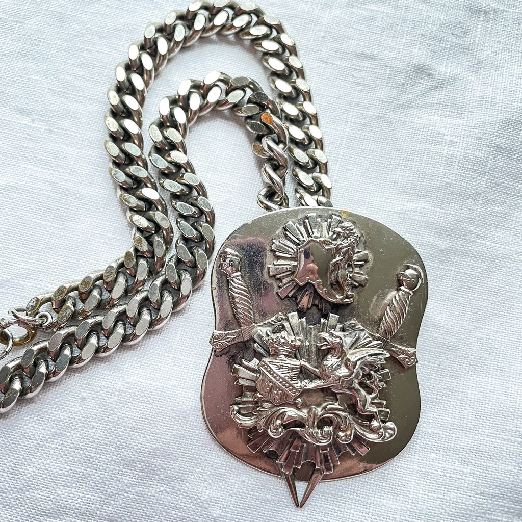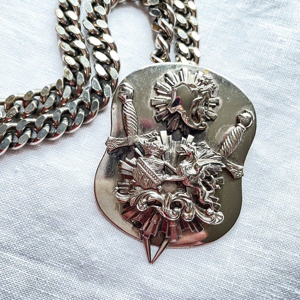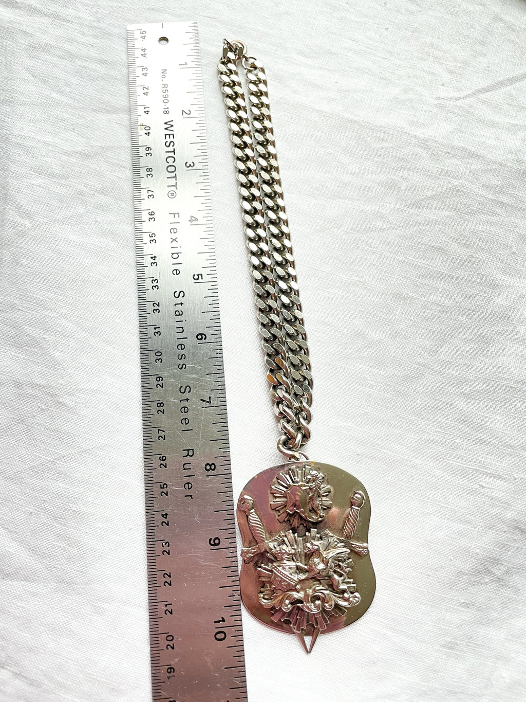 Vintage silver tone Heraldic shield Medieval style pendant/brooch combo on a thick chain necklace.
