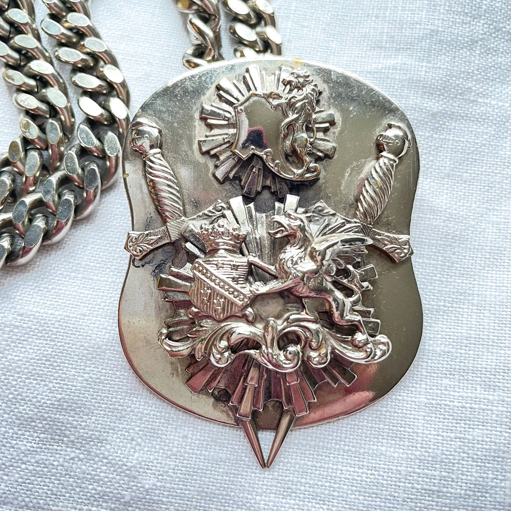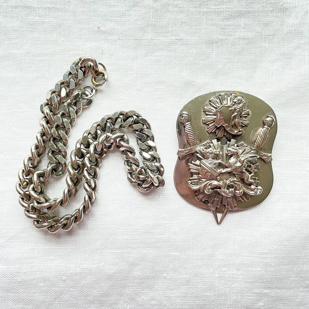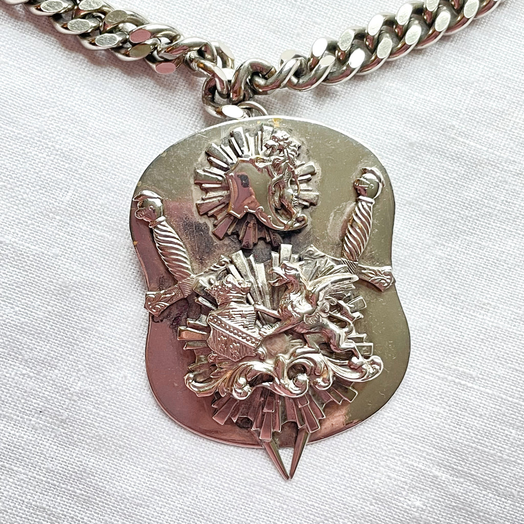Vintage silver tone Heraldic shield Medieval style pendant/brooch combo on a thick chain necklace.