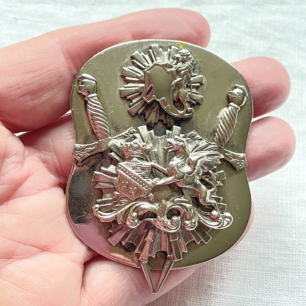The pendant/brooch is heavily detailed with swords, griffins, and more details. Refer to photos for more details.