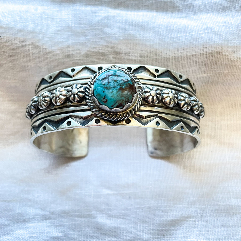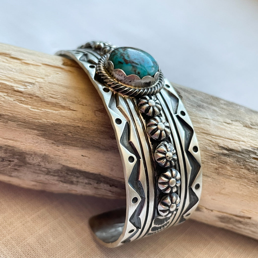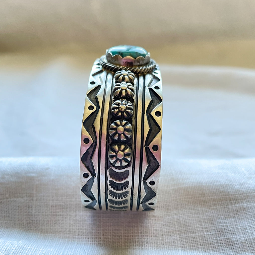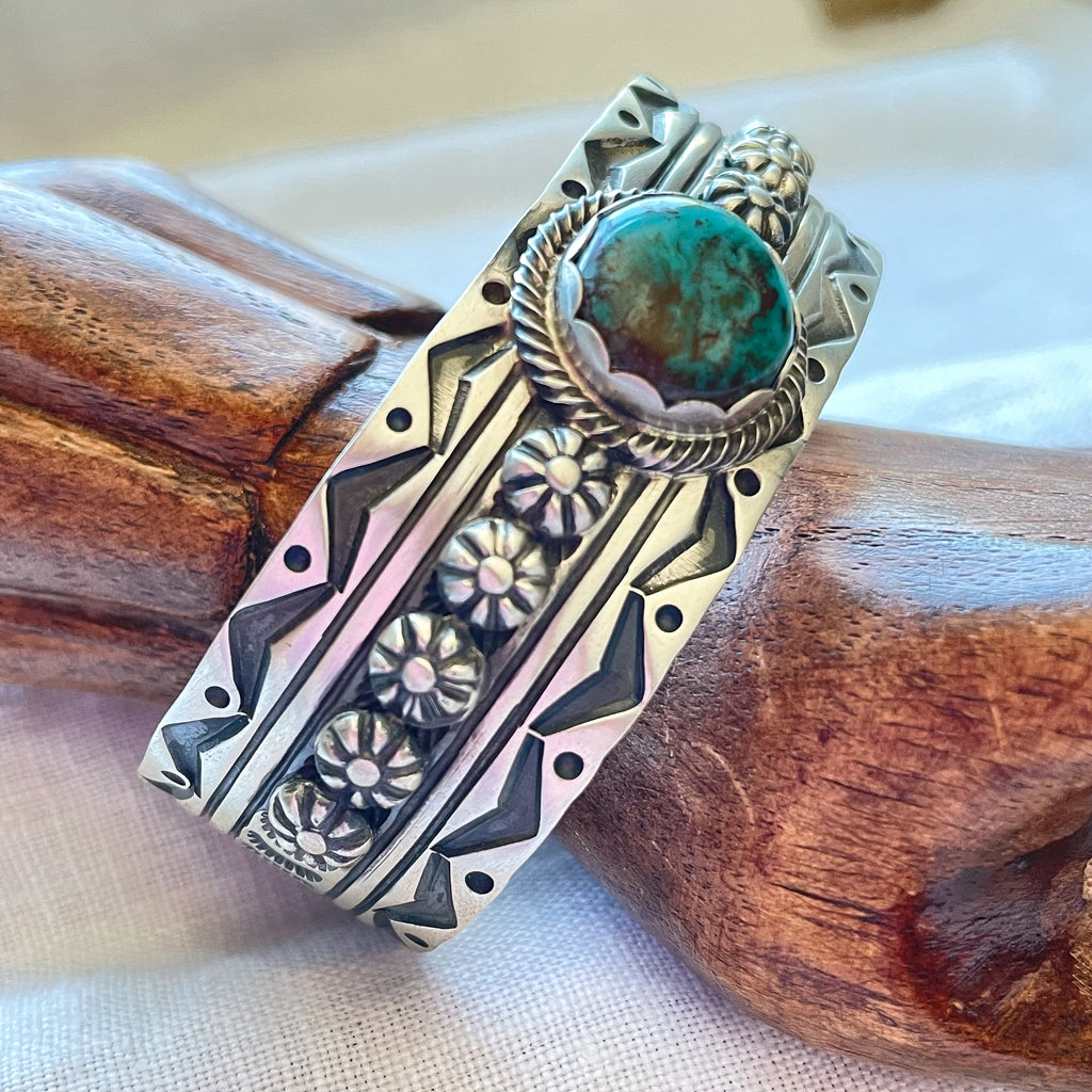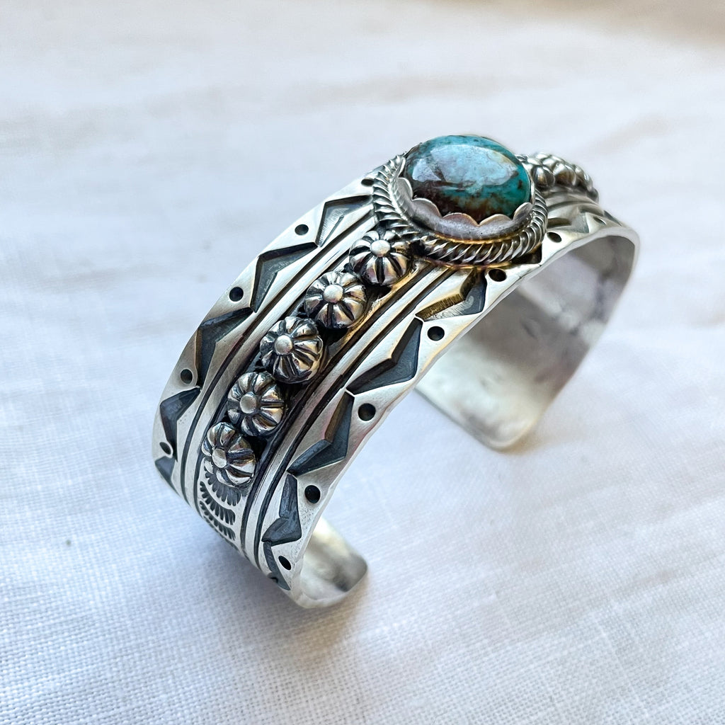 Charles Johnson, Navajo, sterling silver heavily detailed cuff bracelet.