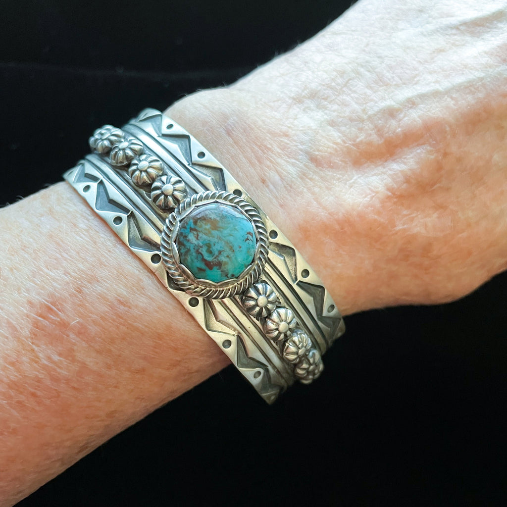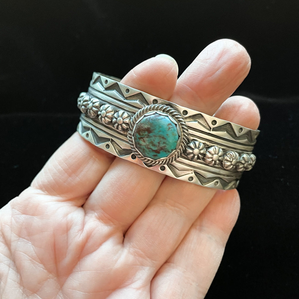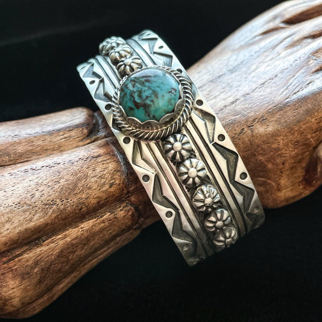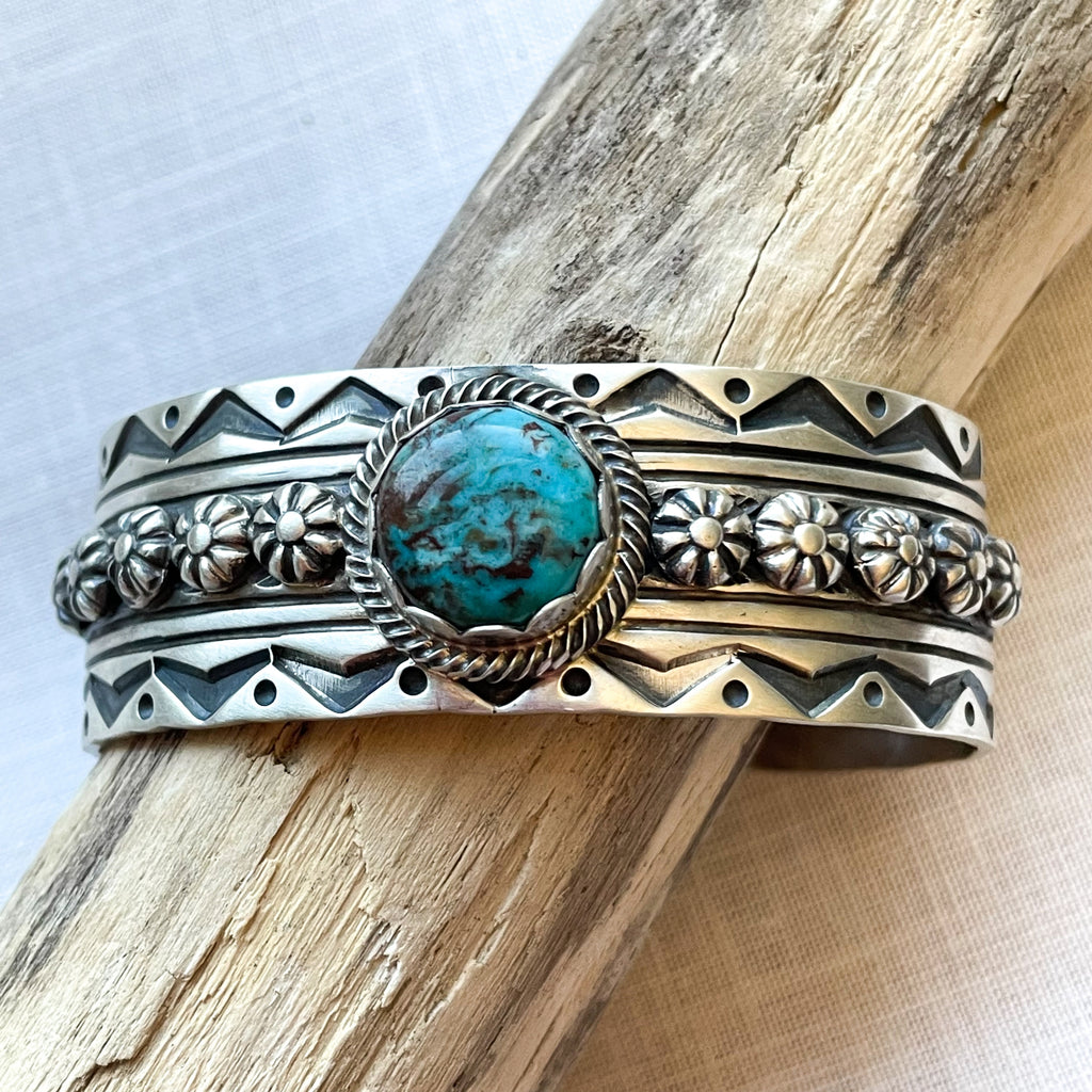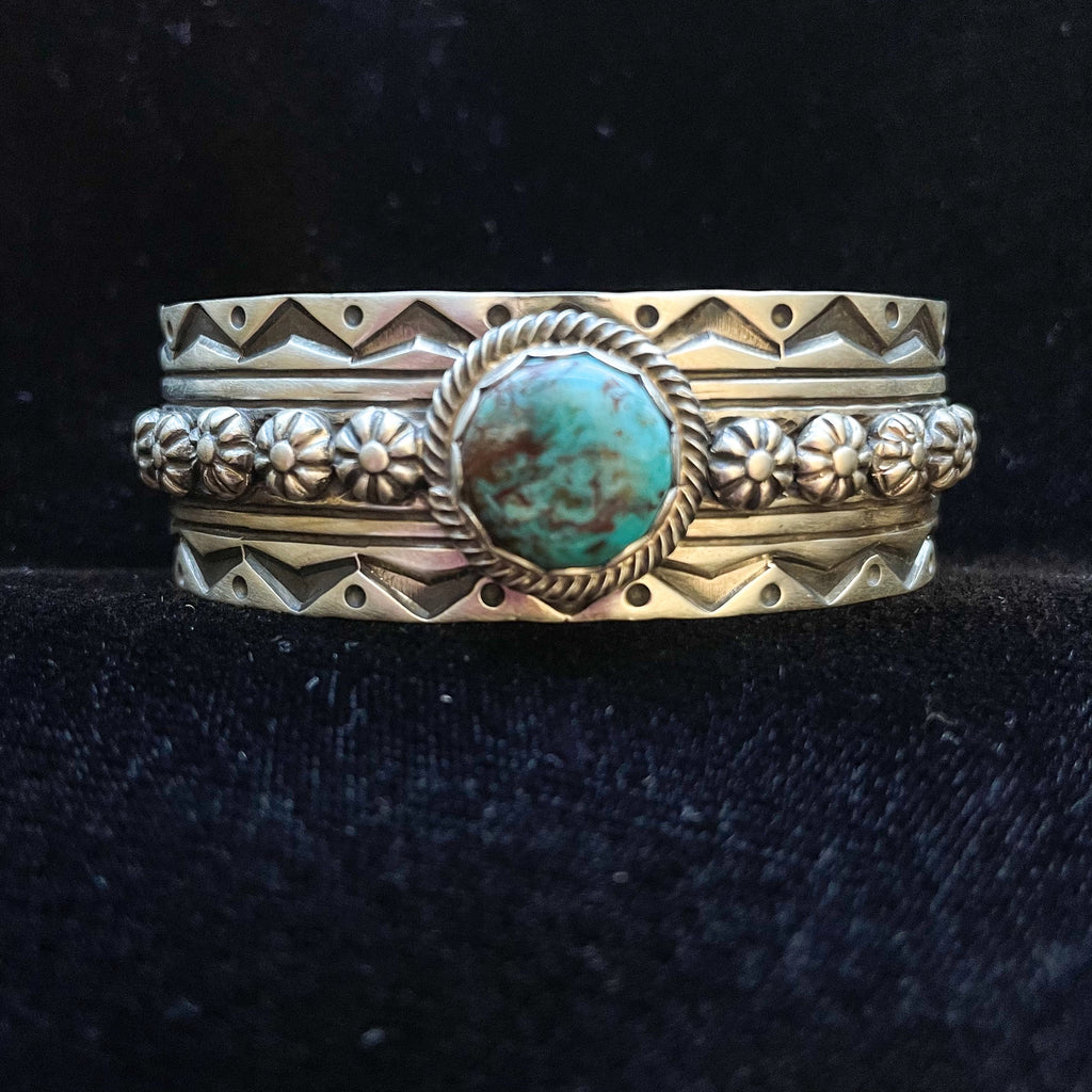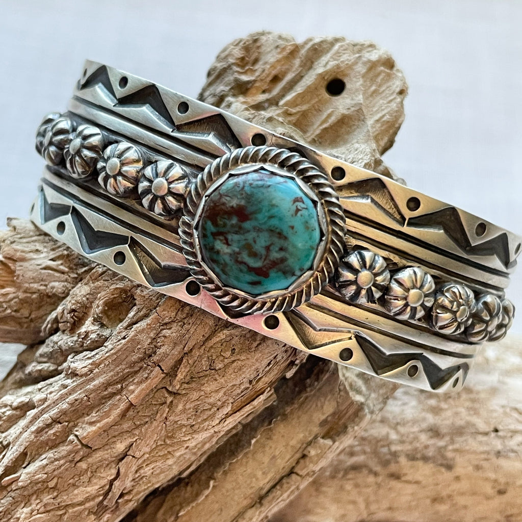 Charles Johnson, Navajo, sterling silver heavily detailed cuff bracelet.