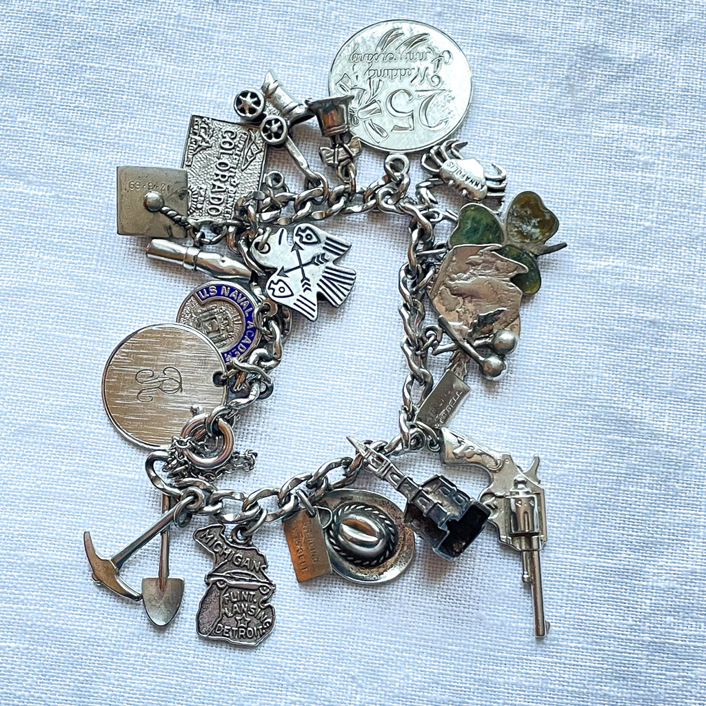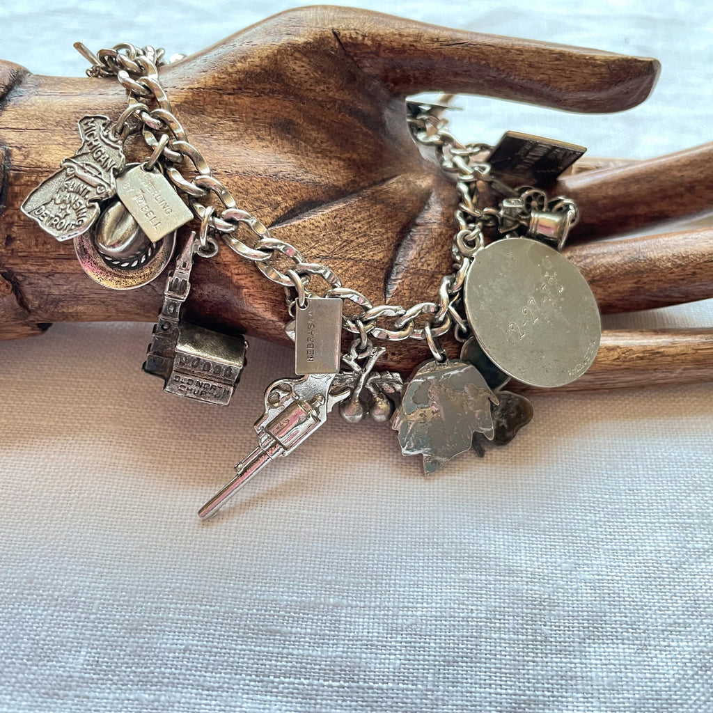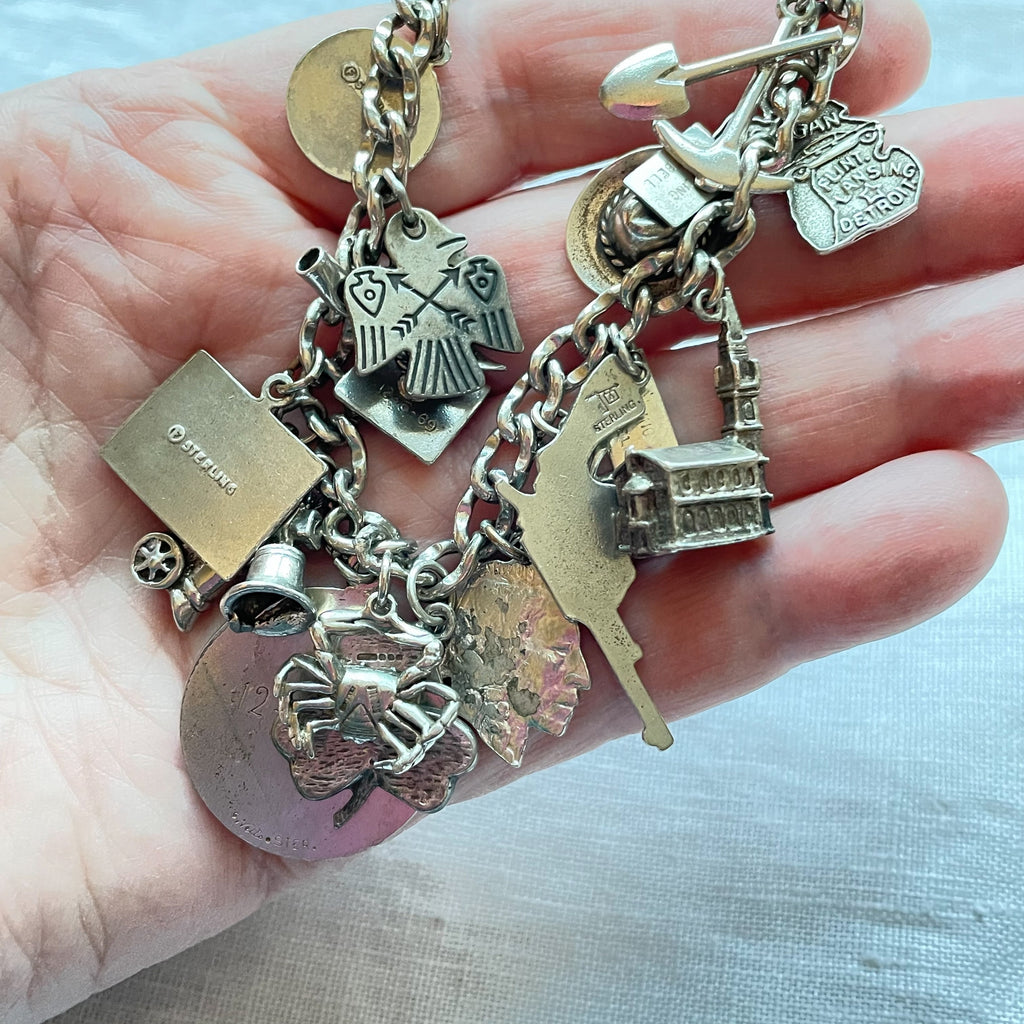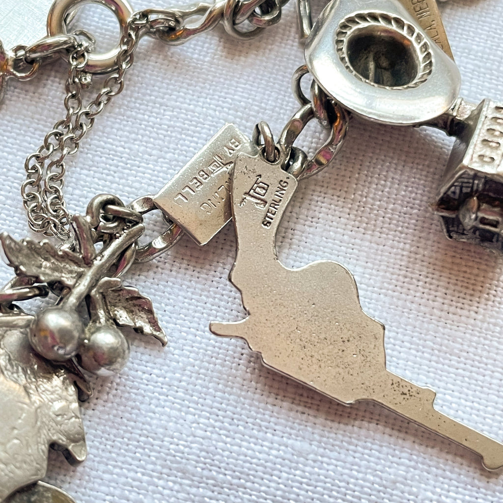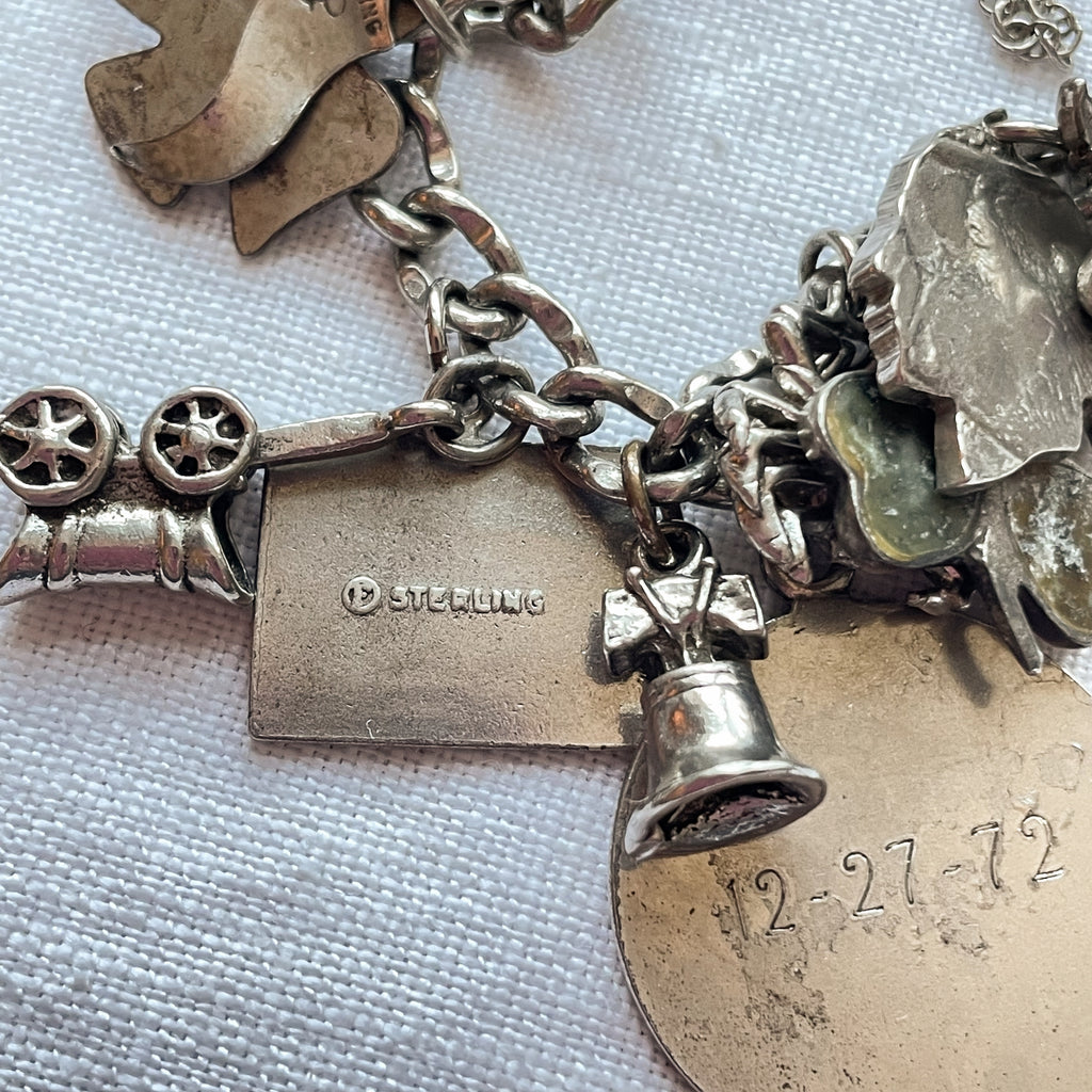 Vintage 12K white gold bracelet with assorted sterling silver charms including: