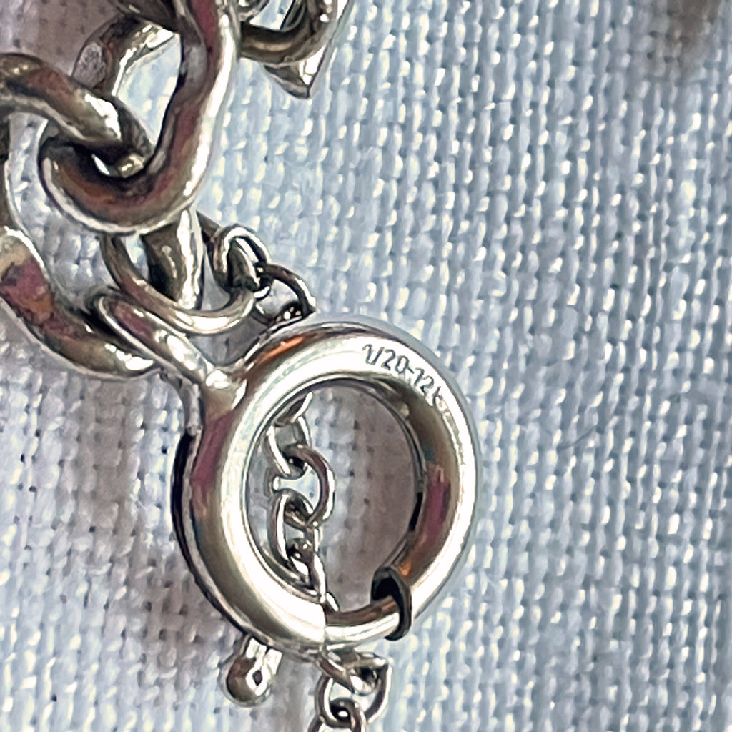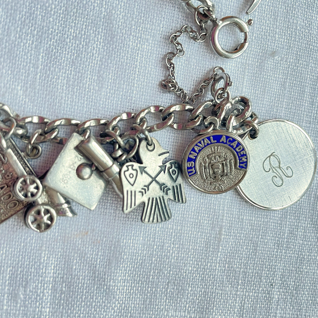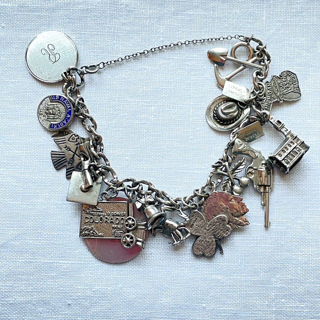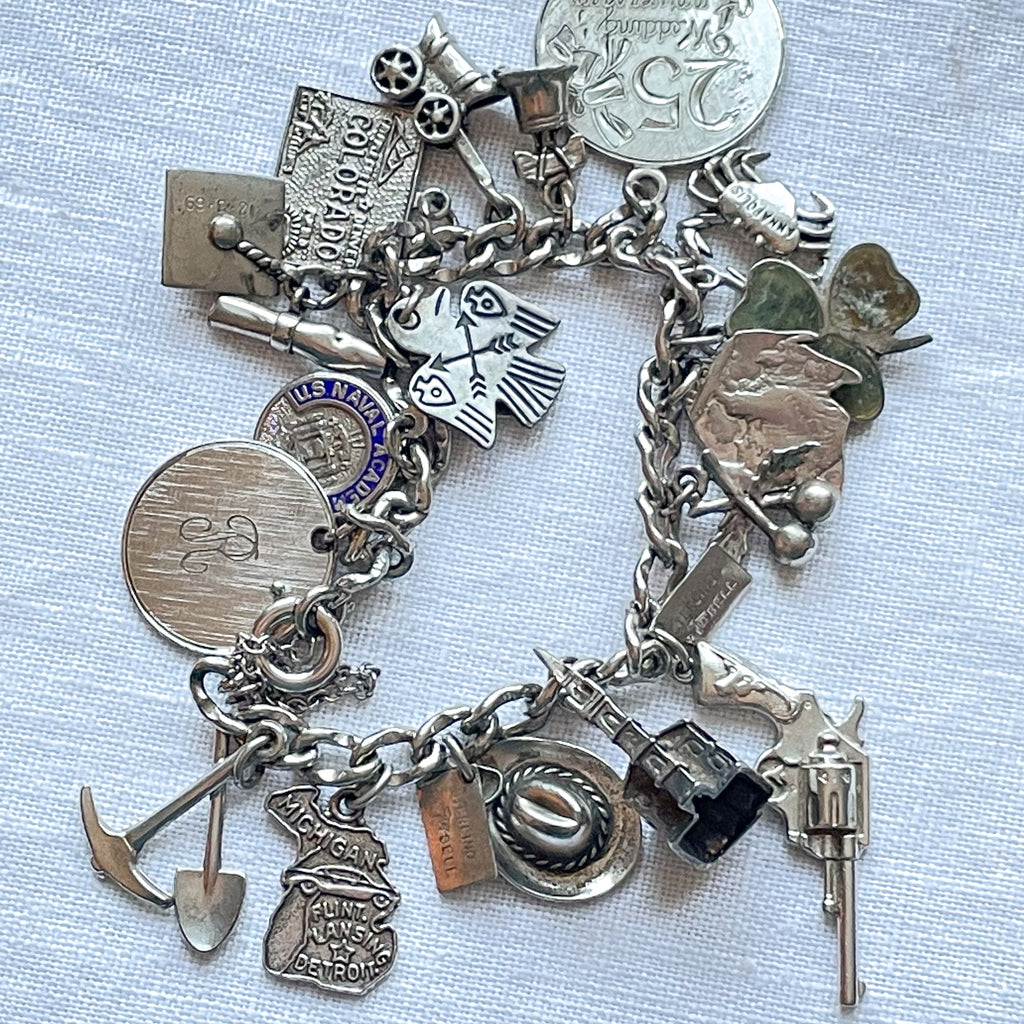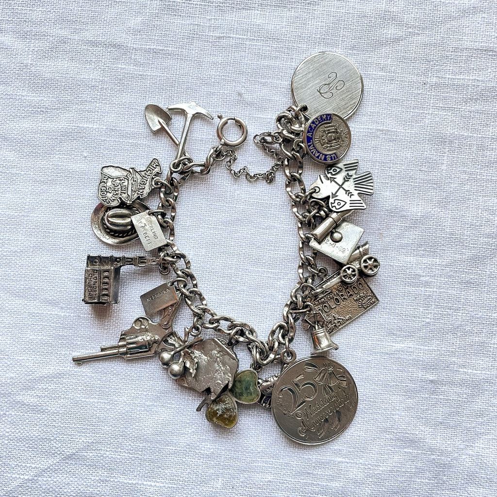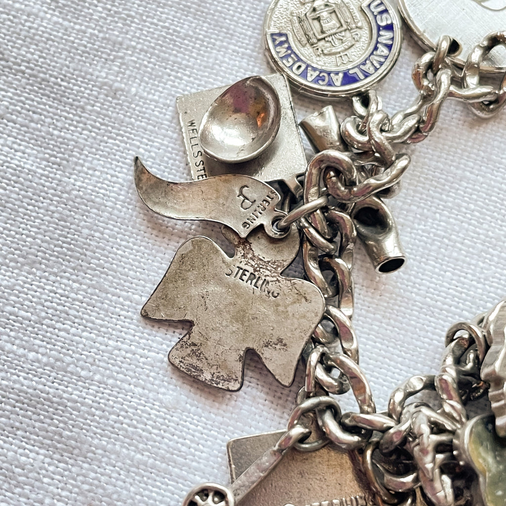 Vintage 12K white gold bracelet with assorted sterling silver charms including: