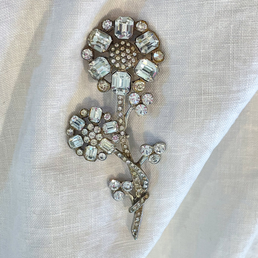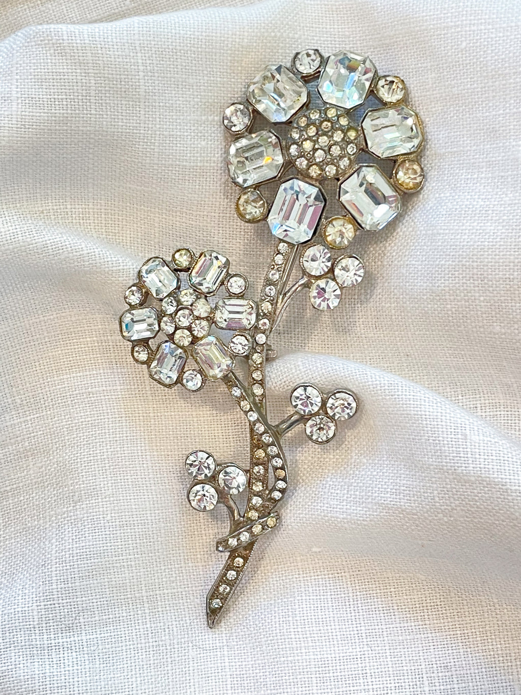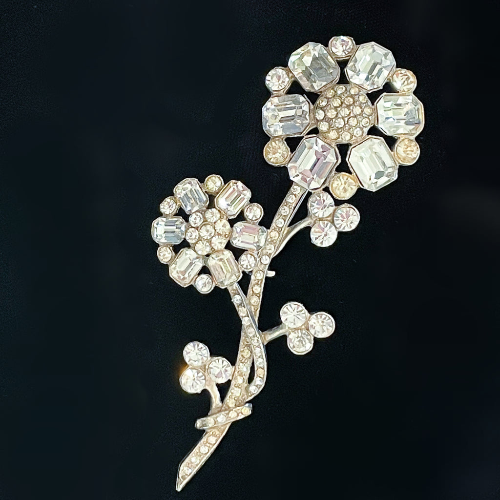 Clear rhinestones, silver tone setting, round and baguette shape stones.