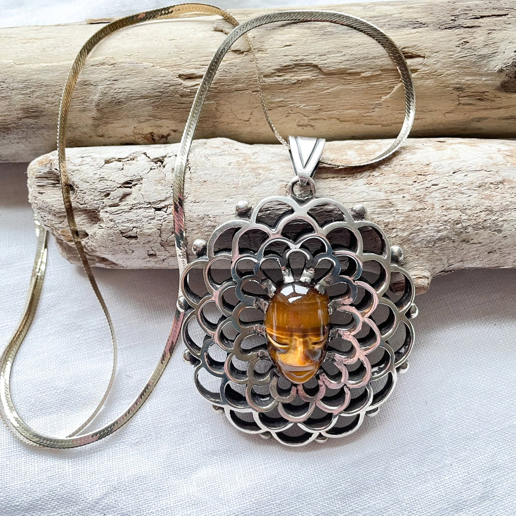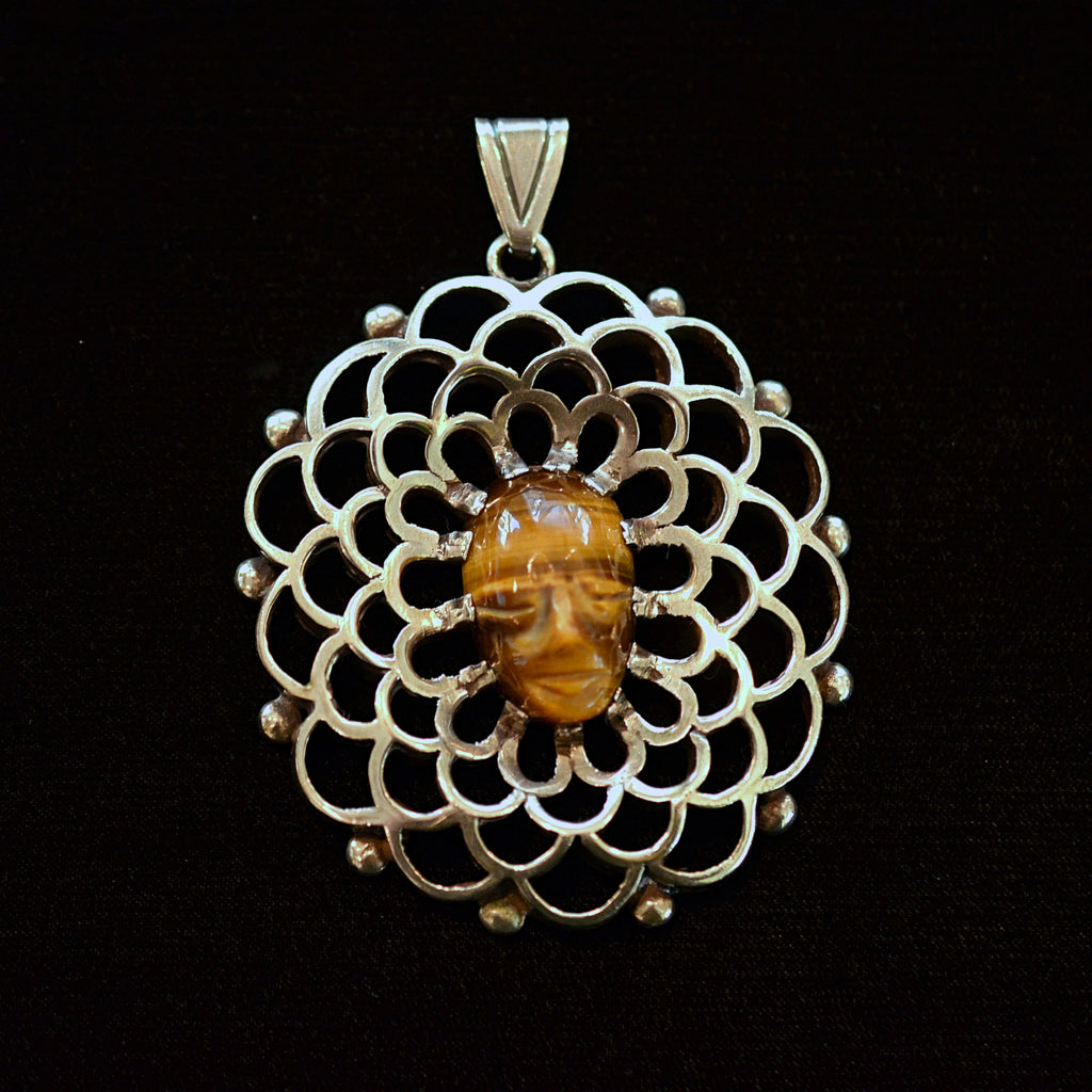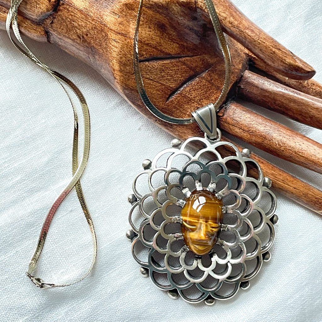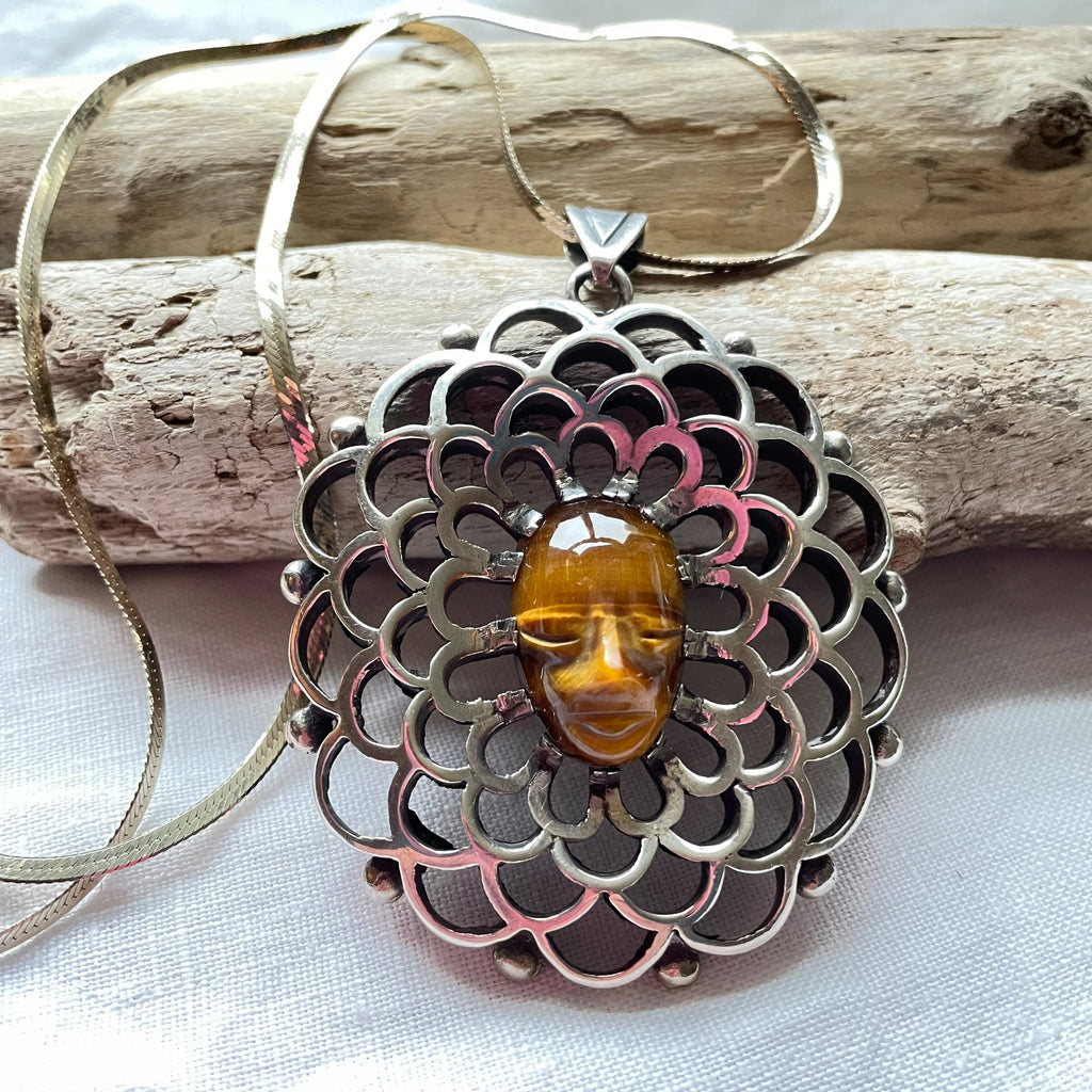 Gorgeous vintage sterling silver statement pendant with carved a tribal face in tiger eye stone.