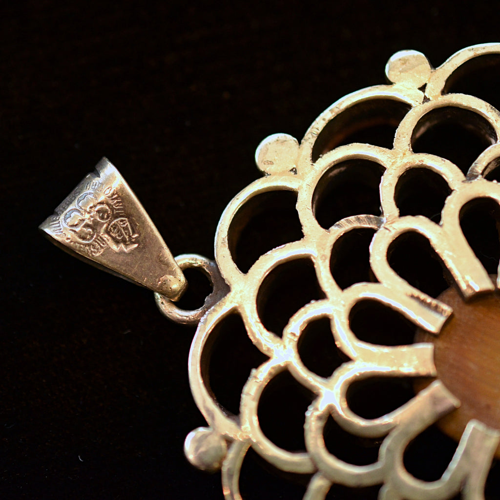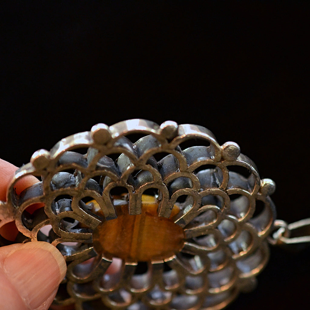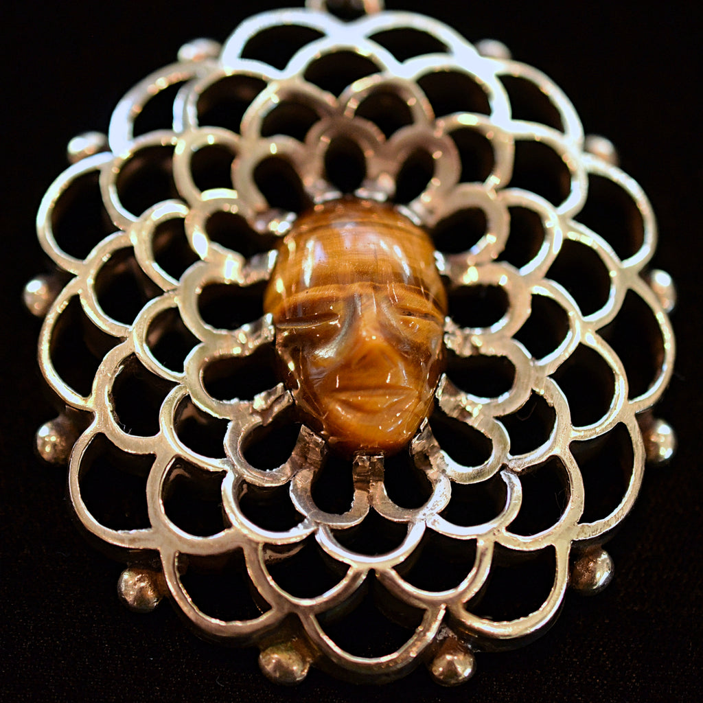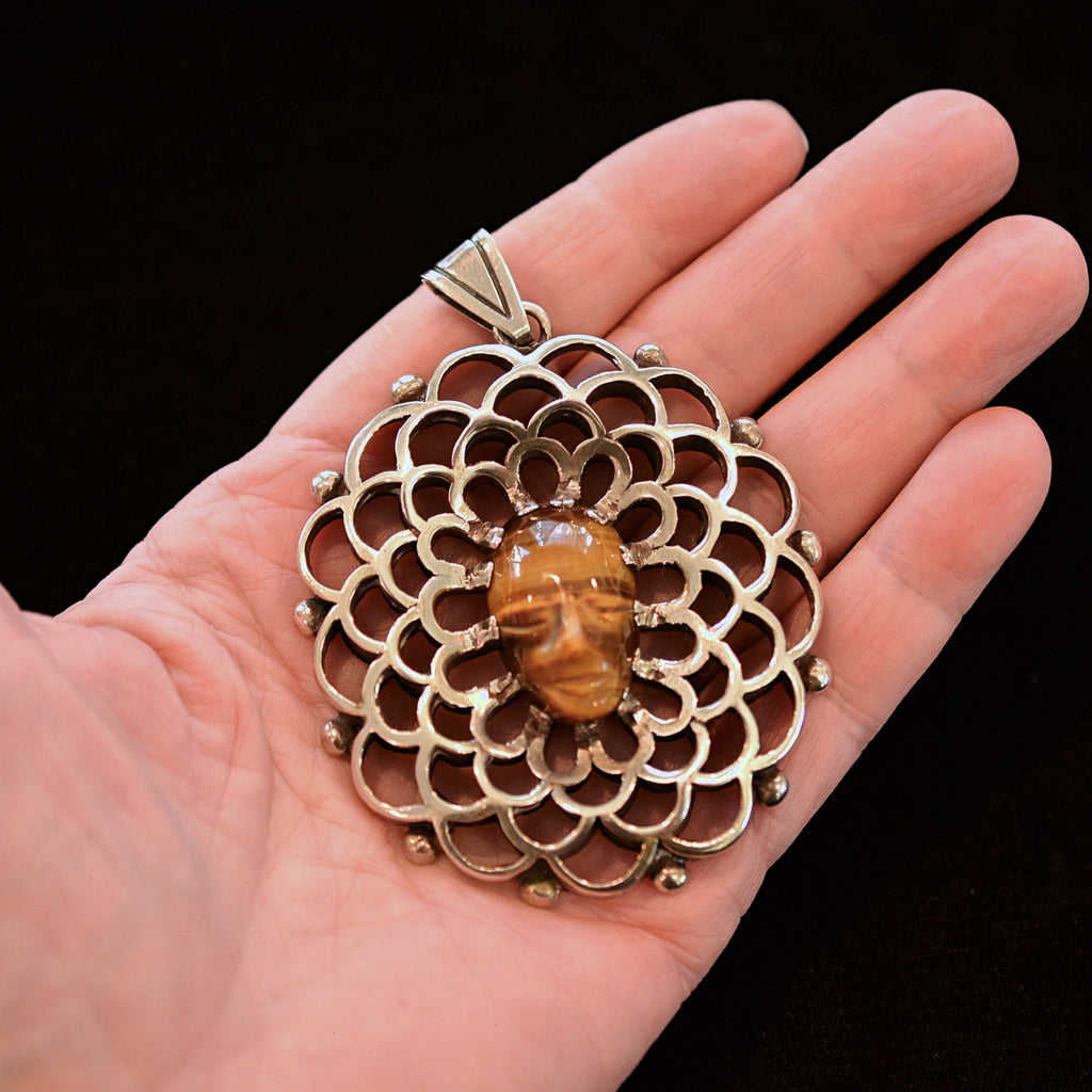 Gorgeous vintage sterling silver statement pendant with carved a tribal face in tiger eye stone.