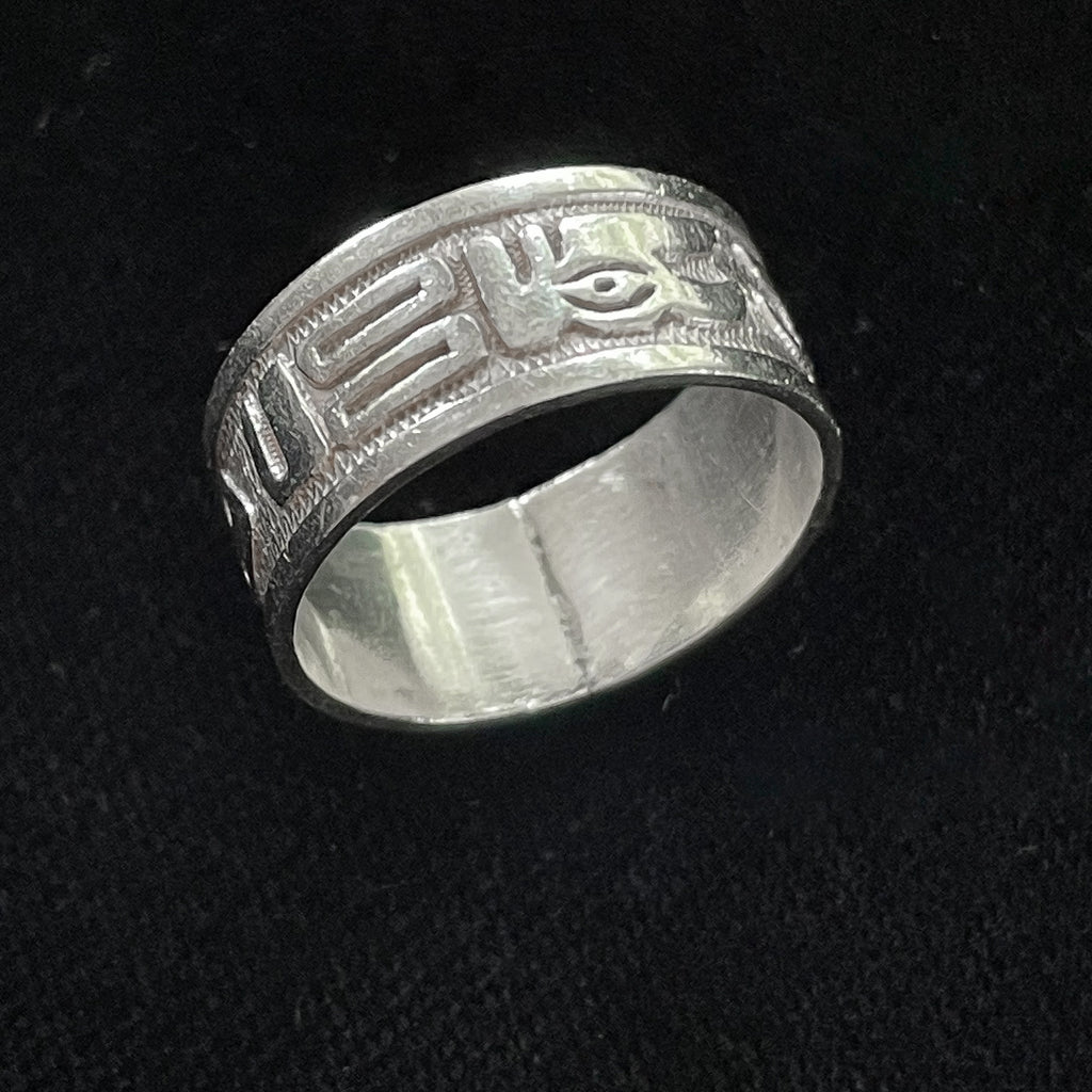 Vintage sterling silver band ring with all over southwestern Mayan pattern.