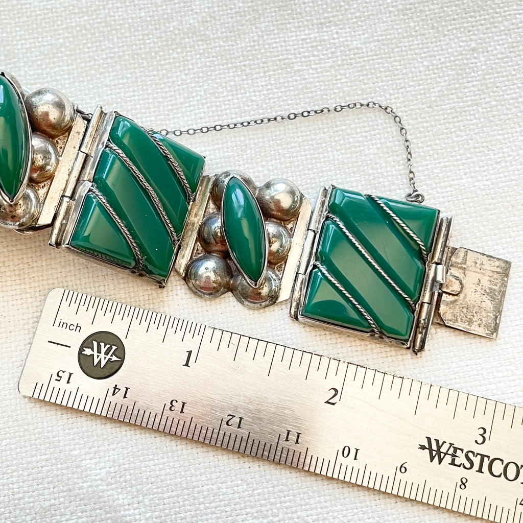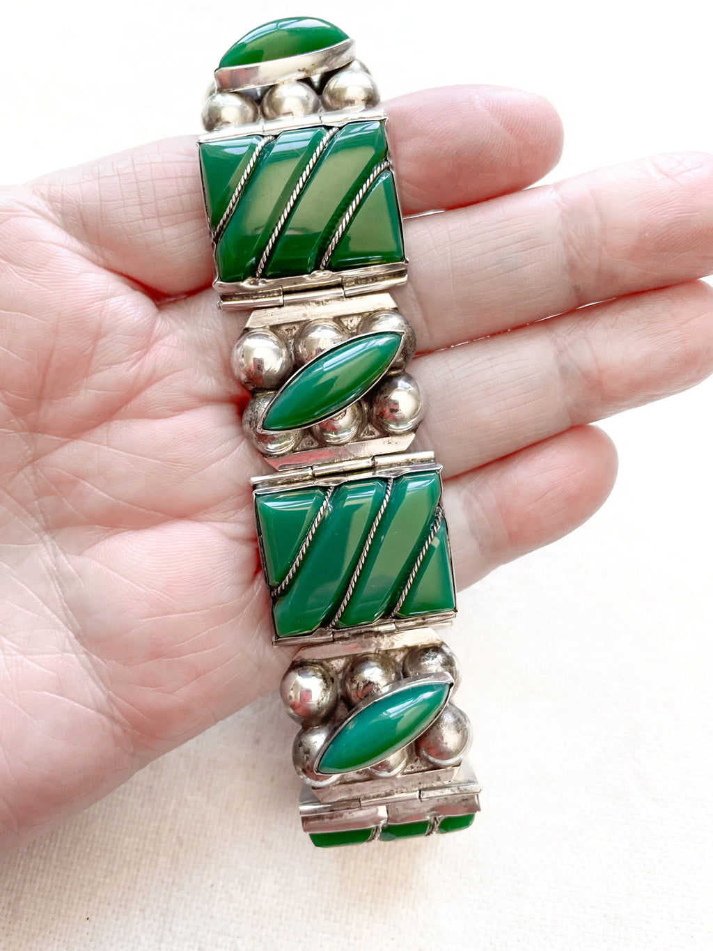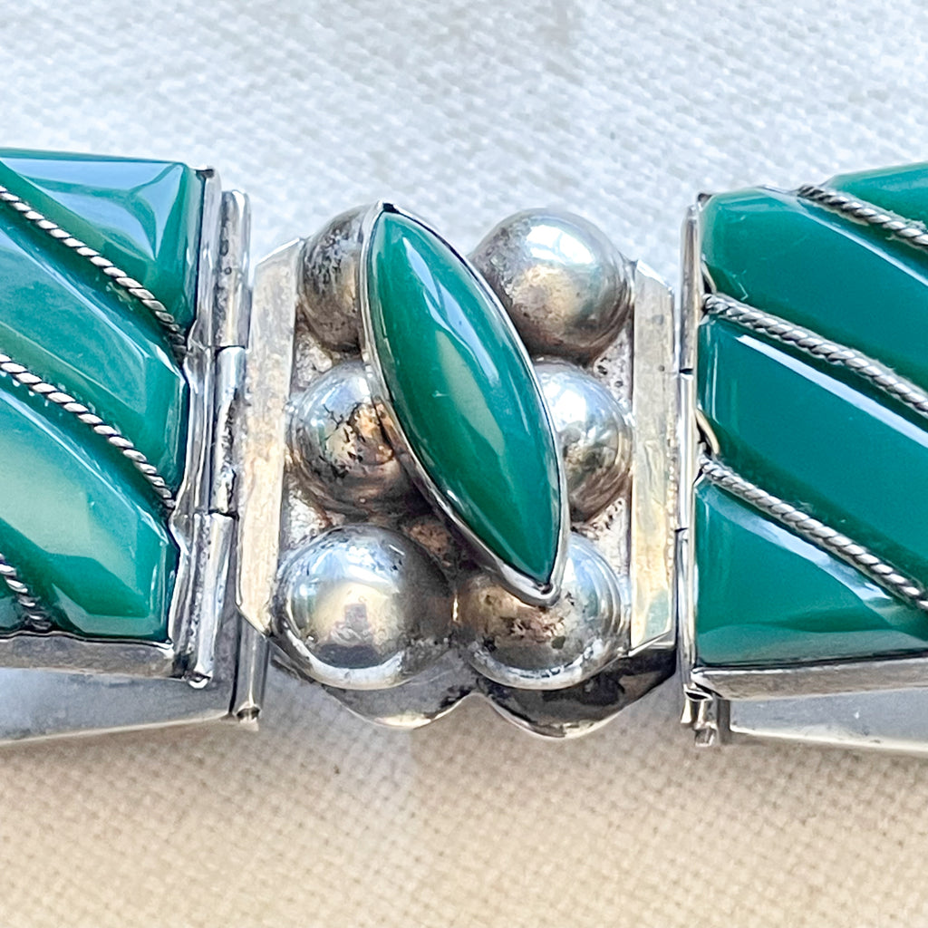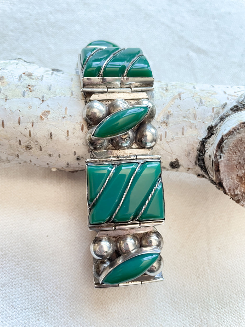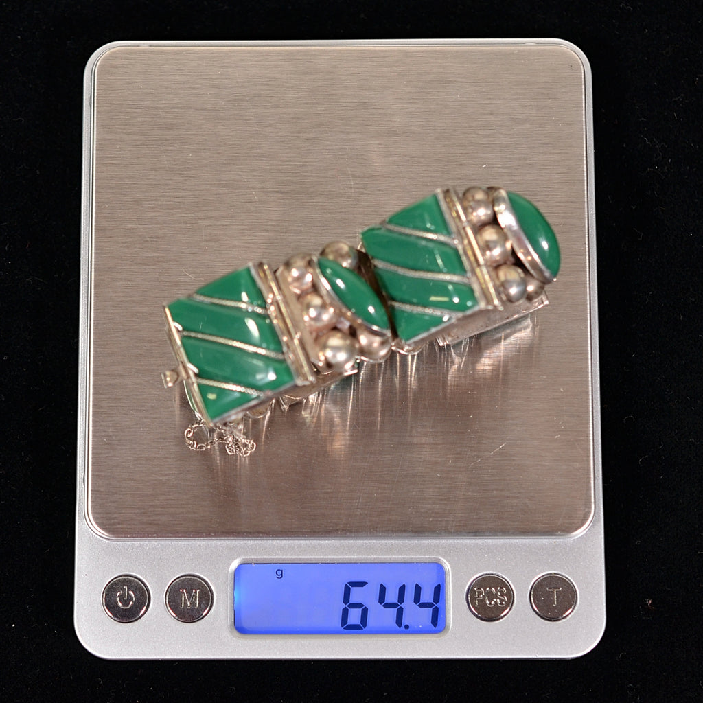 Vintage 40s Mexican 925 Sterling Silver Bracelet + Green Onyx Stones 64.4 Grams