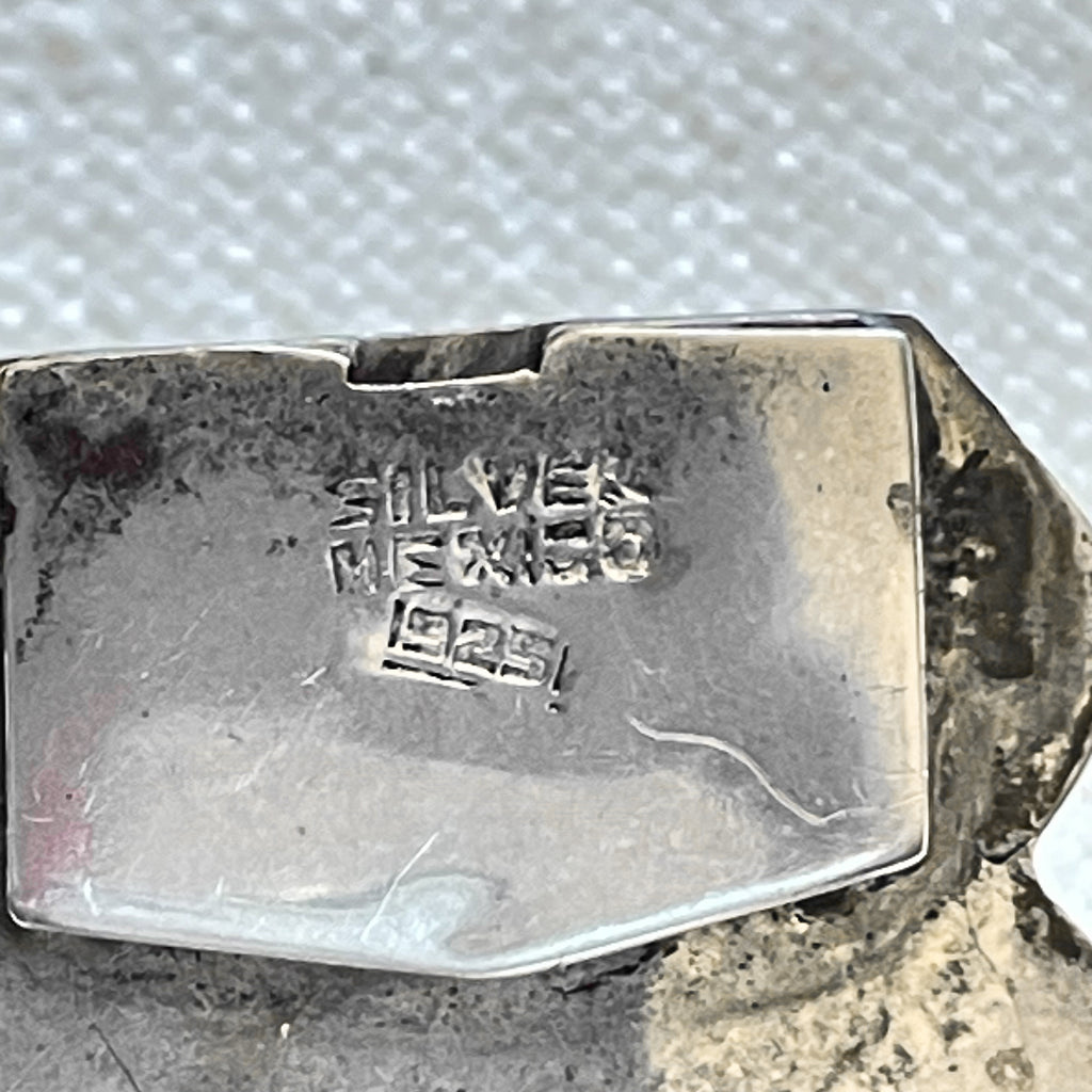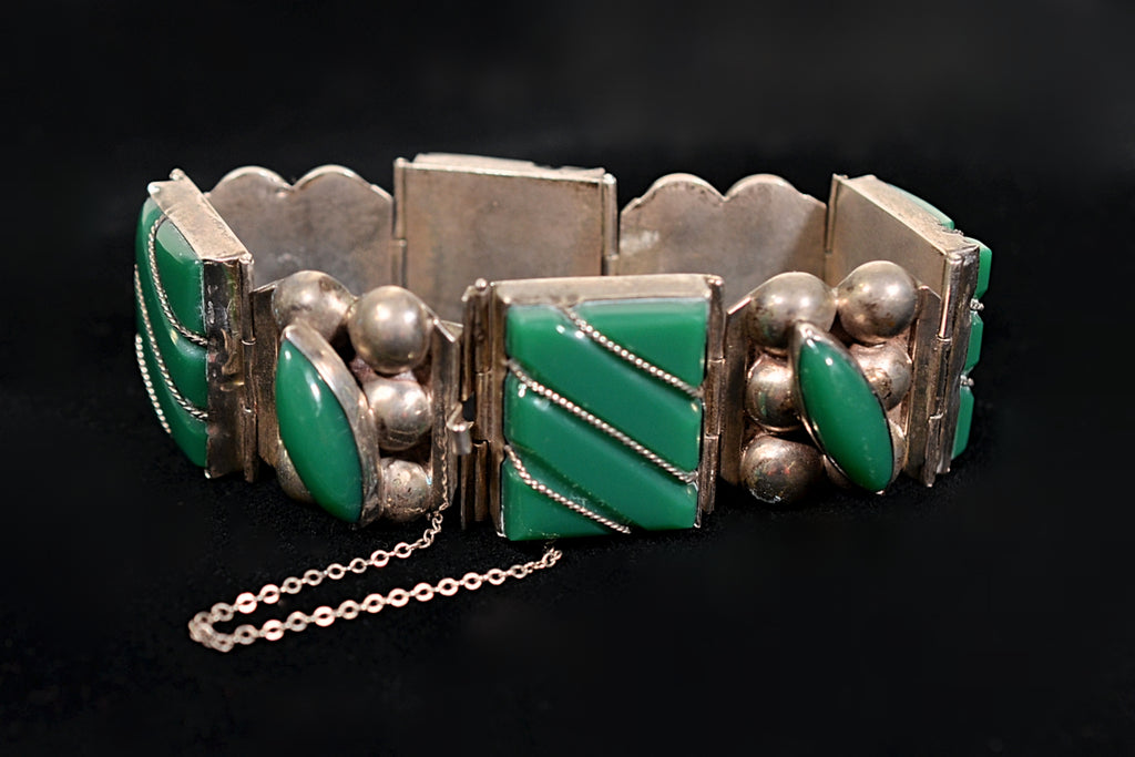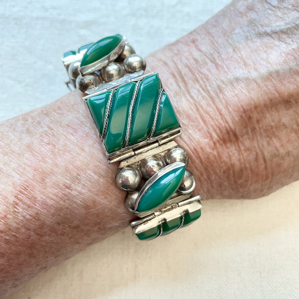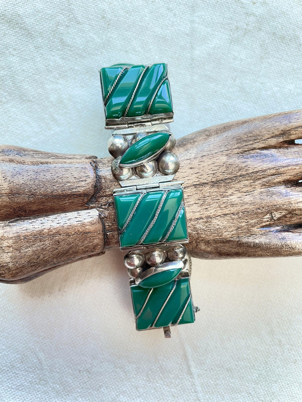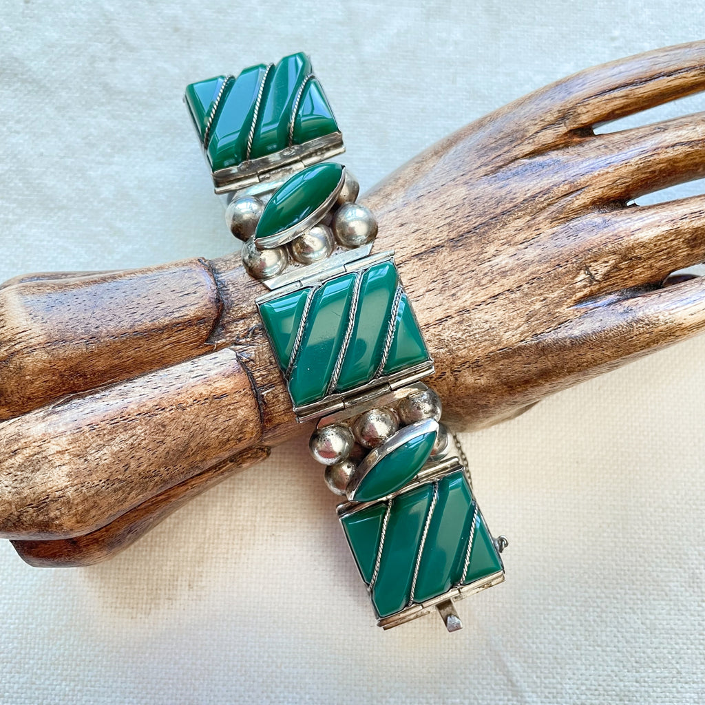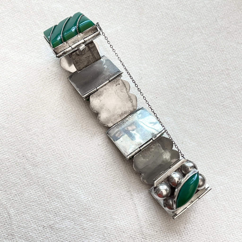 Vintage 40s Mexican 925 Sterling Silver Bracelet + Green Onyx Stones 64.4 Grams