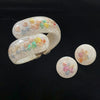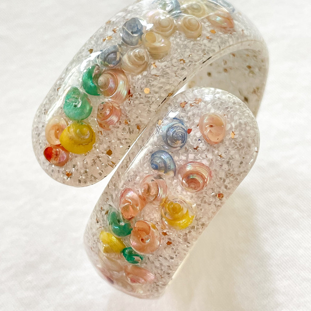 Clear Lucite & white confetti chip bracelet with pastel seashells and gold confetti.