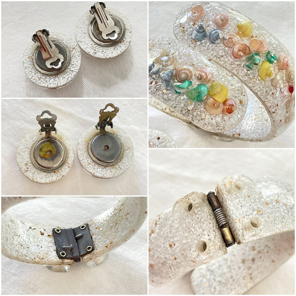Vintage 60s confetti Lucite seashell clamper bracelet and earrings set.