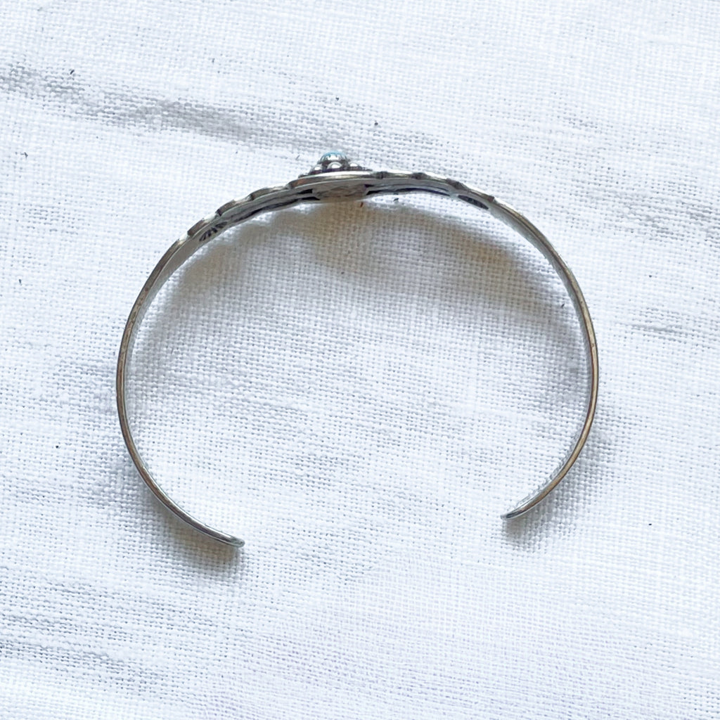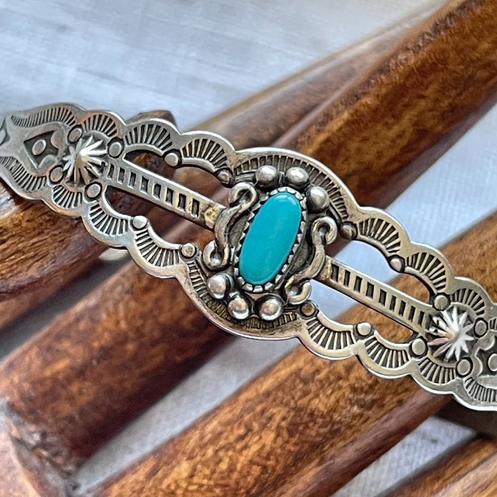 Bracelet is handmade, stamped with lovely Navajo design, small turquoise stone w/silver details surrounding.