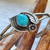 Bracelet is handmade, with swirls, leaf, flower and turquoise stone. Slim shank cuff.